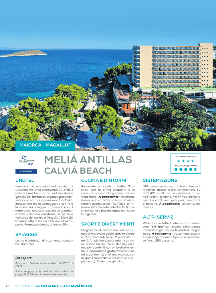 MAIORCA - Magalluf Meliá Antillas - GOLDEN - Calviá Beach HHHH Valutazione Settemari L’hotel Cucina e dintorni Sistemazione Fresco di una completa e radicale ristrutturazione nell’arco dell’inverno 2015/16, il noto Sol Antillas si stacca dal suo storico gemello Sol Barbados, e guadagna il passaggio al più prestigioso marchio Meliá. Incastonato tra la verdeggiante collina e la splendida spiaggia, in prima linea sul mare e con una spettacolare vista panoramica sulla baia antistante, sorge nelle vicinanze del centro di Magalluf. Dista 20 km dalla città di Palma e 25 km dall’aeroporto. Fermata autobus di linea a 50 m. Ristorante principale a buffet “Mosaico” per la prima colazione e la cena, con show cooking e terrazza con vista mare. A pagamento: ristorante italiano à la carte “Casa Nostra”, ristorante d’avanguardia “Pez Playa” all’interno dell’adiacente hotel Me Mallorca; snack bar alla piscina, tapas bar, lobby lounge bar. 316 camere in totale, dal design fresco e moderno, dotate di aria condizionata, TV LCD 42” satellitare con ricezione di canali italiani, telefono, Wi-Fi free, bollitore per tè e caffè, asciugacapelli, cassaforte e balcone. A pagamento: consumazioni minibar. Sport e divertimenti Wi-Fi free in tutto l’hotel, centro benessere “Yhi Spa” con piscina climatizzata, idromassaggio, sauna finlandese, bagno turco. A pagamento: trattamenti estetici e massaggi presso la Spa, sale conferenze fino a 350 persone. Spiaggia Lunga e sabbiosa, direttamente accessibile dall’hotel. Da sapere Assistenza Settemari disponibile dal 29/5 al 25/9. Programma di animazione internazionale che prevede giochi, attività diurne e intrattenimenti serali. Miniclub (5-12 anni). Ampie terrazze solarium con varie piscine (di cui una in stile laguna e una per bambini), con ombrelloni e lettini a disposizione gratuitamente (fino ad esaurimento) e teli mare su cauzione (per il cui cambio è richiesto un supplemento). Palestra e spinning. Scopri maggiori informazioni sulla struttura a pagg. 332-333 e sul sito www.settemari.it. 70 Categoria ufficiale SETTEMARISTAR Meliá Antillas Calviá Beach Altri servizi MELIÁ ANTILLAS Pernottamento + 1ª colazione Stagionalità 01/05–26/05 27/05–09/06 10/06–16/06 17/06–30/06 01/07–14/07 15/07–28/07 29/07–04/08 05/08–11/08 12/08–18/08 19/08–25/08 26/08–01/09 02/09–08/09 09/09–15/09 16/09–22/09 23/09–01/10 02/10–30/10 7 notti + volo a/r Suppl. a notte mezza pensione doppia uso singola Riduz. sogg. a notte SUPER START QUOTA START QUOTA BASE notte sogg. camera vista mare laterale camera vista mare frontale bamb. 2-12 – 560 590 675 815 880 995 1065 1105 965 825 810 745 645 – – – 630 660 755 925 990 1125 1190 1235 1065 925 915 850 725 – – – 718 755 864 1054 1130 1285 1360 1409 1218 1058 1043 971 831 – – 62 26 39 7 20 –31 73 26 39 7 20 –36 73 26 39 7 20 –36 88 26 65 7 20 –44 114 26 65 7 20 –57 114 26 65 7 20 –57 134 26 65 7 20 –67 134 26 65 7 20 –67 134 26 65 7 20 –67 108 26 65 7 20 –54 108 26 65 7 20 –54 108 26 65 7 20 –54 108 26 65 7 20 –54 88 26 39 7 20 –44 88 26 39 7 20 –44 62 26 39 7 20 –31 BEATI I PRIMI CONTRIBUTO AVVICINAMENTO CENTRO-SUD Le nostre offerte Soggiorno minimo: 5 notti. Occupazione camere: max 2 adulti + 1 bambino (culla inclusa). Supplementi volo (a tratta): preassegnazione posto (voli Meridiana) standard € 10, comfort € 30. Oneri da aggiungere alla quota di partecipazione: • <grassetto>Tasse aeroportuali, oneri di trasporto e polizza protezione “Basic”</grassetto> (informazioni a pagg. 338 e 345) a partire da € 58,90: importi dettagliati a pag. 57; • Carbon tax ed eventuale adeguamento carburante/valutario (importi variabili, dettagli a pag. 338); • Quota individuale di gestione pratica (dettagli a pag. 338): € 77 (trasporto + soggiorno), € 25 (solo soggiorno). Viaggi di nozze riduzione del 10% sull’importo delle notti soggiorno, bottiglia di vino e frutta in camera all’arrivo. Tutte le condizioni di applicabilità delle promozioni e delle offerte a pagg. 336-337. Spagna Maiorca - Magalluf 71