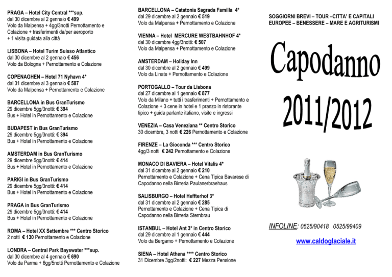 PRAGA – Hotel City Central ***sup. dal 30 dicembre al 2 gennaio € 499 Volo da Malpensa + 4gg/3notti Pernottamento e Colazione + trasferimenti da/per aeroporto + 1 visita guidata alla città LISBONA – Hotel Turim Suisso Atlantico dal 30 dicembre al 2 gennaio € 456 Volo da Bologna + Pernottamento e Colazione COPENAGHEN – Hotel 71 Nyhavn 4* dal 31 dicembre al 3 gennaio € 587 Volo da Malpensa + Pernottamento e Colazione BARCELLONA in Bus GranTurismo 29 dicembre 5gg/3notti: € 394 Bus + Hotel in Pernottamento e Colazione BUDAPEST in Bus GranTurismo 29 dicembre 5gg/3notti: € 394 Bus + Hotel in Pernottamento e Colazione AMSTERDAM in Bus GranTurismo 29 dicembre 5gg/3notti: € 414 Bus + Hotel in Pernottamento e Colazione PARIGI in Bus GranTurismo 29 dicembre 5gg/3notti: € 414 Bus + Hotel in Pernottamento e Colazione PRAGA in Bus GranTurismo 29 dicembre 5gg/3notti: € 414 Bus + Hotel in Pernottamento e Colazione BARCELLONA – Catatonia Sagrada Familla 4* dal 29 dicembre al 2 gennaio € 519 Volo da Malpensa + Pernottamento e Colazione SOGGIORNI BREVI – TOUR –CITTA’ E CAPITALI EUROPEE – BENESSERE – MARE E AGRITURISMI VIENNA – Hotel MERCURE WESTBAHNHOF 4* dal 30 dicembre 4gg/3notti: € 507 Volo da Malpensa + Pernottamento e Colazione AMSTERDAM – Holiday Inn dal 30 dicembre al 2 gennaio € 499 Volo da Linate + Pernottamento e Colazione PORTOGALLO – Tour da Lisbona dal 27 dicembre al 1 gennaio € 877 Volo da Milano + tutti i trasferimenti + Pernottamento e Colazione + 3 cene in hotel e 1 pranzo in ristorante tipico + guida parlante italiano, visite e ingressi VENEZIA – Casa Veneziana ** Centro Storico 30 dicembre, 3 notti € 226 Pernottamento e Colazione FIRENZE – La Gioconda *** Centro Storico 4gg/3 notti € 242 Pernottamento e Colazione MONACO DI BAVIERA – Hotel Vitalis 4* dal 31 dicembre al 2 gennaio € 210 Pernottamento e Colazione + Cena Tipica Bavarese di Capodanno nella Birreria Paulanerbraehaus SALISBURGO – Hotel Heffterhof 3* dal 31 dicembre al 2 gennaio € 285 Pernottamento e Colazione + Cena Tipica di Capodanno nella Birreria Sternbrau ROMA – Hotel XX Settembre *** Centro Storico 2 notti € 130 Pernottamento e Colazione ISTANBUL – Hotel Ant 3* in Centro Storico dal 29 dicembre al 1 gennaio € 444 Volo da Bergamo + Pernottamento e Colazione LONDRA – Central Park Bayswater ***sup. dal 30 dicembre al 4 gennaio € 690 Volo da Parma + 6gg/5notti Pernottamento e Colazione SIENA – Hotel Athena **** Centro Storico 31 Dicembre 3gg/2notti: € 227 Mezza Pensione INFOLINE: 0525/90418 0525/99409 www.caldoglaciale.it ROMANIA – Tour in pensione completa dal 30 dicembre al 2 gennaio € 625 Volo da Rimini + tutti i trasferimenti + hotel 3 stelle + guida parlante italiano, visite e ingressi PUGLIA - Tour Matera,Alberobello,Lecce,Cerrate dal 30 dicembre al 2 gennaio € 750 Bus + Pensione Completa con Bevande + Hotel 4 Stelle + guida locale + Cenone con Veglione MAROCCO – Tour delle Città Imperiali dal 31 dicembre 8gg/7notti Mezza Pensione: € 980 Volo da Malpensa o Bologna + tutti i trasferimenti Hotel ¾* + guida parlante italiano, visite e ingressi MAROCCO – Marrakech con Tour dal 29 dicembre 4gg/3notti hotel 4 stelle: € 966 Volo da Malpensa o Bologna + tutti i trasferimenti + Cenone di Capodanno + guida parlante italiano TUNISIA – Hammamet All Inclusive 4* dal 30 dicembre 4gg/3notti Hotel Miramar: € 409 Volo da Malpensa + tutti i trasferimenti PELLEGRINAGGIO in TERRA SANTA dal 26 dicembre 8gg/7notti hotel 4 stelle: € 1473 Volo da Malpensa + tutti i trasferimenti + Radio guida con auricolare e ingressi come da programma SALERNO – Luci d’Artista Concorso Fotografico Dal 30 dicembre 4gg/3notti hotel 3 stelle: € 389 Volo da Malpensa + Pernottamento e colazione + 1 cena tipica + partecipazione Gratis al Concorso ISCHIA – Terme Gran Paradiso **** 3 notti € 349, 4 notti € 399, 5 notti € 449 Mezza Pensione + Cenone con Spumante + Sauna,Bagno Turco + 1 Maschera al Fango ISCHIA – Grand Hotel Terme di Augusto ***** 4 notti € 544 , 7 notti € 859, Pensione Completa + Cenone/Veglione +Terme+Sauna, Bagno Turco, Percorso Kneipp + Prova Benessere a Scelta NEVE – FRIULI – Forni di Sopra Hotel i Larici 4* 30 dicembre, 4gg/3 notti: Mezza Pensione: € 295 Cenone di Capodanno € 60 in loco Toscana, VAL D’ELSA – Capodanno in Villa 2 notti in mezza pensione in camera superior + cenone di san silvestro + brunch del 1 gennaio: € 280 Toscana, Capodanno Agriturismo nel Chianti 2 notti in mezza pensione + cenone di san silvestro con bevande + Aperitivo con Vini, Cena/ Degustazione Prodotti Tipici della Fattoria: € 278 NEVE, MAZZIN DI FASSA – Hotel Alpen Rose *** 5gg/4 notti € 434 Mezza Pensione + Cenone Toscana, Capodanno Medievale in Fattoria 1 notte + cena medievale con festa + prima colazione + visita percorso storico fattoria: € 165 NEVE, PASSO DEL TONALE – Hotel Pian di Neve *** 5gg/4 notti € 519 Pensione Completa con Bevande + Cenone con musica Toscana, VOLTERRA Capodanno in Caseificio 3 notti + mezza pensione + cenone di fine anno con musica dal vivo: € 340 NEVE, SKI AREA PAGANELLA, a Molveno Hotel 3* 29 Dicembre 4 notti € 368 Mezza Pensione +Cenone + SkiBus Gratuito per gli impianti di Andalo Toscana, PESCIA Capodanno da Pinocchio 2 notti in agriturismo ex cartiera in pernottamento e colazione + cenone di fine anno con bevande e animazione + 1 cena senza bevande: € 249 NEVE, FOLGARIDA – MirtilloRosso App.(sulle piste) Dal 26 dicembre 7 notti € 287,50 (base 4 pax) NEVE, VAL DI NON – Hotel Punto Verde *** 4gg/3notti in pernottamento e colazione + festa fine anno sulle piste: € 232 Toscana, ARITURISMO LUCCA 2 notti Mezza Pensione*+Cenone* con bevande*: € 212 Le quote sono: TUTTE PER PERSONA IN CAMERA DOPPIA (2^ Edizione Volantino aggiornata al 7/12/11) NEVE, MERANO – Hotel Wiesenhof **** 5gg/4notti in mezza pensione + cenone + centro benessere con piscina: € 498 SAN VINCENZO – Wellness