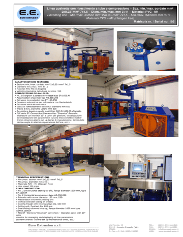 Linea guainette con rivestimento a tubo e compressione – Sez. min./max. cordato mm² 2x0,22÷mm² 7x1,5 – Diam. min./max. mm 3÷11 – Materiali PVC –M1 Sheathing line – Min./max. section mm² 2x0,22÷mm² 7x1,5 – Min./max. diameter mm 3÷11 – Materials PVC – M1 (Halogen free) Matricola nr. / Serial no. 105 5/A#767&#;'#778&9778:& 537'#767&779 5!'<+! <#= 5<#'H7';<<<7'67 5-/?#<='#>#'<7#'#AA''>#/ ! 5%7%<'##AA#'<'>#1 5'%#'7#><''># 3 53#'#?#<%7'#>#<#A##!'C'B 5'%#?'<#%#' 5;"";;7'##?;7'#77 5#;'#;7'#?#<#77D 5??#<='#;#>>#><<7#C<'>#/!3 !""'# 5/:#?''#/7'>#F/7G<<# 1>'##7#'# G#<#>='#?%<AAA# ;7>#'A#;>7';'%''<<#''#+''+ ';;7+<<7+'%>+'7>;7%'A#+'7>;<< 7>+#=<;<<7+7>#'A#;<<I# 5!67&'#778&9778:& 5!67&;7'779 5!'<! ,<#=" 5>;7>7 5-#3?>#'<';>@+#"""<=;7' 77'@> / ! 5-#,#A#'<%7%<'#'@>1 5&'%;*'B*;7' 773 5!'C'B?#<%7';#=%' 5'<&'%;<;=#*B< 5##<='#%=B*'B'%>%<<@;77 5%<<=%'"<@*B<;D77 53%<<;=#<%7'E+%>"<=;7' 77'@> /!3 ! 5/:/7F/7G#?'1>'#><*'B G #<# 7#'#"#7==;;><@=<<<>7' ;@7';+<7+'%>+7''7' +++++++++++++++++++++++++++++++++++++++++++++++++++++++++++++++++++++++++++++++++++++++++++++++++++++ !,-!-../!-.-01!!.!1/ !,-.2-3/2/!/.4)).-3,.!1/!./1-0)/ !"#$%#&'%#' () ***%#&'%#'