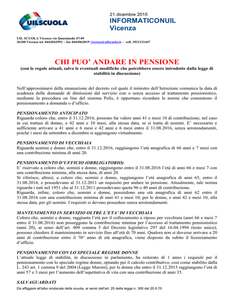 21 dicembre 2015 INFORMATICONUIL Vicenza UIL SCUOLA Vicenza via Quasimodo 47/49 36100 Vicenza tel. 0444562992 – fax 0444962819 [email protected] – cell. 3931121447 CHI PUO’ ANDARE IN PENSIONE (con le regole attuali, salvo le eventuali modifiche che potrebbero essere introdotte dalla legge di stabilità in discussione) Nell’approssimarsi della emanazione del decreto col quale il ministro dell’Istruzione comunica la data di scadenza delle domande di dimissioni dal servizio con o senza accesso al trattamento pensionistico, mediante la procedura on line del sistema Polis, è opportuno ricordare le norme che consentono il pensionamento a domanda o d’ufficio. PENSIONAMENTO ANTICIPATO Riguarda coloro che, entro il 31.12.2016, possono far valere anni 41 e mesi 10 di contribuzione, nel caso in cui trattasi di donne, e 42 anni e 10 mesi, alla stessa data, se si tratta di uomini. E’ necessario e sufficiente arrivare a 41 anni e 6 mesi e 42 anni e 6 mesi entro il 31.08.2016, senza arrotondamenti, poiché i mesi da settembre a dicembre si aggiungono virtualmente. PENSIONAMENTO DI VECCHIAIA Riguarda uomini e donne che, entro il 31.12.2016, raggiungono l’età anagrafica di 66 anni e 7 mesi con una contribuzione minima di anni 20. PENSIONAMENTO D’UFFICIO (OBBLIGATORIO) E’ riservato a coloro che, uomini e donne, raggiungono entro il 31.08.2016 l’età di anni 66 e mesi 7 con una contribuzione minima, alla stessa data, di anni 20. Si riferisce, altresì, a coloro che, uomini e donne, raggiungono l’età anagrafica di anni 65, entro il 31.08.2016, e possedevano al 31.12.2011 un requisito per andare in pensione. Attualmente, tale norma riguarda i nati nel 1951 che al 31.12.2011 possedevano quota 96 o 40 anni di contribuzione. Riguarda, infine, coloro che, uomini e donne, possiedono una età anagrafica di anni 62 entro il 31.08.2016 con una contribuzione minima di anni 41 e mesi 10, per le donne, e anni 42 e mesi 10, alla stessa data, per gli uomini. I requisiti si devono possedere senza arrotondamenti. MANTENIMENTO IN SERVIZIO OLTRE L’ETA’ DI VECCHIAIA Coloro che, uomini e donne, raggiunta l’età per il collocamento a riposo per vecchiaia (anni 66 e mesi 7 entro il 31.08.2016) non posseggono la contribuzione minima per l’accesso al trattamento pensionistico (anni 20), ai sensi dell’art. 409 comma 5 del Decreto legislativo 297 del 16.04.1994 (testo unico), possono chiedere il mantenimento in servizio fino all’età di 70 anni. Qualora non si dovesse arrivare a 20 anni di contribuzione entro il 70° anno di età anagrafica, viene disposto da subito il licenziamento d’ufficio. PENSIONAMENTO CON LO SPECIALE REGIME DONNE L’attuale legge di stabilità, in discussione in parlamento, ha reiterato di 1 anno i requisiti per il pensionamento con lo speciale regime donne, optando per il calcolo contributivo, così come stabilito dalla L. 243 art. 1 comma 9 del 2004 (Legge Maroni), per le donne che entro il 31.12.2015 raggiungono l’età di anni 57 e 3 mesi per l’aumento dell’aspettativa di vita con una contribuzione di anni 35. SALVAGUARDATI Da affiggere all'albo sindacale della scuola, ai sensi dell'art. 25 della legge n. 300 del 20.5.70 L’attuale legge di stabilità ha riproposto il pensionamento per 2.000 unità di personale, con le regole ante Fornero, per coloro che nell’anno 2011 hanno fruito di assistenza a “figli disabili in situazione di gravità”, ai sensi dell’art. 42 del decreto legislativo n° 151 del 26.03.2001. In tal caso i requisiti pre Fornero riguardano “quota 97 e 3 mesi”, con un’età minima di 61 e 3 mesi ed una contribuzione minima di anni 35, nonché con un mix tra età anagrafica e contributiva. Es.: anni 61 e 10 mesi e contribuzione di 35 e 5 mesi. La somma dà 97 e 3 mesi. Recentemente, sono stati ripescati anche coloro che avevano presentato domanda di pensionamento con la quarta e sesta salvaguardia, rispettivamente D.L.vo 102/2013 e D.L.vo 147/2014. EROGAZIONE DELLA BUONUSCITA PER I PENSIONANDI Si ricorda che il trattamento di fine rapporto è salario differito che i pensionandi aspettano, giustamente, per realizzare qualche progetto tenuto nel cassetto. PERSONALE COLLOCATO A RIPOSO PER INABILITA' Per tale personale, la erogazione del TFS avviene nell'arco di 105 giorni. Lo stesso periodo di tempo vale per i superstiti dei lavoratori deceduti. PERSONALE COLLOCATO A RIPOSO COI REQUISITI AL 31.12.2011 Coloro che, possedendo i requisiti entro il 31.12.2011 della Legge pre - Fornero (attualmente quota 96 e 40 anni di contribuzione) vengono collocati a riposo d'ufficio al compimento del 65° anno di età, percepiranno il TFS entro 9 mesi dal pensionamento, con un tetto di € 90.000,00 lordi, come prima rata, e la parte eccedente e fino a 150.000,00 euro lordi nell'anno successivo e nel successivo ancora per l'eccedenza dei 150.000,00 euro lordi. PERSONALE COLLOCATO A RIPOSO PER RAGGIUNTI LIMITI DI ETA' (ANNI 66 E MESI 7) Tale personale percepirà il TFS entro 15 mesi (12 mesi canonici e 3 di lavorazione), con un tetto per la prima rata di € 50.000,00 lordi e, per la parte eccedente e fino a euro 100.000,00, nell'anno successivo e nel successivo ancora per l'eccedenza superiore ai 100.000,00 lordi. PERSONALE DIMISSIONARIO Coloro che, dimessi volontariamente dal servizio per accedere al trattamento pensionistico o solamente per abbandonare la scuola senza accedere alla pensione, riceveranno il TFS entro 27 mesi (24 mesi canonici e 3 di lavorazione), con un tetto per la prima rata di € 50.000,00 lordi e, per la parte eccedente e fino a 100.000,00 lordi, nell'anno successivo e nel successivo ancora per l'eccedenza oltre € 100.000,00. PERSONALE ISCRITTO AL FONDO SCUOLA ESPERO Coloro che, a suo tempo, hanno aderito al Fondo scuola Espero, optando per il TFR, collocati a riposo per uno dei motivi sopra indicati, dal 1° di settembre, dovranno fare richiesta al Fondo per ricevere o il vitalizio, oppure la liquidazione di tutto ciò che è 