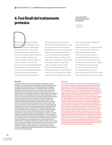 P corso di protesi - La riabilitazione a supporto osteo-mucoso 6. Fasi finali del trattamento protesico D 84 ildentistamoderno novembre 2009 • Ugo Torquati Gritti1 Armando Buongiovanni2 Giancarlo Riva2 1 2 Odontoiatra Odontotecnico Durante la fase di prova del manufatto da un’inadeguata posizione del margine l’usura dentale naturale, essi appariranno protesico, si preferisce intrattenere con il gengivale e dalla riflessione della luce su una chiaramente «artificiali». paziente una breve conversazione, posti non corretta rifinitura del corpo protesico. Molando leggermente i margini incisali degli a una certa distanza al fine di osservare Spostare l’attenzione unicamente sulla scelta incisivi superiori e inferiori, si ottiene un l’integrazione dei denti in rapporto alla del dente e sulla sua disposizione, senza aspetto maggiormente mimetico. fisionomia del soggetto. Sarebbe opportuno, curare la morfologia dentale e gengivale, Più anziano è il paziente, più rilevanti in questo passaggio, soffermarsi sulla può vanificare lo sforzo compiuto al fine di sono gli effetti dell’attrito. In ogni modo, posizione del labbro superiore e inferiore, in raggiungere un apprezzabile risultato estetico. per valutare l’usura dentale, il sistema più posizione di riposo e in fase dinamica. Con il passare degli anni, i margini degli semplice è osservare attentamente i soggetti Spesso sono visibili aree di gengiva artificiale; incisivi, sia superiori sia inferiori, vanno con dentatura naturale; un preventivo di conseguenza, non si deve sottovalutare incontro a modificazioni determinate accordo con il paziente consente una l’importanza di una modellazione gengivale dall’usura delle superfici. Diverse tipologie di personalizzazione di forma e croma. che dia l’impressione della naturalezza. denti in commercio presentano un margine Da non trascurare l’estetica rosa: con il tempo, Un bel sorriso può essere compromesso regolare e uniforme e, qualora non si simuli i denti vanno incontro a retrazione gengivale Riassunto Summary La prevalenza delle ricostruzioni protesiche presenta una disposizione dentale stereotipata e, di conseguenza, anche l’aspetto finale risulta tale. È possibile ottenere un risultato molto più personalizzato e naturale utilizzando fattori d’irregolarità e una disposizione asimmetrica dei denti; va in ogni modo rilevato che la richiesta del paziente è sempre più orientata verso una cromacità chiara e un allineamento regolare dei denti. È possibile, da parte del team protesico, rendere dinamica, con semplici modifiche, una composizione simmetrica. I margini degli incisivi, nei soggetti dentati, vanno incontro a modificazioni determinate dall’usura delle superfici: anche senza creare marcate faccette di abrasione, la ricostruzione appare molto più naturale se la forma arrotondata dei bordi incisivi dei denti artificiali viene leggermente modificata. Inoltre, previo accordo con il paziente, è possibile rendere il sorriso conforme all’età del soggetto da riabilitare modificandone la cromacità. La nostra attenzione sarà rivolta ai quei pazienti che presentano una «linea del sorriso» alta: dato che in questo caso, durante la dinamica del sorriso, oltre a scoprire interamente la quota dentale si verifica anche un’esposizione gengivale. Le protesi appaiono più naturali se la gengiva segue un decorso lievemente irregolare; di conseguenza, si deve dedicare particolare cura alla collocazione, a un’adeguata altezza, del margine cervicale, onde evitare un effetto di innaturale perfezione. Con il tempo, i denti vanno incontro a retrazione gengivale. Una protesi appare più naturale se il margine gengivale è modellato conformemente all’età del paziente. In questa situazione, al fine di rendere più attraente l’esposizione, è utile modificare la cromaticità della resina rosa e personalizzarla in base alle caratteristiche somatiche del paziente. Il protocollo di lavoro non termina con la consegna delle protesi: la delicata interazione tra un manufatto rigido e un ambiente caratterizzato da strutture muscolari e osteo-mucose, induce un ovvio quanto soggettivo periodo di adattamento che rientra nel «controllo periodico del paziente». In genere, dopo circa un mese, si preferisce verificare in articolatore le ricostruzioni dopo un adeguato rimontaggio, durante questa fase saranno ricontrollati tutti i presupposti occlusali della tecnica di Gerber, per rispettare la staticità del manufatto protesico. The prevalence of prosthetic reconstructions presents a stereotyped dental order and, of course, a correlated aspect. Although, it is possible to obtain individuality and naturalness by using an asymmetrical order of teeth and some irregularity factors. However, it must be considered that the demand of the patient is about a light shade and alignment of teeth. The prosthetic team is able to get a dynamism out of a symmetric composition through simple modifications. For example, incisors margin in toothed people show some modifications due to usury of tooth surface. Without creating any real factor of abrasion, the reconstruction seems more natural by modifying rounded shape of incisors margin in artificial teeth. Moreover, according to the agreement with the patient, it is possible to modify the shade to make the smile pursuant to the age of the patient. We focus our attention on patients with an high-line of smile, because in this case there is a double exposure of the gum and the set of teeth, during smiling. The partial denture looks more natural if gum follows an irregular line. Consequently a right placement of the gum must be carefully considered, to obviate an unnatural perfection. The teeth run into retraction of the gum. Moreover, prosthesis looks more natural if the border of gum is moulded according on the age of the patient. It is useful, in this situation, for the exposure to make more attractive, to modify the colour of the pink resin to indi