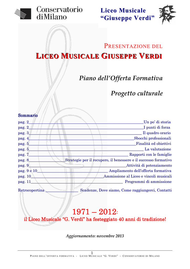 Liceo Musicale “Giuseppe Verdi” P RESENTAZIONE DEL LICEO MUSICALE GIUSEPPE VERDI Piano dell’Offerta Formativa Progetto culturale Sommario pag. 2____________________________________________________________Un po’ di storia pag. 2____________________________________________________________I punti di forza pag. 3___________________________________________________________ Il quadro orario pag. 4_______________________________________________________Sbocchi professionali pag. 5________________________________________________________Finalità ed obiettivi pag. 5____________________________________________________________ La valutazione pag. 7____________________________________________________ Rapporti con le famiglie pag. 8___________________Strategie per il recupero, il benessere e il successo formativo pag. 9___________________________________________________Attività di potenziamento pag. 9 e 10_____________________________________ Ampliamento dell’offerta formativa pag. 10______________________________________Ammissione al Liceo e vincoli musicali pag. 11________________________________________________ Programmi di ammissione Retrocopertina _________________ Scadenze, Dove siamo, Come raggiungerci, Contatti 1971 – 2012 2012: il Liceo Musicale “G. Verdi” ha festeggia festeggiato ggiato 40 anni di tradizione! Aggiornamento: novembre 2013 1 PIANO DELL’OFFERTA FORMATIVA - LICEO MUSICALE “G. VERDI” - CONSERVATORIO DI M ILANO Un po’ di storia Il Liceo Musicale Giuseppe Verdi di Milano è forte di un’esperienza esperienza quarantennale e ricco dello stretto rapporto di collaborazione educativa con il più importante Conservatorio Conservatorio d’Italia. d’Italia Confermato con decreto ministeriale il 25 Giugno 1981 come sperimentazione statale del Conservatorio “Giuseppe Verdi” con lo scopo immediato di superare lo scoglio della doppia scolarità (la frequenza contemporanea ad una scuola media superiore e al Conservatorio), il liceo si è proposto nel corso del tempo finalità ben più ambiziose: esprimere un progetto di formazione musicale organico, organico ponendo le basi per la nascita dei futuri licei musicali. L’articolazione dei nuovi licei musicali ha recepito, in linea di massima, l’esperienza della nostra scuola: le discipline insegnate (area comune e area musicale) sono simili a quelle da noi impartite e il Conservatorio è l’istituzione che garantisce alti livelli qualitativi degli insegnamenti musicali (in entrata e in uscita). La nostra storia ci sembra poter essere un punto di riferimento valido per il futuro per un altro motivo: il forte legame fra musica e cultura ha avuto una ricaduta anche sulla didattica delle materie dell’area comune. Un esempio fra i tanti: è diffusa fra gli insegnanti delle materie non musicali della nostra scuola la consapevolezza dell’incidenza dell’educazione musicale sulla lettura delle opere artistiche, filosofiche, letterarie e scientifiche. scientifiche I nostri studenti, così, sono abituati a cogliere nei testi non musicali analogie con aspetti riguardanti il timbro, il ritmo, le armonie, le consonanze e le dissonanze, gli aspetti polifonici. Lavoriamo dunque per formare culturalmente i futuri musicisti e per rinnovare rinnovare la didattica in senso pluridisciplinare, pluridisciplinare partendo dalla musica. Con l’istituzione dei licei musicali nell’anno scolastico 2010/2011, nell’ambito della riforma generale della scuola superiore, le classi del nostro liceo stanno diventando gradualmente ad ordinamento (nell’anno scolastico 2013/2014 sono ad ordinamento le classi 1, 2, 3, 4) pur mantenendo la loro specificità di un legame forte con il Conservatorio, unico caso insieme al liceo di Trento. Dall’anno 2013/2014 il liceo “G. Verdi” è verticalizzato con l’Istituto Omnicomprensivo Musicale di via Corridoni in un progetto di innovazione nel quale l’insegnamento della musica di livello eccellente è garantito dalla convenzione col Conservatorio “G. Verdi” di Milano. I punti di forza Questi in sintesi i punti di forza del nostro Liceo, che rimane un “unicum unicum” unicum nel panorama dei nuovi licei: La“doppia doppia scolarità”: scolarità gli studenti frequentano contemporaneamente il Liceo e il Conservatorio, in un ambiente fortemente stimolante e fertile d’iniziative, grazie ad un percorso scolastico flessibile, flessibile coordinato con la didattica del Conservatorio di Milano. Accanto a materie obbligatorie sia musicali che culturali di base, si può scegliere se arricchire la preparazione culturale studiando il Tedesco e/o affinare la preparazione musicale con insegnamenti aggiuntivi di Conservatorio. Conservatorio La presenza esclusivamente di docenti del Conservatorio G. Verdi come insegnanti delle materie musicali previste dal curricolo del Liceo (Storia della musica, Teoria, analisi e composizione, primo e secondo Strumento, Laboratorio di musica d’insieme), a garanzia dell’eccellenza della didattica musicale, pienamente adeguata ad un esito professionalizzante degli studi. La presenza di docenti delle materie dell’area comune di lunga esperi esperienza enza nel liceo musicale 2 PIANO DELL’OFFERTA FORMATIVA - LICEO MUSICALE “G. VERDI” - CONSERVATORIO DI M ILANO La garanzia della qualità nella formazione culturale di base, dimostratasi pienamente adeguata al proseguimento degli studi universitari anche in facoltà con indirizzo non musicale, grazie all'ottimo livello della qualità d’insegnamento impartito. La proficua collaborazione dei docenti delle materie culturali di base con i docenti delle materie musicali, che crea una realtà aperta alla sperimentazione di nuovi percorsi interdisciplinari. interdisciplinari L’attenzione umana e didattica didattica verso il singolo studente. studente L’attenzione verso le eccellenze. Il quadro orario delle discipline obbligatorie e facoltative Nel rispetto del piano orario ministeriale la filosofia del l