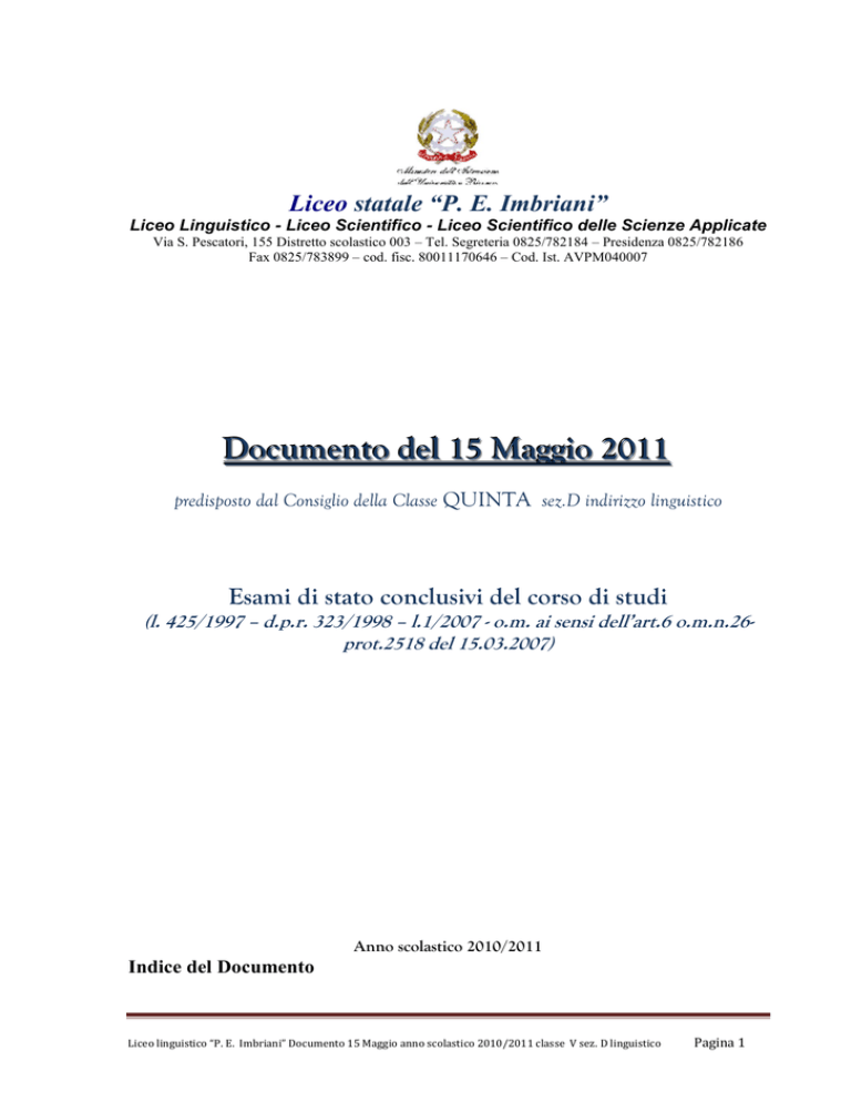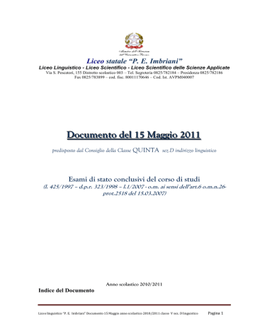 Liceo statale “P. E. Imbriani” Liceo Linguistico - Liceo Scientifico - Liceo Scientifico delle Scienze Applicate Via S. Pescatori, 155 Distretto scolastico 003 – Tel. Segreteria 0825/782184 – Presidenza 0825/782186 Fax 0825/783899 – cod. fisc. 80011170646 – Cod. Ist. AVPM040007 Documento del 15 Maggio 2011 predisposto dal Consiglio della Classe QUINTA sez.D indirizzo linguistico Esami di stato conclusivi del corso di studi (l. 425/1997 – d.p.r. 323/1998 – l.1/2007 - o.m. ai sensi dell’art.6 o.m.n.26prot.2518 del 15.03.2007) Indice del Documento Anno scolastico 2010/2011 Liceo linguistico “P. E. Imbriani” Documento 15 Maggio anno scolastico 2010/2011 classe V sez. D linguistico Pagina 1 Composizione Consiglio di Classe Elenco alunni Finalità dell’indirizzo linguistico Storia e presentazione della classe Attività integrative Obiettivi educativi stabiliti nella programmazione del Consiglio di classe Metodologia di insegnamento Mezzi e strumenti di lavoro Verifica e valutazione Schede relative ai macroargomenti disciplinari: Programmazione disciplinare di Educazione Fisica Programmazione disciplinare di Filosofia Programmazione disciplinare di Fisica Programmazione disciplinare di Italiano Programmazione disciplinare di Latino Programmazione disciplinare di Lingua Inglese Programmazione disciplinare di Lingua Francese Programmazione disciplinare di Lingua Spagnola Programmazione disciplinare di Matematica Programmazione disciplinare di Religione Cattolica Programmazione disciplinare di Scienze naturali (Biologia) Programmazione disciplinare di Storia Programmazione disciplinare di Storia dell’Arte Proposte griglie di valutazione prove scritte e orali : Scheda di valutazione della prova di italiano Scheda di valutazione della seconda prova Scheda di valutazione della terza prova Scheda di valutazione del colloquio Simulazioni delle prove d’Esame Allegato 1 -- Prima simulazione terza prova Allegato 2 – Seconda simulazione terza prova Composizione Consiglio di Classe Docente Coordinatore: prof. Tulimiero Mariarosaria Liceo linguistico “P. E. Imbriani” Documento 15 Maggio anno scolastico 2010/2011 classe V sez. D linguistico Pagina 2 Cognome Nome Prof. DI RIENZO LUCIANO Prof. TRONCONE Prof. TOSCANO Prof. MARRONE Prof. PETRILLO Prof. CAMPAGNA Prof. MORELLI Prof. DE VITO Prof. DELL’ANNO Prof. TULIMIERO Prof. PELLECCHIA Doc. JAMIESON Doc. DAUCHEZ Doc. LO CHIATTO Sig. POSTIGLIONE Alun. GAETA Alun. VIGNOLA Michele Paola Assunta Pierina Cinzia Fiorita Mario Fabio Mariarosaria M. Virginia Joan Dominique Ana Pierluigi Lucia Michela Disciplina DIRIGENTE SCOLASTICO Educazione Fisica Filosofia e Storia Lettere Italiane e Latine Lingua e civiltà Francese Lingua e civiltà Inglese Lingua e civiltà spagnola Storia dell’Arte Matematica e Fisica Religione Scienze naturali (biologia) Doc. Conversazione Inglese Doc. Conversazione Francese Doc. Conversazione Spagnolo Rappresentante dei genitori Rappresentante degli alunni Rappresentante degli alunni Allievi componenti della classe V sezione D (corso linguistico) : 1. 2. 3. 4. 5. 6. 7. Cognome BAGNO BEATELLO BORREGA CARBONE CORBELLO DAMIANO DI PIETRO Nome Daniela Samantha Francesco Mariagiovanna Marilisa Angelo Marcella 12. 13. 14. 15. 16. LIETO POSTIGLIONE SORRENTINO TROPEANO VIGNOLA Stefania Almi Maria Sabrina Alessia Michela 8. FIORDELLISI 9. FIORE 10. GAETA 11. IMBIMBO Barbara Rosa Lucia Sonia Finalità dell’indirizzo linguistico Liceo linguistico “P. E. Imbriani” Documento 15 Maggio anno scolastico 2010/2011 classe V sez. D linguistico Pagina 3 Il Liceo Linguistico è un indirizzo di studi che intende rispondere alle esigenze di una società multiforme e complessa. La caratterizzazione culturale e formativa è colta nella profonda base culturale e nelle esigenze di integrazione della funzione del linguaggio, della storicità dei saperi, della scientificità del metodo, cercando di individuare le direzioni corrispondenti ai vari campi disciplinari, in cui lo studente sviluppa capacità e competenze di settore. Trae la sua peculiarità dalla presenza di tre lingue straniere e dalla metodologia che ne caratterizza l'insegnamento, all'interno di una dimensione formativa allargata, assicurata, per tutto il triennio, dal contributo delle varie componenti: linguistico - letteraria – artistica; storico – filosofica; matematico-scientifica. L'insegnamento delle tre lingue è finalizzato sia all'acquisizione di competenze linguistiche e comunicative sia all'incontro con patrimoni di storia, letteratura e civiltà, costituendo l'approccio storico - culturale nello studio delle lingue un aspetto tipico della specificità dell'indirizzo. La caratterizzazione linguistica non è data soltanto dalle lingue straniere, ma anche al rinvio ad un continuo confronto analogico e contrastivo con l'italiano e il latino. La presenza del latino permette, in particolare, tanto una migliore analisi delle lingue moderne nelle loro strutture quanto una più viva sensibilizzazione alla storicità delle lingue. La storia concorre, in una prospettiva unificante, a raccordare le conoscenze delle civiltà dei vari paesi a cui lo stesso studio delle lingue si riferisce, tenendo conto delle coordinate temporali e spaziali. Il giovane in uscita dall'indirizzo è in possesso di una specifica preparazione preprofessionale, che gli permette di leggere la realtà sociale e di realizzare progetti e attività. Tale formazione gli permette di accedere a tutte le facoltà universitarie o di seguire corsi post-diploma per svolgere attività lavorative nel terziario tradizionale e nel terziario avanzato. In questi ultimi anni ,infatti, accanto alle attività tradizionali dei servizi pubblici e privati, si è andata caratterizzando un'area avanzata, destinata alla soddisfazione dei bisogni collettivi. Ciò avviene nell'istruzione, nella sanità, nei trasporti, nelle comunicazioni, nei servizi culturali e ricreativi. Liceo linguistico “P. E. Imbriani” Doc