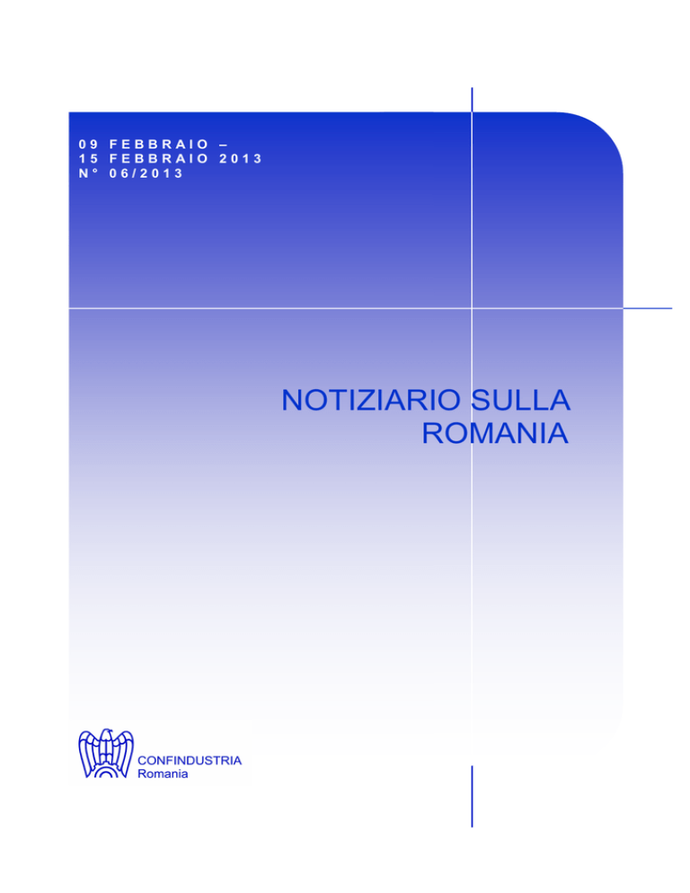 09 FEBBRAIO – 15 FEBBRAIO 2013 N° 06/2013 NOTIZIARIO SULLA ROMANIA 09 febbraio-15 febbraio 2013 N° 6/2013 CONTENUTI Politica Economia Finanza Industria Papa Benedetto XVI riceverà venerdì al Vaticano il Presidente Basescu L’avvocato Vlad Stoica, nominato Capo della Cancelleria del Primo Ministro Traian Basescu ha informato la Camera dei Deputati sulla partecipazione del Paese alle missioni NATO, UE, OSCE e ONU Il Ministro Corlaţean in visita in Olanda Blaga: è bene che Elena Udrea voglia candidarsi per la presidenza PDL Via libera per la scarcerazione dell'ex Premier Adrian Nastase Monica Macovei, il più attivo europarlamentare nel 2012, con 35 rapporti approvati Crin Antonescu: sarò il Capo della Commissione per la revisione della Costituzione Il Parlamento ha approvato la Commissione per la revisione della Costituzione Chieste le dimissioni del Ministro Dan Nica Piano contro l’evasione fiscale Deficit commerciale pari a 9,6 miliardi di euro nel 2012 La Romania coinvolta nello scandalo Findus Il tasso d’inflazione sale a +1,34% a gennaio Romania: evasione fiscale superiore alla media Ernst & Young: le compagnie romene ottimiste In crescita il mercato del leasing Incontro tra il Ministro dell’Economia, la BERD e la Enel La Romania Paese dell’anno alla Fiera BioFach di Norimberga Le vendite dei beni di consumo nel quarto trimestre 2012 Meno soldi europei per lo sviluppo rurale Il Parlamento romeno approva il bilancio 2013 La Borsa di Bucarest chiude il 2012 con un calo dell’utile Chiuso il bilancio 2012 di BRD Romania Banca Italo-Romena, finanziamenti per progetti di sviluppo rurale KPMG: settore bancario relativamente stabile La Romania rischia di perdere i fondi europei Aumentano le attività delle banche alla fine del 2012 Introduzione della tassa forfettaria per gli albergatori Romania quinta nell'Unione Europea per nuovi impianti eolici costruiti Investitore moldavo compra la metà della Romaltyn Vosganian: la Romania sostiene la CE nel tentativo di far riprendere il settore siderurgico Eurostat: la Romania fra i Paesi più indipendenti energeticamente Sanzione per la Ford Romania Aumento del fatturato nel 2012 per il rivenditore di auto ATP Exodus 09 febbraio-15 febbraio 2013 N° 6/2013 Costruzioni Investimenti nel centro storico di Bucarest Migliora la fiducia degli investitori immobiliari in Romania Grande investimento a Cluj in un parco sul lago di Gheorgheni Notiziario sulla Romania 3 09 febbraio-15 febbraio 2013 N° 6/2013 Politica Papa Benedetto XVI riceverà venerdì al Vaticano il Presidente Basescu Gandul, 11 febbraio Prima del ritiro ufficiale di Papa Benedetto XVI, annunciato l’11 febbraio, il Presidente Traian Basescu ha programmato una visita ufficiale al Vaticano, per il 15 febbraio. Finora, la visita non è stata annullata in seguito all’annuncio delle dimissioni del Papa previste per il 28 febbraio e dovute a motivi di salute. Il Presidente Basescu ha avuto un primo incontro con il Papa, insieme a sua moglie, a settembre 2008 presso Castello Gandolfo. L’avvocato Vlad Stoica, nominato Capo della Cancelleria del Primo Ministro Mediafax, 11 febbraio L’avvocato Vlad Stefan Stoica, ex Presidente onorario dell’Associazione per la promozione dei principi sociali e democratici dei giovani di Romania, è stato incaricato dal Primo Ministro della direzione della Cancelleria. Come Capo della Cancelleria del Primo Ministro, Stoica avrà status di ministro. La Cancelleria del Primo Ministro era stata sciolta nel 2009 da Emil Boc ed è stata ricostituita la scorsa estate tramite una legge emanata dal Parlamento. Il Parlamento ha approvato la prima Ordinanza d’urgenza del Governo Ponta, riguardante la nuova organizzazione dell’amministrazione pubblica centrale. L’ordinanza, in più punti emendata, non conteneva disposizioni precise riguardo la Cancelleria, ma introduceva i ministeri con delega per l’Amministrazione Pubblica, per il Dialogo Sociale e per l’Ambito d’Affari. L’Ordinanza è stata approvata a luglio tramite una legge del Parlamento che ha approvato vari emendamenti proposti dal Senatore PSD Trifon Belacurencu. Tra questi, c’era anche l’emendamento che stabiliva quale sarebbe dovuta essere la composizione della macchina di Governo: il Segretariato Generale, i dipartimenti, le altre strutture organizzative e la Cancelleria del Primo Ministro. Le competenze della Cancelleria sono state specificate in una decisione del Primo Ministro Ponta della scorsa settimana. Traian Basescu ha informato la Camera dei Deputati sulla partecipazione del Paese alle missioni NATO, UE, OSCE e ONU Mediafax, 11 febbraio Il Presidente Traian Basescu ha presentato alla Direzione della Camera dei Deputati due lettere in cui rende noto che la Romania, con le sue forze armate, rimarrà fedele nel 2013 agli impegni internazionali assunti, partecipando a missioni e operazioni NATO, UE, OSCE e ONU oltre i confini dello Stato romeno. I fondi finanziari necessari alla partecipazione a queste missioni sono assicurati dai budget del Ministero della Difesa Nazionale e del Ministero degli Affari Interni per il 2013. Secondi i documenti inviati alla Camera dei Deputati, il numero delle forze armate partecipanti a tali operazioni è pari a 2049. Nella seconda lettera, il Presidente informa che gli Stati Uniti, in base all’accordo tra la Romania e SEOA riguardante le attività degli Stati Uniti sul territorio della Romania, hanno chiesto il permesso per continuare le operazioni di trasporto multimodale delle risorse materiali e umane del Governo USA sul territorio del Paese da e verso l’Afghanistan, come sostegno all’operazione NATO International Security Assistance Force (ISAF) e dell’operazione di coalizione Enduring Freedom nel 2013. Le richieste USA riguardano anche l’utilizzo nel 2013 dell’aeroporto internazionale Mihail Kogalniceanu-Costanza e del porto di Costanza, nonché dell’infrastruttura stradale e ferroviaria. Inoltre, il Presidente ha