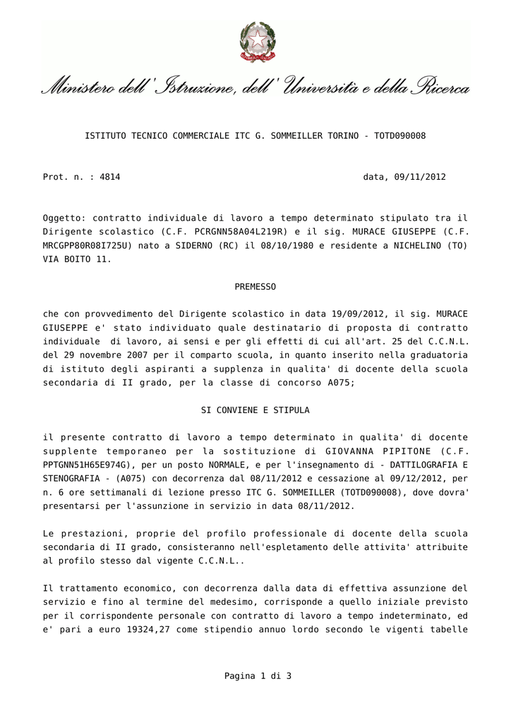 ISTITUTO TECNICO COMMERCIALE ITC G. SOMMEILLER TORINO - TOTD090008 Prot. n. : 4814 data, 09/11/2012 Oggetto: contratto individuale di lavoro a tempo determinato stipulato tra il Dirigente scolastico (C.F. PCRGNN58A04L219R) e il sig. MURACE GIUSEPPE (C.F. MRCGPP80R08I725U) nato a SIDERNO (RC) il 08/10/1980 e residente a NICHELINO (TO) VIA BOITO 11. PREMESSO che con provvedimento del Dirigente scolastico in data 19/09/2012, il sig. MURACE GIUSEPPE e' stato individuato quale destinatario di proposta di contratto individuale di lavoro, ai sensi e per gli effetti di cui all'art. 25 del C.C.N.L. del 29 novembre 2007 per il comparto scuola, in quanto inserito nella graduatoria di istituto degli aspiranti a supplenza in qualita' di docente della scuola secondaria di II grado, per la classe di concorso A075; SI CONVIENE E STIPULA il presente contratto di lavoro a tempo determinato in qualita' di docente supplente temporaneo per la sostituzione di GIOVANNA PIPITONE (C.F. PPTGNN51H65E974G), per un posto NORMALE, e per l'insegnamento di - DATTILOGRAFIA E STENOGRAFIA - (A075) con decorrenza dal 08/11/2012 e cessazione al 09/12/2012, per n. 6 ore settimanali di lezione presso ITC G. SOMMEILLER (TOTD090008), dove dovra' presentarsi per l'assunzione in servizio in data 08/11/2012. Le prestazioni, proprie del profilo professionale di docente della scuola secondaria di II grado, consisteranno nell'espletamento delle attivita' attribuite al profilo stesso dal vigente C.C.N.L.. Il trattamento economico, con decorrenza dalla data di effettiva assunzione del servizio e fino al termine del medesimo, corrisponde a quello iniziale previsto per il corrispondente personale con contratto di lavoro a tempo indeterminato, ed e' pari a euro 19324,27 come stipendio annuo lordo secondo le vigenti tabelle Pagina 1 di 3 contrattuali oltre ogni altro assegno o indennita' previsti dalle vigenti disposizioni, sulla base di 6/18mi. La liquidazione della tredicesima mensilita' e dell'eventuale compenso sostitutivo delle ferie non godute e' effettuata dall'ufficio che provvede al pagamento dello stipendio, in relazione alla durata del presente contratto. Riguardo alla documentazione di rito occorrente per la costituzione del rapporto di lavoro ed a corredo del presente contratto, si rammenta che la mancata presentazione, cosi' come la non veridicita' del contenuto delle dichiarazioni sostitutive di certificazione - comprese quelle effettuate nel corso della procedura di reclutamento - comportano l'immediata risoluzione del rapporto di lavoro, ferme restando le sanzioni penali previste dall'art. 76 del D.P.R. n. 445/2000. Il rapporto di lavoro di cui al presente contratto e' regolato dal C.C.N.L. e dalle norme da esso richiamate o con esso compatibili anche per le cause che costituiscono le condizioni risolutive del medesimo. Si rammenta, in particolare, che la mancata assunzione del servizio - salvo causa impedimento prevista dalla legge - nei termini stabiliti, comporta l'immediata risoluzione del rapporto di lavoro. E' altresi' causa di risoluzione del medesimo l'annullamento della procedura di reclutamento che ne costituisce il presupposto, come pure il mancato possesso dei requisiti e l'accertata non idoneita' all'insegnamento. Al sig. MURACE GIUSEPPE viene consegnata copia del codice di comportamento riportato nel vigente CCNL, con l'obbligo di adeguare il proprio comportamento a quanto ivi previsto. Il sig. MURACE GIUSEPPE dichiara di accettare tutte le clausole che regolano il suo rapporto di lavoro subordinato a tempo determinato, dando per conosciute le norme contrattuali e quelle di riferimento alle quali si fa rinvio. Il presente contratto, redatto in carta semplice, sara' registrato in caso d'uso ai sensi dell'articolo 5, comma 2, del D.P.R. n. 131/1986, con spese a carico del richiedente. Il presente contratto viene letto, confermato e sottoscritto per accettazione con effetto immediato. __________, __/__/____ Pagina 2 di 3 il dirigente scolastico Firma per accettazione GIOVANNI PACIARIELLO GIUSEPPE MURACE Codice contratto: MI00000000120435Z2000018 Versione: 1 Pagina 3 di 3