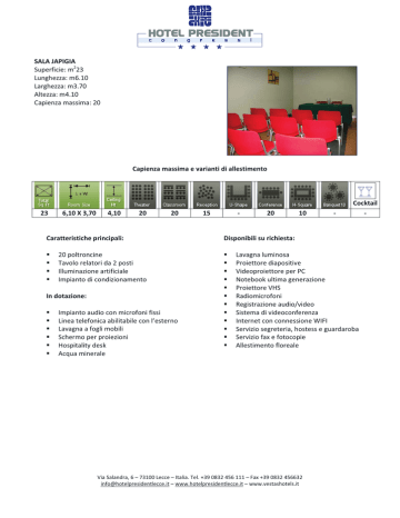 SALA JAPIGIA Superficie: m223 Lunghezza: m6.10 Larghezza: m3.70 Altezza: m4.10 Capienza massima: 20 Capienza massima e varianti di allestimento 23 6,10 X 3,70 4,10 20 20 15 - 20 Caratteristiche principali: Disponibili su richiesta: ! ! ! ! ! ! ! ! ! ! ! ! ! ! ! ! 20 poltroncine Tavolo relatori da 2 posti Illuminazione artificiale Impianto di condizionamento In dotazione: ! ! ! ! ! ! Impianto audio con microfoni fissi Linea telefonica abilitabile con l’esterno Lavagna a fogli mobili Schermo per proiezioni Hospitality desk Acqua minerale 10 - Cocktail - Lavagna luminosa Proiettore diapositive Videoproiettore per PC Notebook ultima generazione Proiettore VHS Radiomicrofoni Registrazione audio/video Sistema di videoconferenza Internet con connessione WIFI Servizio segreteria, hostess e guardaroba Servizio fax e fotocopie Allestimento floreale Via Salandra, 6 – 73100 Lecce – Italia. Tel. +39 0832 456 111 – Fax +39 0832 456632 [email protected] – www.hotelpresidentlecce.it – www.vestashotels.it