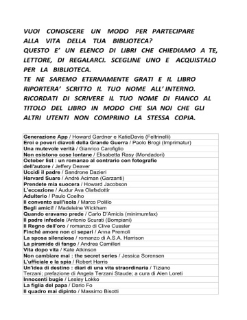 VUOI CONOSCERE UN MODO PER PARTECIPARE ALLA VITA DELLA TUA BIBLIOTECA? QUESTO E’ UN ELENCO DI LIBRI CHE CHIEDIAMO A TE, LETTORE, DI REGALARCI. SCEGLINE UNO E ACQUISTALO PER LA BIBLIOTECA. TE NE SAREMO ETERNAMENTE GRATI E IL LIBRO RIPORTERA’ SCRITTO IL TUO NOME ALL’ INTERNO. RICORDATI DI SCRIVERE IL TUO NOME DI FIANCO AL TITOLO DEL LIBRO IN MODO CHE SIA NOI CHE GLI ALTRI UTENTI NON COMPRINO LA STESSA COPIA. Generazione App / Howard Gardner e KatieDavis (Feltrinelli) Eroi e poveri diavoli della Grande Guerra / Paolo Brogi (Imprimatur) Una mutevole verità / Gianrico Carofiglio Non esistono cose lontane / Elisabetta Rasy (Mondadori) October list : un romanzo al contrario con fotografie dell'autore / Jeffery Deaver Uccidi il padre / Sandrone Dazieri Harvard Suare / André Aciman (Garzanti) Prendete mia suocera / Howard Jacobson L’eccezione / Audur Ava Olafsdottir Adulterio / Paulo Coelho Il convento sull'isola / Marco Polillo Begli amici! / Madeleine Wickham Quando eravamo prede / Carlo D’Amicis (minimumfax) Il padre infedele /Antonio Scurati (Bompiani) Il Regno dell'oro / romanzo di Clive Cussler Finché amore non ci separi / Anna Premoli La sposa silenziosa / romanzo di A.S.A. Harrison La piramide di fango / Andrea Camilleri Vita dopo vita / Kate Atkinson Non cambiare mai : the secret series / Jessica Sorensen L'ufficiale e la spia / Robert Harris Un'idea di destino : diari di una vita straordinaria / Tiziano Terzani; prefazione di Angela Terzani Staude; a cura di Alen Loreti Innocenti bugie / Lesley Lokko La figlia del papa / Dario Fo Il quadro mai dipinto / Massimo Bisotti 50 minuti 2 volte alla settimana : gustose ricette e semplici esercizi per rimettersi in forma / Marco Bianchi Il sentiero dei profumi / Cristina Caboni I cento libri che rendono più ricca la nostra vita / Piero Dorfles Il nero e l'argento / Paolo Giordano L'assassinio di Pitagora / Marcos Chicot Un piccolo gesto crudele / romanzo di Elizabeth George La vita è un viaggio / Beppe Severgnini La magia di un buongiorno / di Massimo Gramellini Un passo di troppo / romanzo di Lee Child Un disastro è per sempre / Jamie McGuire La moglie magica / Sveva Casati Modignani Quattro sberle benedette / Andrea Vitali Morto a 3/4 / Francesco Balletta Questa non è una canzone d'amore / Alessandro Robecchi Contro ogni evidenza / Gianni Simoni La vita segreta di Gesù / Vito Mancuso Maledetta primavera / Paolo Cammilli Giochi d'ombra / Charlotte Link Las vegans : la rivoluzione in cucina : le mie ricette vegane sane, golose e rock / Paola Maugeri Allegiant / Veronica Roth La sirena / Camilla Läckberg Una ragione per restare / Rebecca Donovan Che ci importa del mondo / Selvaggia Lucarelli Non è più come prima : elogio del perdono nella vita amorosa / Massimo Recalcati Il pipistrello / Jo Nesbo Il caso Eddy Bellegueule / Edouard Louis Il confine di Bonetti / Giovanni Floris Il cardellino / Donna Tartt La ragazza che hai lasciato / Jojo Moyes Quando tutto questo sarà finito : storia della mia famiglia perseguitata dalle leggi razziali / Gioele Dix I peccati di una madre / Danielle Steel Sabotaggio / di Clive Cussler e Justin Scott The China study : le ricette per un'alimentazione sana e naturale / Leanne Campbell Un delitto molto milanese / Antonio Steffenoni Premiata Ditta Sorelle Ficcadenti / Andrea Vitali Storia di una ladra di libri / Markus Zusak Il quinto testimone / Michael Connelly L'accademia dei vampiri. Anime legate / Richelle Mead Ti ricordi la casa rossa? : lettera a mia madre / Giulio Scarpati Le cose che sai di me / Clara Sanchez 12 anni schiavo : la straordinaria storia vera di Solomon Northup / Solomon Northup Polvere / Patricia Cornwell Con te sarà diverso : la trilogia delle coincidenze / Jessica Sorensen Le ossa della principessa / romanzo di Alessia Gazzola Braccialetti rossi : il mondo giallo : se credi nei sogni, i sogni si creeranno / Albert Espinosa Philomena / Martin Sixsmith Il gioco di Ripper / Isabel Allende Splendore / Margaret Mazzantini L'ombra del sicomoro / John Grisham Tienimi con te : the Secret Trilogy / Jessica Sorensen Il bambino invisibile / Marcello Foa Per dieci minuti / Chiara Gamberale Sale, zucchero e caffè : l'Italia che ho vissuto: da nonna Aida alla Terza Repubblica / Bruno Vespa La regina scalza / Ildefonso Falcones Gli sdraiati / Michele Serra Hotel Vendôme / Danielle Steel La strada verso casa / Fabio Volo Marina Bellezza / Silvia Avallone Palazzo Sogliano / Sveva Casati Modignani La risposta è nelle stelle / Nicholas Sparks Maledetta primavera / Paolo Cammilli Insurgent / Veronica Roth E l'eco rispose / Khaled Hosseini La verità sul caso Harry Quebert / Joel Dicker Entra nella mia vita / Clara Sanchez The China study : lo studio più completo sull'alimentazione mai condotto finora : sorprendenti implicazioni per la dieta, la perdita di peso e la salute a lungo termine / T. Colin Campbell e Thomas M. Campbell II Le cronache di Narnia : la sedia d'argento / regia di Alex Kirby La luna blu : il percorso inverso dei sogni / Massimo Bisotti Divergent / Veronica Roth Qualcuno con cui correre / David Grossman Acciao / Avallone Bambini Il camion dei pompieri / Dario Cestaro - Giunti Cars 2 pop-up / Disney Pixar Viaggio nel tempo-7 / Geronimo Stilton