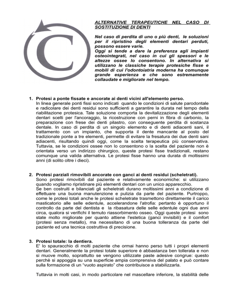 ALTERNATIVE TERAPEUTICHE NEL CASO DI SOSTITUZIONE DI DENTI Nel caso di perdita di uno o più denti, le soluzioni per il ripristino degli elementi dentari perduti, possono essere varie. Oggi si tende a dare la preferenza agli impianti osteointegrati, nel caso in cui gli spessori e le altezze ossee lo consentono. In alternativa si utilizzano le classiche terapie protesiche fisse e mobili di cui l'odontoiatria moderna ha comunque grande esperienza e che sono estremamente collaudate e migliorate nel tempo. 1. Protesi a ponte fissate e ancorate ai denti vicini all'elemento perso. In linea generale ponti fissi sono indicati quando le condizioni di salute parodontale e radicolare dei denti residui sono sufficienti a garantire la durata nel tempo della riabilitazione protesica. Tale soluzione comporta la devitalizzazione degli elementi dentari scelti per l'ancoraggio, la ricostruzione con perni in fibra di carbonio, la preparazione con frese dei denti pilastro, con conseguente perdita di sostanza dentale. In caso di perdita di un singolo elemento e di denti adiacenti sani, il trattamento con un impianto, che supporta il dente mancante al posto del tradizionale ponte a tre elementi, permette di evitare la fresatura dei due denti sani adiacenti, risultando quindi oggi, come la scelta terapeutica più conservativa. Tuttavia, se le condizioni ossee non lo consentono o la scelta del paziente non è orientata verso un indirizzo chirurgico, queste protesi fisse tradizionali, restano comunque una valida alternativa. Le protesi fisse hanno una durata di moltissimi anni (di solito oltre i dieci). 2. Protesi parziali rimovibili ancorate con ganci ai denti residui (scheletrati). Sono protesi rimovibili dal paziente e relativamente economiche: si utilizzano quando vogliamo ripristinare più elementi dentari con un unico apparecchio. Se ben costruiti e bilanciati gli scheletrati durano moltissimi anni a condizione di effettuare una buona manutenzione e pulizia da parte del paziente. Purtroppo, come le protesi totali anche le protesi scheletrate trasmettono direttamente il carico masticatorio alle selle edentule, accelerandone l'atrofia: pertanto è opportuno il controllo da parte del dentista e la ribasatura delle selle edentule ogni due anni circa, qualora si verifichi il temuto riassorbimento osseo. Oggi queste protesi sono state molto migliorate per quanto attiene l'estetica (ganci invisibili) e il comfort (protesi senza metallo), ma necessitano di una buona tolleranza da parte del paziente ed una tecnica costruttiva di precisione. 3. Protesi totale: la dentiera. E' lo spauracchio di molti paziente che ormai hanno perso tutti i propri elementi dentari. Generalmente la protesi totale superiore è abbastanza ben tollerata e non si muove molto, soprattutto se vengono utilizzate paste adesive congrue: questo perchè si appoggia su una superficie ampia comprensiva del palato e può contare sulla formazione di un “vuoto aspirato” che contribuisce a stabilizzarla. Tuttavia in molti casi, in modo particolare nel mascellare inferiore, la stabilità delle protesi totali è purtroppo insufficiente a causa dell'atrofia della cresta ossea edentula al di sotto della gengiva. Le protesi totali, inoltre, trasmettendo il carico masticatorio direttamente sulle creste edentule, provocano un lento e progressivo riassorbimento delle ossa mascellari che negli anni rende davvero difficoltoso il portarle. A volte la terapia con impianti puo' agevolarci perchè il dentista riesce a dare nuovi ancoraggi alla dentiera che pertanto riacquista stabilità. 4. Nessun trattamento. Dopo aver perso un dente, si può non ripristinarlo. Tuttavia, la perdita di anche un solo elemento dentale, oltre al danno immediato di carattere estetico e funzionale, comporta uno squilibrio a livello dell'apparato masticatorio con conseguente malocclusione e migrazione degli elementi dentali residui. La malocclusione puo' essere compensata dalle capacità proprie dell'organismo a patto che ne esistano i presupposti (compensi neuromuscolari). Nel momento in cui i carichi funzionali o parafunzionali o i traumi determinino nel tempo l'esaurimento di tali capacità, intervengono le patologie e i dolori anche a carico di strutture apparentemente lontane dal sito dove l'elemento dentario è andato perso. 5. Impianti: cenni storici Circa quarant'anni fa, il chirurgo e ricercatore svedese P. I. Branemark ha descritto il processo di osteointegrazione, ovvero dimostrò scientificamente la connessione diretta tra osso vitale e superficie in titanio di un impianto utilizzato come radice dentaria artificiale. Utilizzando un intervento in due fasi chirurgiche ed una tecnica sterile ed il più possibile atraumatica, Branemark ha dimostrato che questa connessione tra osso e titanio è in grado di conferire un ancoraggio stabile e duraturo all'impianto che può così essere utilizzato per supportare protesi dentali, facciali e ortopediche. Prima dell'avvento di tale tecnica, gli impianti dentali erano caratterizzati da risultati incostanti e frequentemente dovevano essere rimossi, non fornendo una predicibilità di costante di successo nel tempo. Dal 1965, migliaia di pazienti sono stati trattati con successo, prima in Svezia e successivamente nel resto del mondo, utilizzando impianti osteointegrati secondo la sistematica Branemark. Questo metodo è stato introdotto in Italia per la prima volta nel 1984. Percentuali di successo Le tecniche implantari caratterizzate da osteointegrazione, presentano un'elevata percentuale di successo (>90-95%). Le alte percentuali di successo a lungo termine sono subordinate al rispetto di un adeguato programma di controlli periodici (annuali) associati a sedute semestrali di igiene orale e ablazione del tartaro. Le ricerche internazionali hanno dimostrato che i forti fumatori (oltre 20 sigarette al giorno) presentano percentuali di successo inferiori (80-90%). COME SI METTONO GLI IMPIANTI PRIMA FASE CHIRURGICA L'inserimento degli impiant