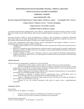 DIPARTIMENTO DI LINGUE STRANIERE: INGLESE – TEDESCO - FRANCESE ISTITUTO TECNICO: SETTORE ECONOMICO INDIRIZZO: TURISMO Anno scolastico 2015 - 2016 Docenti componenti il dipartimento: Lingua inglese: Di Ruocco Angela - Caccioppoli Lucia - Inserra Lingua tedesca: Calabrese Teresa – Taranto Giuseppina Lingua francese: Sorrentino Carmine COORDINATRICE: Di Ruocco Angela La presente programmazione dipartimentale viene elaborata congiuntamente dai docenti di lingua straniera alla luce delle Linee Guida tracciate dalla Riforma della Scuola Secondaria Superiore introdotta con il D.P.R del 15 marzo 2010. Essa tiene presente il profilo in uscita del diplomato nel Turismo e mira ad integrare le competenze dell’ambito professionale specifico con quelle plurilinguistiche al fine di contribuire allo sviluppo delle competenze necessarie per poter operare efficacemente nelle imprese turistiche in un contesto internazionale. In tale ottica l’insegnamento delle lingue straniere favorirà apprendimenti meta-cognitivi mediante il ricorso a metodologie esperienziali e la pratica di attività in grado di: 1. sviluppare capacità diffuse di vision, motivate dalla necessità di promuovere continue innovazioni di processo e di prodotto; 1. promuovere competenze legate alla dimensione relazionale intesa sia negli aspetti di tecnicalità (dalla pratica delle lingue straniere, all’utilizzo delle nuove tecnologie), sia negli aspetti attitudinali (attitudine alla relazione, all’informazione, al servizio); 1. stimolare sensibilità e interesse per l’intercultura, intesa sia come capacità di relazionarsi efficacemente a soggetti provenienti da culture diverse, sia come capacità di comunicare ad essi gli elementi più rilevanti della cultura di appartenenza. Obiettivi generali Alla fine del precorso quinquennale lo studente deve essere in grado di: • padroneggiare la lingua inglese, la lingua tedesca e la lingua francese per scopi comunicativi; • utilizzare i linguaggi settoriali relativi ai percorsi di studio, per interagire in diversi ambiti e contesti professionali, al livello B2 per la lingua inglese, B1-B2 per la lingua tedesca, B1 per la lingua francese del quadro comune europeo di riferimento per le lingue (QCER); • stabilire collegamenti tra le tradizioni culturali locali, nazionali ed internazionali sia in una prospettiva interculturale sia ai fini della mobilità di studio e di lavoro; • individuare ed utilizzare le moderne forme di comunicazione visiva e multimediale, anche con riferimento alle strategie espressive e agli strumenti tecnici della comunicazione in rete; • utilizzare i linguaggi settoriali delle lingue straniere previste dal percorso di studio per interagire in diversi ambiti e contesti di studio e di lavoro; • utilizzare le reti e gli strumenti informatici nelle attività di studio, ricerca e approfondimento disciplinare. Competenze di base Primo biennio Livello di uscita A2/ B1 Inglese e A2 Tedesco • • Utilizzare la lingua straniera per i principali scopi comunicativi ed operativi. Produrre testi di vario tipo in relazione ai differenti scopi comunicativi. Secondo biennio e quinto anno Livello di uscita B2 Inglese – B1 /B2 Tedesco – Francese B1 • • • • • • Padroneggiare la lingua inglese, la lingua tedesca e la lingua francese per scopi comunicativi e utilizzare i linguaggi settoriali relativi al percorso di studio, per interagire in diversi ambiti e contesti professionali, ai livelli indicati. Progettare, documentare e presentare servizi o prodotti turistici. Utilizzare e produrre strumenti di comunicazione visiva e multimediale, anche con riferimento alle strategie espressive e agli strumenti tecnici della comunicazione in rete.109 Contribuire a realizzare piani di marketing con riferimento a specifiche tipologie di imprese o prodotti turistici. Stabilire collegamenti tra le tradizioni culturali locali, nazionali ed internazionali sia in una prospettiva interculturale sia ai fini della mobilità di studio e di lavoro. Utilizzare il sistema delle comunicazioni e delle relazioni delle imprese turistiche. L’articolazione delle competenze in conoscenze e abilità è di seguito indicata quale orientamento per la progettazione didattica dei singoli docenti in relazione alle scelte compiute nell’ambito della programmazione collegiale del Consiglio di classe. Primo biennio Conoscenze • • • • • Aspetti comunicativi, socio-linguistici e paralinguistici della interazione e della produzione orale (descrivere, narrare) in relazione al contesto e agli interlocutori. Strutture grammaticali di base della lingua, sistema fonologico, ritmo e intonazione della frase, ortografia e punteggiatura. Strategie per la comprensione globale e selettiva di testi e messaggi semplici e chiari, scritti, orali e multimediali, su argomenti noti inerenti la sfera personale, sociale o l’attualità. Lessico e fraseologia idiomatica frequenti relativi ad argomenti di vita quotidiana, sociale o d’attualità e tecniche d’ uso dei dizionari, anche multimediali; varietà di registro. Nell’ambito della produzione scritta, riferita a testi brevi, semplici e coerenti, caratteristiche delle diverse tipologie (lettere informali, descrizioni, narrazioni, ecc.) strutture. Abilità • • • • Interagire in conversazioni brevi e chiare su argomenti di interesse personale, quotidiano, sociale o d’attualità. Utilizzare appropriate strategie ai fini della ricerca di informazioni e della comprensione dei punti essenziali in messaggi chiari, di breve estensione, scritti e orali, su argomenti noti e di interesse personale, quotidiano, sociale o d’attualità. Utilizzare un repertorio lessicale ed espressioni di base, per esprimere bisogni concreti della vita quotidiana, descrivere esperienze e narrare avvenimenti di tipo personale o familiare. Utilizzare i dizionari monolingue e bilingue, compresi quelli multimediali. Descrivere in maniera semplice esperienze, impressioni