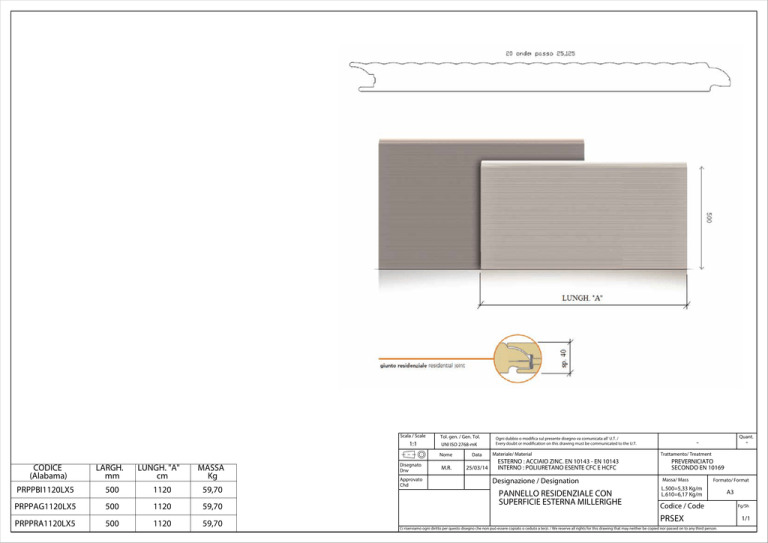 CODICE (Alabama) LARGH. mm LUNGH. "A" cm MASSA Kg PRPPBI1120LX5 500 1120 59,70 PRPPAG1120LX5 500 1120 59,70 PRPPRA1120LX5 500 1120 59,70 Scala / Scale Tol. gen. / Gen. Tol. 1:1 UNI ISO 2768-mK Disegnato Drw Approvato Chd Nome Data M.R. 25/03/14 Ogni dubbio o modifica sul presente disegno va comunicata all' U.T. / Every doubt or modification on this drawing must be communicated to the U.T. Materiale/ Material ESTERNO : ACCIAIO ZINC. EN 10143 - EN 10143 INTERNO : POLIURETANO ESENTE CFC E HCFC Designazione / Designation PANNELLO RESIDENZIALE CON SUPERFICIE ESTERNA MILLERIGHE Quant. - Trattamento/ Treatment PREVERNICIATO SECONDO EN 10169 Massa/ Mass Formato/ Format L.500=5,33 Kg/m L.610=6,17 Kg/m Codice / Code PRSEX Ci riserviamo ogni diritto per questo disegno che non può essere copiato o ceduto a terzi. / We reserve all rights for this drawing that may neither be copied nor passed on to any third person. A3 Fg/Sh 1/1