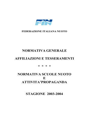 FEDERAZIONE ITALIANA NUOTO NORMATIVA GENERALE AFFILIAZIONI E TESSERAMENTI * * * * NORMATIVA SCUOLE NUOTO E ATTIVITA’PROPAGANDA STAGIONE 2003-2004 FEDERAZIONE ITALIANA NUOTO CIRCOLARE NORMATIVA 2003-2004 INDICE GENERALE A) AFFILIAZIONI DELLE SOCIETA’ 1) PRIMA AFFILIAZIONE Pag.04 2) RIAFFILIAZIONE Pag.06 3) DENOMINAZIONE SOCIALE Pag.09 4) CAMBIO DENOMINAZIONE Pag.09 5) MODIFICA STATUTO E VARIAZIONE DATI AFFILIAZIONE Pag.09 6) ABBINAMENTO Pag.10 7) INCORPORAZIONE E FUSIONE Pag.10 8) AFFILIAZIONE SOCIETÀ DI CAPITALI Pag.10 9) RICHIESTA LICENZA ESERCIZIO SCUOLA NUOTO FEDERALE Pag.11 B) TESSERAMENTO ATLETI – TECNICI - DIRIGENTI Pag.13 1)TESSERAMENTO ATLETI AGONISTI TERMINI, PROCEDURE E TASSE, VINCOLI, PRESTITO, ASPETTI NORMATIVI, ASSICURAZIONE, ATLETI MILITARI DI LEVA ED EFFETTIVI, TRASFERIMENTI Pag.18 2) ATLETI STRANIERI TUTELA SANITARIA, REGOLAMENTO SANITARIO, PRESENTAZIONE CARTELLINI 3) TESSERAMENTO ATLETI NON AGONISTI Pag.22 TESSERAMENTO PROPAGANDA, PARTECIPAZIONE ALLE GARE, TUTELA SANITARIA ATLETI PROPAGANDA, TROFEO NAZIONALE SCUOLE NUOTO 4) TESSERAMENTO ATLETI MASTER Pag.24 5) TESSERAMENTO DIRIGENTI Pag.24 6) TESSERAMENTO TECNICI Pag.24 TESSERAMENTO S.I.T., QUALIFICHE 7) TESSERAMENTO SALVAMENTO Pag.25 8) DISPOSIZIONI C.O.N.I. SU IDONEITA’ Pag.25 RIEPILOGO TASSE FEDERALI Allegato A REGOLAMENTO ATTIVITÀ PROPAGANDA Allegato B NORMATIVA SCUOLE NUOTO FEDERALI Allegato C 2 FEDERAZIONE ITALIANA NUOTO CIRCOLARE NORMATIVA 2003-2004 FEDERAZIONE ITALIANA NUOTO AFFILIAZIONE DELLE SOCIETÀ 3 FEDERAZIONE ITALIANA NUOTO CIRCOLARE NORMATIVA 2003-2004 1) PRIMA AFFILIAZIONE Documentazione La domanda deve essere presentata al Comitato competente per territorio, redatta sugli appositi moduli forniti dal Comitato stesso, unitamente ai seguenti documenti : atto costitutivo e statuto, redatti nella forma dell’atto pubblico o della scrittura privata autenticata o registrata, a seconda della forma costitutiva civilistica prescelta; Se non indicati nell’atto costitutivo, verbale dell'assemblea dei soci da cui risulti l'elezione del Consiglio Direttivo indicato nel modulo d’affiliazione, con l’indicazione delle cariche societarie; (i suddetti documenti vanno consegnati in triplice copia) ricevuta del versamento della tassa d’affiliazione tramite c/c postale intestato alla F.I.N. Centrale; ricevuta del versamento della tassa annuale per i dirigenti, tecnici e medico sociale presso il Comitato di appartenenza (N.B. il possesso del tesserino in corso di validità è obbligatorio per tutte le funzioni rappresentative dei predetti soggetti); attestato dal quale risulti la disponibilità di spazi-acqua (in piscina pubblica o privata), acquisita non in pregiudizio di precedenti concessioni ad altre Società già in attività, che consenta alla Società di svolgere la propria attività sportiva. Tale attestato, su carta intestata o recante un timbro dell’ente o soggetto concedente, deve riportare la dichiarazione firmata del gestore dell'impianto, con l'indicazione in chiaro del nome cognome e qualifica del dichiarante. Nel caso in cui nel corso dell'anno venga a mancare, per qualsiasi motivo, in tutto o in parte, la disponibilità di spazio-acqua, il Consiglio di Presidenza ha facoltà di revocare l'affiliazione della Società. La comunicazione del codice fiscale da parte della Società interessata è obbligatoria e necessaria per il perfezionamento della domanda di affiliazione. Si richiede, inoltre, l’indicazione di un indirizzo di posta elettronica abbinato alla Società al fine di agevolare l’invio di circolari e comunicazioni. Si sottolinea che a decorrere dal 1° gennaio 2004 le comunicazioni inviate dalla FIN Centrale alle società affiliate saranno inoltrate esclusivamente a mezzo posta elettronica, ad eccezione degli atti per i quali siano previste diverse e specifiche modalità di inoltro (es. convocazioni Assemblee, atti Giustizia sportiva) e comunque per comunicazioni per le quali sia ritenuto opportuno l’invio con modalità tradizionali. Si rammenta, inoltre, che con l’emanazione della Legge n. 289 del 27/12/2002 sono state introdotte rilevanti novità riguardanti la forma giuridica e gli statuti delle associazioni e società sportive dilettantistiche. Il comma 17 dell’art. 90 della citata legge 289/2002 stabilisce che: “Le società e associazioni sportive dilettantistiche devono indicare nella denominazione sociale la finalità sportiva e la ragione o la denominazione sociale dilettantistica e possono assumere una delle seguenti forme: a) associazione sportiva priva di personalità giuridica disciplinata dagli articolo 36 e seguenti del codice civile; b) associazione sportiva con personalità giuridica di diritto privato ai sensi del regolamento di cui al decreto del Presidente della Repubblica 10 febbraio 2000, n. 361; c) società sportiva di capitali costituita secondo le disposizioni vigenti, ad eccezione di quelle che prevedono le finalità di lucro”. Il successivo comma 18) della stessa legge prevede che: “con uno o più regolamenti, emanati ai sensi dellarticolo 17, comma 2, della legge 23 agosto 1988, n. 400, nel rispetto delle disposizioni dell'ordinamento generale e dell'ordinamento sportivo, secondo i seguenti princìpi generali, sono individuati: a) i contenuti dello statuto e dell'atto costitutivo delle società e delle associazioni sportive dilettantistiche, con particolare riferimento a: 1) assenza di fini di lucro; 2) rispetto del principio di democrazia interna; 3) organizzazione di attività sportivedilettantistiche,compresa l'attività didattica per 4 FEDERAZIONE ITALIANA NUOTO CIRCOLARE NORMATIVA 2003-2004 l'avvio, l'aggiornamento e il perfezionamento nelle attività sportive; 4) disciplina del divieto per gli amministratori di ricoprire cariche sociali in altre società e associazioni sportive nell'ambito della medesima disciplina; 5) gratuità degli incarichi degli amministratori; 6) devoluzione ai fini sportivi del patrimonio in caso di sciogliment