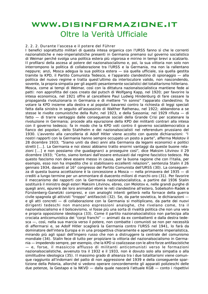 2. 2. 2. Durante l’ascesa e il potere del Führer I benefici soprattutto militari di questa intesa organica con l’URSS fanno sì che le correnti nazionalistiche e neo-imperialistiche presenti in Germania premano sul governo socialistico di Weimar perché svolga una politica estera più vigorosa e mirino in tempi brevi a scalzarlo. Il profilarsi della ascesa al potere del nazionalsocialismo e, poi, la sua vittoria non solo non interrompono la politica di collaborazione tra l’URSS e la Germania, ma non la rallentano neppure; anzi, Mosca adegua la sua politica estera — sia quella ufficiale, sia quella gestita tramite la KPD, il Partito Comunista Tedesco, e l’apparato clandestino di spionaggio — alla politica del nuovo regime e tratta quest’ultimo da interlocutore valido, non nascondendo, sovente, la propria simpatia per gli aspetti pesantemente socialistici del totalitarismo hitleriano. Mosca, come ai tempi di Weimar, così con la dittatura nazionalsocialistica mantiene fede ai patti: non approfitta del caos creato dal putsch di Wolfgang Kapp, nel 1920; per favorire la intesa economica, nel 1921 offre al cancelliere Paul Ludwig Hindenburg di fare cessare la propaganda rivoluzionaria in Germania e di mettere “in sonno” l’apparato clandestino; fa votare la KPD insieme alla destra e ai popolari bavaresi contro la richiesta di leggi speciali fatta dalla sinistra in seguito all’assassinio di Walther Rathenau, nel 1922; abbandona a se stesse le rivolte comunistiche della Ruhr, nel 1923, e della Sassonia; nel 1929 rifiuta — di fatto — di trarre vantaggio dalle conseguenze sociali della Grande Crisi per scatenare la rivoluzione in Germania; procede alla epurazione della KPD dei militanti contrari alla intesa con il governo tedesco; fa in modo che la KPD voti contro il governo socialdemocratico a fianco dei popolari, dello Stahlhelm e dei nazionalsocialisti nel referendum prussiano del 1930. L’avvento alla cancelleria di Adolf Hitler viene accolto con queste dichiarazioni: “I nostri rapporti con la Germania hanno sempre occupato un posto a parte”, afferma Molotov il 28 dicembre 1933; “Siamo uniti da dieci anni alla Germania da legami economici e politici stretti [...]. La Germania e noi stessi abbiamo tratto enormi vantaggi da queste buone relazioni [...] e non possiamo che guadagnarci a proseguire così”, dice Maksim Litvinov il 29 dicembre 1933; “Certo, siamo lontani dall’essere entusiasti dal regime fascistico tedesco. Ma questo fascismo non deve essere messo in causa, per la buona ragione che con l’Italia, per esempio, esso non ha impedito che si stabilissero eccellenti relazioni”, sentenzia Stalin il 26 gennaio 1934, davanti al 16° congresso del Partito Comunista dell’URSS (30). La conseguenza di questa buona accettazione è la concessione a Mosca — nella primavera del 1935 — di crediti a lungo termine per un ammontare di duecento milioni di marchi-oro (31). Per favorire il meccanismo dei rapporti con la Germania nazionalsocialistica, a partire dal 1936 Stalin sostituirà il ministro degli esteri Maksim Litvinov, ebreo, con Molotov e, nelle grandi purghe di quegli anni, epurerà dei loro animatori ebrei le reti clandestine all’estero, Sobelsohn-Radek e Fürstenberg-Ganetzki compresi, e con analoghi intenti getterà nella fornace della guerra civile spagnola gli attivisti “troppo” antifascisti (32). Se, da parte sovietica, le dichiarazioni — e gli atti concreti — di collaborazione con la Germania si moltiplicano, da parte dei nuovi dirigenti tedeschi non mancano espressioni analoghe, che rivelano come, tra il nazionalsocialismo e il bolscevismo, vi fosse più una sorta di rivalità politica che non una vera e propria opposizione ideologica (33). Come il partito nazionalsocialistico non partecipa alla crociata anticomunistica dei “corpi franchi” — animati da ex combattenti e dalla destra tedesca —, così, nella sua marcia verso il potere, non combatte i comunisti se non per necessità di affermarsi e, se Adolf Hitler scaglierà la Germania contro l’URSS nel 1941, lo farà da dominatore dell’intera Europa e in una prospettiva chiaramente e apertamente imperialistica, mirando più agli spazi dell’impero russo che non a distruggere la centrale del comunismo mondiale (34). Stalin fece di tutto per propiziare la vittoria del nazionalsocialismo in Germania — impedendo sempre, per esempio, che la KPD si coalizzasse con le altre forze antifascistiche — e, forse, il massiccio afflusso di militanti anticomunisti verso le formazioni nazionalsocialistiche, avvenuto tra il 1932 e il 1933, non è dovuto solo alla simpatia o alla similitudine ideologica (35). Il massimo grado di alleanza tra i due totalitarismi viene comunque raggiunto all’indomani del patto di non aggressione del 1939 e della conseguente spartizione della Polonia, allorché si vedono operare concordemente gli apparati polizieschi delle due potenze, la Gestapo e la NKVD — dalla quale nascerà l’attuale KGB — conto i rispettivi avversari nel paese occupato. Stalin consegnerà ad Adolf Hitler più di cinquecento comunisti tedeschi e austriaci esuli nell’URSS (36). Se la parte meno “elastica” dell’apparato comunistico mondiale conosce il GULag, quella “ubbidiente” così si esprime, il 9 febbraio 1940, in un articolo apparso in Die Welt di Stoccolma, firmato da Walther Ulbricht e da Herbert Wehner, futuro leader socialdemocratico della Repubblica di Bonn e con cui collabora già da questi anni il futuro cancelliere federale Karl Frahm, detto “Willy Brandt”: “I comunisti tedeschi e gli operai rivoluzionari considerano come criminale il tentativo di alcuni socialdemocratici e dirigenti cattolici di modificare il regime attuale della Germania” (37). 3. Le fonti finanziarie del nazionalsocialismo Come già accennato, Pierre Faillant de Villemarest avanza la fondata ipotesi che per il clan supercapitalistico internazionale, imbevuto di utopie tecno