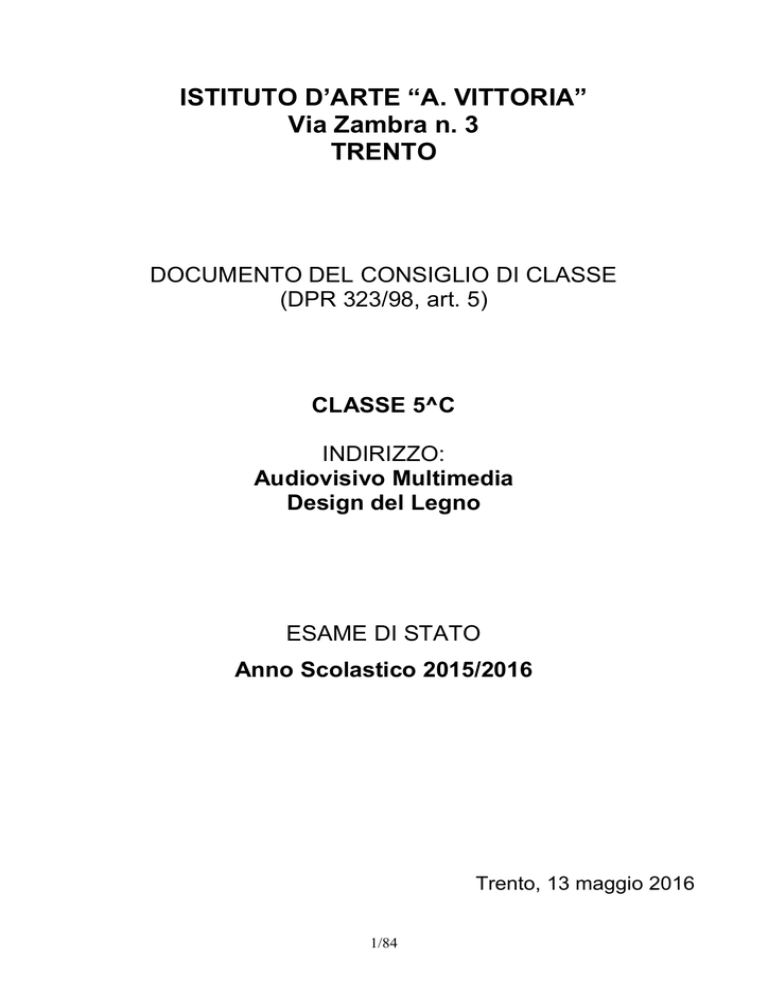 ISTITUTO D’ARTE “A. VITTORIA” Via Zambra n. 3 TRENTO DOCUMENTO DEL CONSIGLIO DI CLASSE (DPR 323/98, art. 5) CLASSE 5^C INDIRIZZO: Audiovisivo Multimedia Design del Legno ESAME DI STATO Anno Scolastico 2015/2016 Trento, 13 maggio 2016 1/84 QUADRO SINTETICO DEL LICEO ARTISTICO “A. VITTORIA” Indirizzi (sezioni) n. classi n. alunni LICEO ARTISTICO (primo biennio) 11 215 LICEO ARTISTICO (secondo biennio) 11 251 Arti Figurative 7* 105 Multimedia 5* 65 Design 6* 57 Architettura e ambiente 2* 24 LICEO ARTISTICO (quinto anno) 4 79 Arti Figurative 1 23 Multimedia 2* 24 Design 3* 21 Architettura e ambiente 1* 11 Totali 26 * classi con la presenza di due indirizzi distinti Laboratori:16 1 Smalti e Microfusioni 1 Tiratura e Forgiatura 7 Arti Figurative 1 Design del Legno con sala macchine 2 Design industriale/Architettura con sala macchine 2 Discipline Plastiche con sala forni 2 Multimedia 1 Chimica 2/84 545 Aule speciali: 22 2 Discipline Grafiche e Pittoriche 2 Disegno Geometrico 5 Progettazione Arti Figurative 1 Progettazione Design del Gioiello 2 Progettazione Architettura e Design 3 Progettazione Multimediale 1 Chimica 1 Palestra 1 Biblioteca 1 Aula Magna 3 Sostegno Aule normali: 13 La situazione dei laboratori ed aule speciali è soddisfacente. E’ invece carente la dotazione di aule normali, che costringe docenti e studenti ad utilizzare, in parte, laboratori o aule speciale per effettuare lezioni di materie dell'area comune. La scuola presenta una percentuale di pendolari media del 60% circa, avendo utenti da quasi tutto il territorio provinciale e dall’Alto Adige, specialmente da Bolzano e paesi attestati lungo la Valle dell’Adige. Molti sono i rapporti di collaborazione tra scuola ed istituzioni o associazioni presenti sul territorio come di seguito evidenziato. 3/84 BREVE PROFILO STORICO L’istituto nacque come sezione staccata dell’Istituto d’Arte di Venezia nel settembre 1953, sotto la direzione del prof. Bruno Colorio, proveniente dalla direzione della Scuola d’Arte di Pozza di Fassa. Dopo un inizio difficile con due sole classi, l’Istituto andò via via rafforzando la propria presenza sul territorio, ottenendo anche il riconoscimento dell’autonomia. Agli inizi si trattava di una scuola di tipo professionale. Chi usciva al termine del triennio superiore col titolo di Maestro d’Arte, poteva proseguire e completare gli studi all’Accademia o, superando un biennio di Magistero a Firenze, Venezia o Trieste, all’Università di Architettura. Con la riforma scolastica del 1970 veniva istituito il biennio unico sperimentale, che prevedeva, al termine del ciclo quinquennale di studi, l’esame di maturità d’Arte applicata che dava libero accesso ai corsi universitari. L’Istituto, dopo il pensionamento del Preside Colorio avvenuto nel 1970, ha visto in pochi anni avvicendarsi alla presidenza i proff. Pacher, Novello, Angelini e Cattani. Dal 1986 al 2010 è stato preside il prof. Sergio Filosi. All’epoca la scuola presentava tre indirizzi formativi: Arte del Legno, Arte del Metallo e Decorazione Pittorica. Dal 1989 l’Istituto ha visto il progressivo dispiegarsi di un’azione di rinnovamento ed adeguamento degli insegnamenti alle mutate esigenze educative in rapporto all’utenza del territorio. E’ stata allora istituita la nuova sezione di Architettura e Arredamento con la successiva soppressione della sezione Arte del Legno; sono state poi attivate le minisperimentazioni della Lingua Inglese e della Matematica con Informatica, pur nella forma dell’opzionalità. Nel settembre 1993 è stato attivato un progetto sperimentale con gli indirizzi di Design e Pittura & Visual Art e nel 2005 è stata avviata la maxisperimentazione con l’indirizzo di Virtual Design. I tre corsi adottavano una struttura di tipo liceale che si concludeva con l’esame di maturità d’Arte applicata ad indirizzo sperimentale che dava accesso all’università. Infine il corso di Arte del Metallo ha assunto la nuova denominazione di Arte dell’oreficeria. A partire dall’anno scolastico 2010/2011 è stata definitivamente attuata la delibera della Giunta Provinciale del 2005 e l’Istituto ha formato, assieme al Liceo Musicale Coreutico “Bonporti” di Trento e all’Istituto d’Arte “Depero” di Rovereto il nuovo “Istituto delle Arti di Trento e Rovereto” dando quindi avvio, sotto la dirigenza del Prof. Cattani, alla riforma dell’istruzione artistica con l’istituzione del nuovo Liceo Artistico con gli indirizzi di Design (del gioello, industriale, del legno), Arti Figurative, Audiovisivo e Multimedia ed Architettura ed Ambiente. Nell'anno scolastico 2012/2013 in seguito al pensionamento del prof. Cattani è stata nominata Dirigente la prof.ssa Elina Massimo e nell'anno 2014/2015 il Prof. Paolo Rasera. Tra le varie attività che hanno visto l’Istituto operare sul territorio va ricordato per il passato la partecipazione pluriennale con lavori degli studenti alla Fiera Internazionale di Monaco di Baviera, a quella nazionale dell’Artigianato di Firenze, a concorsi per il design del mobile alla Triennale Internazionale di Milano; la sezione Metalli ha realizzato l’urna bronzea destinata alla custodia in Duomo delle reliquie dei Martiri Anauniensi (medaglia d’oro di San Vigilio). In anni più recenti, considerando centrale il rapporto scuola – territorio, è stata presentata crescente attenzione alle richieste esterne di collaborazione, che sono utilizzate come utile tirocinio formativo in preparazione al mondo del lavoro. Tra le più importanti vale la pena di ricordare: varie elaborazioni di materiale grafico, quali manifesti, pieghevoli ed altro per la promozione di attività di 4/84 rilevanza sociale per vari enti pubblici e privati; interventi decorativi presso scuole, asili ed anche presso l’ospedale di Trento; costruzioni di oggetti tridimensionali per il Carnevale Tridentino e le Feste Vigiliane; costumi ed allestimenti scenografici per rappresentazio