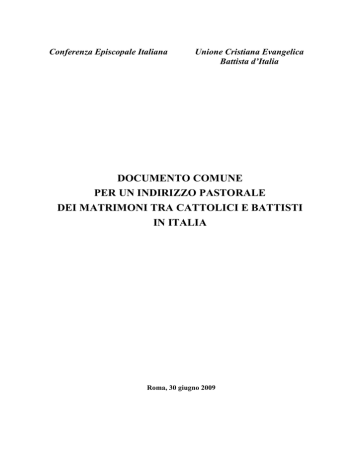 Conferenza Episcopale Italiana Unione Cristiana Evangelica Battista d’Italia DOCUMENTO COMUNE PER UN INDIRIZZO PASTORALE DEI MATRIMONI TRA CATTOLICI E BATTISTI IN ITALIA Roma, 30 giugno 2009 INTRODUZIONE GENERALE La volontà delle Chiese battiste di accedere a un’intesa per i matrimoni con i cattolici è di vecchia data. Risale, infatti, al 16 giugno 1997, al momento della firma del Testo comune per un indirizzo pastorale dei matrimoni tra cattolici e valdesi o metodisti in Italia da parte del Card. Camillo Ruini, Presidente della Conferenza Episcopale Italiana (CEI), dell’Ing. Gianni Rostan, Moderatore della Tavola Valdese, e del pastore Valdo Benecchi, Presidente dell’Opera per le Chiese metodiste in Italia. Visti i rapporti di reciproco riconoscimento esistenti fra le Chiese battiste, metodiste e valdesi in Italia, fu chiesto al Card. Ruini se era possibile estendere anche alle Chiese battiste italiane il contenuto del Testo comune. La risposta fu molto limpida e nello stesso tempo attenta alle diversità teologiche ed ecclesiologiche comunque presenti fra le Chiese battiste da una parte, e metodiste e valdesi dall’altra: se le Chiese battiste possono convenire interamente sulle affermazioni teologiche ed ecclesiologiche presenti nel Testo comune, la firma può essere apposta anche subito. Se invece esistono riserve o comunque visioni diverse su alcune posizioni teologiche ed ecclesiologiche, è bene preparare un nuovo testo, che tenga conto delle convinzioni presenti nelle Chiese battiste. L’Unione Cristiana Evangelica Battista d’Italia (UCEBI) ha così avuto il tempo per riflettere sulla materia, ha nominato una Commissione di studio, composta dal past. Domenico Tomasetto (coordinatore), dal past. Franco Scaramuccia, dal past. Massimo Aprile e dal past. Italo Benedetti (membri), per preparare un proprio Documento sul matrimonio (DM) che, discusso in prima istanza nell’ambito del Collegio Pastorale Battista, è stato poi presentato in Assemblea Generale dell’UCEBI, che l’ha approvato con Atto 32/AG/2004. In seguito a questa approvazione, la Presidente dell’UCEBI, past. Anna Maffei, scriveva all’allora Presidente della CEI, Card. Camillo Ruini, in data 11 gennaio 2005, chiedendo di poter addivenire a un accordo sui matrimoni interconfessionali fra nubendi appartenenti alla Chiesa cattolica e alla Chiese battiste italiane, parallelo a quello intervenuto fra la stessa Conferenza Episcopale e la Tavola Valdese. La risposta del Presidente della CEI, con lettera del 21 marzo 2005, mentre esprimeva la disponibilità della CEI a una intesa simile a quella conclusa con la Tavola Valdese, comunicava che la Commissione Episcopale per l’ecumenismo e il dialogo, alla quale è delegato il rapporto con le altre comunità cristiane, era scaduta per termini regolamentari e si doveva aspettare la nomina della nuova Commissione da parte dell’Assemblea Generale della CEI. Avuta notizia dell’avvenuta nomina della nuova Commissione Episcopale per l’ecumenismo e il dialogo, presieduta da S.E. Mons. Vincenzo Paglia, la Presidente dell’UCEBI, in data 6 settembre 2005, scriveva a Mons. Paglia per avviare i colloqui fra le due commissioni per arrivare a una bozza di un testo comune. Nel frattempo il Comitato Esecutivo dell’UCEBI nominava una Commissione di lavoro, composta dal past. Domenico Tomasetto (coordinatore), dal past. Massimo Aprile, dalla past. Lidia Maggi, dal past. Martin Ibarra y Perez e dal past. Franco Scaramuccia, scomparso nel 2007 (membri). Nel contempo, il Consiglio Episcopale Permanente della CEI nominava la propria Commissione, composta da S.E. Mons. Vincenzo Paglia (presidente), da S.E. Mons. Francesco Coccopalmerio (durante i lavori è stato nominato Presidente del Pontificio Consiglio per i testi legislativi e non sostituito), da mons. Domenico Falco, dal Prof. Giorgio Feliciani, da don Angelo Maffeis e da mons. Mauro Rivella (membri). I lavori congiunti delle due Commissioni sono iniziati presso la sede della CEI il 12 maggio 2006. In quella occasione, oltre a momenti di fraternità, di reciproca conoscenza e di 1 primo scambio di informazioni, si è convenuto che il lavoro da fare avrebbe seguito le procedure già sperimentate per l’accordo fra la CEI e la Tavola Valdese e che il testo del nuovo Documento, con le opportune variazioni, avrebbe assunto come riferimento il Testo comune, già approvato dall’Assemblea Generale della CEI e dal Sinodo Valdese. Nello stesso tempo si è convenuto che i successivi incontri si sarebbero tenuti in sedi alterne, fino alla redazione di una bozza che le due Commissioni avrebbero presentato ai rispettivi organi istituzionali. La Commissione congiunta, dando inizio ai lavori con la nomina a co-presidenti di S.E. Mons. Vincenzo Paglia e del past. Domenico Tomasetto, ha esplicitato i motivi di fondo che spingono all’intesa: da una parte, la necessità di sgombrare la materia da problematiche determinate da lunghi periodi di divisione fra le Chiese cristiane che hanno portato a incomprensioni, tensioni e possibili conflitti fra i nubendi (talora anche solo a livello di coscienza personale o del vissuto psicologico), fra le loro famiglie e le rispettive Chiese di appartenenza, spesso risolti con grave disagio di uno o dell’altro coniuge. In questo senso, ci si è impegnati a sottolineare la comprensione comune del matrimonio celebrato in una Chiesa cristiana, a precisare la portata delle convergenze, a chiarire e appianare le divergenze fra le rispettive comprensioni del matrimonio, senza per questo modificare le relative discipline. Nello stesso tempo, si è inteso far emergere da una parte le responsabilità cui i nubendi vanno incontro, e dall’altra le responsabilità che le Chiese devono assumersi nel preparare la coppia al matrimonio. Si è anche cercato di far emergere e valorizzare sino in fondo l’incidenza dei matrimoni interconfessionali sul percorso ecumenico, quali occasioni per un ripensamento e 
