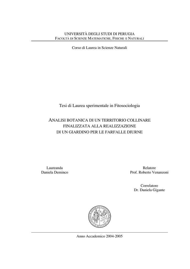 UNIVERSITÀ DEGLI STUDI DI PERUGIA FACOLTÀ DI SCIENZE MATEMATICHE, FISICHE E NATURALI Corso di Laurea in Scienze Naturali Tesi di Laurea sperimentale in Fitosociologia ANALISI BOTANICA DI UN TERRITORIO COLLINARE FINALIZZATA ALLA REALIZZAZIONE DI UN GIARDINO PER LE FARFALLE DIURNE Laureanda Daniela Deminco Relatore Prof. Roberto Venanzoni Correlatore Dr. Daniela Gigante Anno Accademico 2004-2005 INDICE 1. INTRODUZIONE E SCOPO DELLA TESI 4 2. CARATTERISTICHE DELL’AREA DI STUDIO 6 2.1. INQUADRAMENTO DEL TERRITORIO 6 2.2. ASPETTI GEOLOGICI 8 2.3. ASPETTI IDROGEOLOGICI 10 2.4. ASPETTI PEDOLOGICI 11 2.5. ASPETTI CLIMATICI 12 3. MATERIALI E METODI 15 3.1. FLORA 15 3.1.1. Elenco delle forme e delle sottoforme biologiche secondo il sistema di Raunkiaer 16 3.1.2. Elenco delle abbreviazioni adottate per le forme e le sottoforme biologiche secondo il sistema di Raunkiaer 17 3.1.3. Elenco degli Elementi Corologici e delle abbreviazioni adottate 18 3.1.4. Elenco dei simboli utilizzati per indicare la diffusione delle specie in Umbria 21 3.2. VEGETAZIONE 21 4. RISULTATI 23 4.1. FLORA 23 4.1.1. Elenco floristico 23 4.1.2. Commento all’elenco floristico 44 4.2. VEGETAZIONE 44 4.3. IL PAESAGGIO VEGETALE (CONTATTI DINAMICI E SERIE DI VEGETAZIONE) 45 4.3.1. Vegetazione forestale: Aggruppamento a Quercus cerris e Quercus pubescens (Quercetalia pubescentis-petraeae) 2 46 4.3.2. Vegetazione arbustiva: Aggr. a Spartium junceum, Rosa canina e Juniperus communis 46 4.3.3. Vegetazione erbacea: Centaureo bracteatae-Brometum erecti 47 4.4. FARFALLE OSPITI 47 4.4.1. Criteri di selezione delle piante nutrici e delle farfalle ospiti 47 4.4.2. Lista delle piante nutrici e delle farfalle ospiti correlate 50 4.5. CONSERVAZIONE E VALORIZZAZIONE DELLE VARIETA ’ LOCALI DI ALBERI DA 64 FRUTTO 4.5.1. Elenco delle varietà locali di alberi da frutto di possibile impianto 5. PROPOSTA DI REALIZZAZIONE DI UN GIARDINO DELLE FARFALLE 66 68 5.1. GENERALITÀ SUI LEPIDOTTERI 68 5.2. I GIARDINI DELLE FARFALLE 69 5.3. PROGETTO DI UN GIARDINO PER LE FARFALLE DIURNE 71 5.3.1. Premessa 71 5.3.2. Obiettivi 72 5.3.3. Interventi 73 5.3.4. Comunicazione e promozione 75 6. CONSIDERAZIONI CONCLUSIVE 76 7. BIBLIOGRAFIA 77 8. ALLEGATI 82 Carta della Vegetazione Tavole Progetto di Giardino delle farfalle diurne 3 1. INTRODUZIONE E SCOPO DELLA TESI La Tesi di Laurea realizzata si pone come obiettivo principale la valorizzazione di un territorio collinare a scarsa vocazione turistica attraverso la proposta della realizzazione di un “Giardino multifunzionale” che tenga conto nello stesso tempo delle caratteristiche della flora e della vegetazione del territorio circostante, delle piante coltivate e dell’entomofauna con particolare riguardo agli aspetti più strettamente legati all’osservazione della lepidotterofauna umbra. L’idea nasce dalla collaborazione tra il Dipartimento di Biologia vegetale, l’Associazione “Assisi Nature Council” e la Comunità Montana “Valtopina” nella persona di Walter Ruggiti e attualmente del Dr. Diamante Attanasi, che hanno messo a disposizione il territorio oggetto di studio attraverso un comodato d’uso. Nel corso del lavoro ci si è avvalsi, per quanto riguarda gli aspetti relativi alle farfalle, di studi precedenti del Dr. Michele Fumi e della supervisione dei Prof.ri Mario Principato e Carla Corallini. Va comunque sottolineato che la tesi ha carattere prevalentemente botanico e che il principale oggetto di studio è costituito dalla Flora, successivamente interpretata in termini di paesaggio vegetale e potenzialità per lo sviluppo e il mantenimento di popolazioni di lepidotteri diurni. L’idea di creare Giardini per le farfalle non è particolarmente nuova poiché i naturalisti sono da sempre affascinati da questo multicolore gruppo di insetti e dalle loro relazioni con le piante. Negli anni ’70 e ’80 è stato prodotto un gran numero di pubblicazioni su questo argomento e ciò ha incoraggiato la diffusione di numerosi giardini delle farfalle, anche a gestione ‘casalinga’, soprattutto in paesi quali gli Stati Uniti, la Gran Bretagna o l’Australia ma anche l’Italia. Con il lavoro eseguito si intende dare un contributo originale all’approfondimento di una tematica di grande rilevanza ai fini sia della educazione ambientale che della conoscenza e salvaguardia della Biodiversità, partendo da un approccio integrato: vengono infatti presi in considerazione non solo i singoli aspetti botanici o lepidotterologici ma le relazioni tra questi e con l’ambiente. 4 L’area di studio è situata all’interno del Parco Regionale del Monte Subasio e rientra nel piano di Sviluppo Rurale 2000/2006 volto alla tutela del paesaggio con azioni ed interventi di valorizzazione del territorio nelle sue forme integrate di recupero ambientale, turismo ecocompatibile e agricoltura sostenibile. Tale intervento, pertanto, si inserisce bene negli scopi del piano di sviluppo territoriale, ricalcandone gli aspetti peculiari di tutela del paesaggio e di valorizzazione delle risorse del territorio. Inoltre, il progetto proposto si integra con la vocazione turistica di tale area (prevalentemente di tipo agrituristico) arricchendola con iniziative scientifico-divulgative che potranno essere svolte al suo interno. La tutela e la valorizzazione dell’ambiente, del territorio e della diversità biologica, inserita nel Piano di Sviluppo Rurale per l’Umbria 2000/2006, ha consentito la definizione di un’azione finalizzata alla protezione della Biodiversità, che ha trovato naturale collocazione nella misura “Tutela dell’ambiente in relazione all’agricoltura, alla silvicoltura, alla conservazione delle risorse naturali” e che si è concretizzata nel progetto “Valorizzazione delle risorse genetiche agrarie della Regione Umbria” (AA. VV., 2001). La diversità biologica è di fondamentale importanza per la continuità della vita e per la “salute” del pianeta ma è anche una risorsa indispensabile per