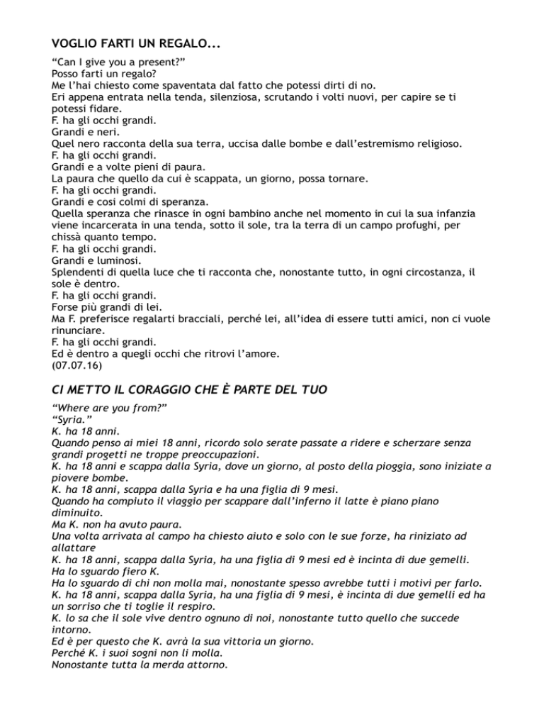 VOGLIO FARTI UN REGALO... “Can I give you a present?” Posso farti un regalo? Me l’hai chiesto come spaventata dal fatto che potessi dirti di no. Eri appena entrata nella tenda, silenziosa, scrutando i volti nuovi, per capire se ti potessi fidare. F. ha gli occhi grandi. Grandi e neri. Quel nero racconta della sua terra, uccisa dalle bombe e dall’estremismo religioso. F. ha gli occhi grandi. Grandi e a volte pieni di paura. La paura che quello da cui è scappata, un giorno, possa tornare. F. ha gli occhi grandi. Grandi e cosi colmi di speranza. Quella speranza che rinasce in ogni bambino anche nel momento in cui la sua infanzia viene incarcerata in una tenda, sotto il sole, tra la terra di un campo profughi, per chissà quanto tempo. F. ha gli occhi grandi. Grandi e luminosi. Splendenti di quella luce che ti racconta che, nonostante tutto, in ogni circostanza, il sole è dentro. F. ha gli occhi grandi. Forse più grandi di lei. Ma F. preferisce regalarti bracciali, perché lei, all’idea di essere tutti amici, non ci vuole rinunciare. F. ha gli occhi grandi. Ed è dentro a quegli occhi che ritrovi l’amore. (07.07.16) CI METTO IL CORAGGIO CHE È PARTE DEL TUO “Where are you from?” “Syria.” K. ha 18 anni. Quando penso ai miei 18 anni, ricordo solo serate passate a ridere e scherzare senza grandi progetti ne troppe preoccupazioni. K. ha 18 anni e scappa dalla Syria, dove un giorno, al posto della pioggia, sono iniziate a piovere bombe. K. ha 18 anni, scappa dalla Syria e ha una figlia di 9 mesi. Quando ha compiuto il viaggio per scappare dall’inferno il latte è piano piano diminuito. Ma K. non ha avuto paura. Una volta arrivata al campo ha chiesto aiuto e solo con le sue forze, ha riniziato ad allattare K. ha 18 anni, scappa dalla Syria, ha una figlia di 9 mesi ed è incinta di due gemelli. Ha lo sguardo fiero K. Ha lo sguardo di chi non molla mai, nonostante spesso avrebbe tutti i motivi per farlo. K. ha 18 anni, scappa dalla Syria, ha una figlia di 9 mesi, è incinta di due gemelli ed ha un sorriso che ti toglie il respiro. K. lo sa che il sole vive dentro ognuno di noi, nonostante tutto quello che succede intorno. Ed è per questo che K. avrà la sua vittoria un giorno. Perché K. i suoi sogni non li molla. Nonostante tutta la merda attorno. Nonostante qualcuno cerchi di calpestarle il futuro. Nonostante il disumano disinteresse del mondo. K. ha già vinto. Ha vinto la luce che porta con se. E non sarà mai troppo buio per spegnere una donna come K. Mai. Io ci scommetto tutto quello che ho. (08.07.16) E TI PROTEGGERÒ PERCHÈ DAVVERO SEI SPECIALE... Ero rimasta da sola nella tenda. Sei arrivata come ogni giorno per disegnare assieme. Hai lasciato le tue ciabatte fuori dalla porta perché conosci bene le regole, nonostante i tuoi 4 anni. Conosci qualche parola di inglese, quando non riesci mi parli in arabo, ma alla fine ci capiamo sempre. Parli con gli occhi, tu. Mi racconti tutta la tua vita, guardandomi. Sei scappata dall’Afghanistan con tutta la tua famiglia. La tua mamma è bella come i fiori quando nascono in primavera. Timidi, ma colorati, proprio come voi. Nei tuoi occhi scorrono i sogni, le paure, ma soprattutto la tua necessità di credere che il bene, nonostante tutto, vive dentro ognuno. Mi hai chiesto di disegnare qualcosa. Abbiamo scritto su un foglio e tu mi raccontavi cosa stavi disegnando. Credo fossero dei mostri, ma tu gli hai messo il sorriso, così tutto era più bello. Alla fine hai voluto fare una foto col tuo capolavoro. “E non aver paura troverai anche ad occhi chiusi, la strada verso casa, la luce ancora accesa.” Cara V. è questo il mio sogno per te, piccola e dolce amica. Perché tu possa trovare la strada. Perché tu possa ritrovare la casa. La luce la porti negli occhi e questa sarà per sempre ciò che ti salverà. Grazie V. Grazie per credere all’amore. (09.07.16) ARRIVI TU, CHE FAI PASSARE LA PAURA DI PRECIPITARE Si dice che negli occhi delle persone viva tutta l’anima che uno ha. Grandi, fin da bimbi, raccolgono all’interno le storie, le paure, le gioie, le lacrime. Raccontano di fallimenti, di vittorie, di scoperte. Raccontano di te, come nient’altro può fare. M. si presenta tutti i giorni, alla stessa ora. Ha 20 mesi, scappa dal Libano, ha visto cose che nessuno dovrebbe mai vedere. Nei suoi occhi, cosi grandi e luminosi, però, la paura coesiste con la voglia di vincere ogni giorno, in questa nuova vita fatta di sogni e speranze. A., la mamma di M., la accompagna ogni mattina a prendere la colazione alla nostra tenda. Oggi ci ha chiesto se potesse lasciarcela un pochino, cosi, dopo averle risposto di si, è rimasta con noi. Avevamo un nuovo vestito da principessa, tutto lilla, con la corona e delle ali brillanti da farfalla. M. l’ha preso, l’ha aperto e con la grazia di una ballerina si è vestita. “Me, princess.” Ha solo 20 mesi, è scappata dalla guerra, vive in un campo profughi, ma parla arabo e un po’ di inglese. Ha ballato per circa 20 minuti, con la grazia di un farfalla. Quando A. è tornata a riprenderla, ha guardato stupita sua figlia e mi ha detto “Is this dress for M.?” No, é per tutti i bambini, le ho detto. Ha aspettato un attimo, poi mi ha chiesto di poterla portare a far vedere al papá, per mostrargli quanto fosse bella. “Torno subito.” É tornata dopo pochissimo tempo, mi osservava, non sapeva come chiedermelo. Poi ha preso coraggio e: ” Mio marito ha chiesto quanti euro vi dobbiamo dare per avere il vestito. Vuole che M. sia bella come una principessa quando saremo in Germania, al suo compleanno.” Ho trattenuto a stento le lacrime, ma non potevo lasciarmi andare. L’ho presa da parte e le ho detto che avremmo cercato un altro vestito da mettere nella tenda, che M. avrebbe potuto festeggiare il suo compleanno come una principessa. Era radiosa, luminosa, bellissima. “Thank you my friend, we love you. Thank you. Thank you.” Non avrei dovuto farlo, ma a volte non si deve pen