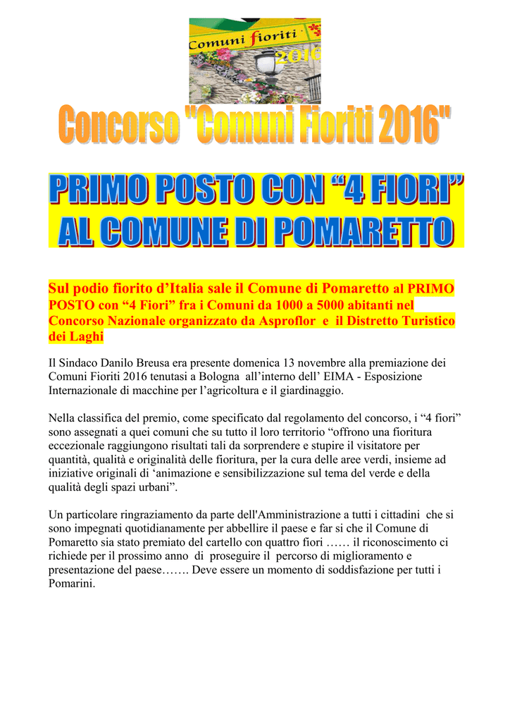 Sul podio fiorito d’Italia sale il Comune di Pomaretto al PRIMO POSTO con “4 Fiori” fra i Comuni da 1000 a 5000 abitanti nel Concorso Nazionale organizzato da Asproflor e il Distretto Turistico dei Laghi Il Sindaco Danilo Breusa era presente domenica 13 novembre alla premiazione dei Comuni Fioriti 2016 tenutasi a Bologna all’interno dell’ EIMA - Esposizione Internazionale di macchine per l’agricoltura e il giardinaggio. Nella classifica del premio, come specificato dal regolamento del concorso, i “4 fiori” sono assegnati a quei comuni che su tutto il loro territorio “offrono una fioritura eccezionale raggiungono risultati tali da sorprendere e stupire il visitatore per quantità, qualità e originalità delle fioritura, per la cura delle aree verdi, insieme ad iniziative originali di ‘animazione e sensibilizzazione sul tema del verde e della qualità degli spazi urbani”. Un particolare ringraziamento da parte dell'Amministrazione a tutti i cittadini che si sono impegnati quotidianamente per abbellire il paese e far si che il Comune di Pomaretto sia stato premiato del cartello con quattro fiori …… il riconoscimento ci richiede per il prossimo anno di proseguire il percorso di miglioramento e presentazione del paese……. Deve essere un momento di soddisfazione per tutti i Pomarini.