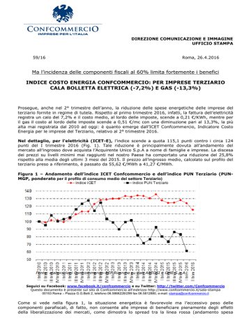 DIREZIONE COMUNICAZIONE E IMMAGINE UFFICIO STAMPA 59/16 Roma, 26.4.2016 Ma l’incidenza delle componenti fiscali al 60% limita fortemente i benefici INDICE COSTO ENERGIA CONFCOMMERCIO: PER IMPRESE TERZIARIO CALA BOLLETTA ELETTRICA (-7,2%) E GAS (-13,3%) Prosegue, anche nel 2° trimestre dell’anno, la riduzione delle spese energetiche delle imprese del terziario fornite in regime di tutela. Rispetto al primo trimestre 2016, infatti, la fattura dell’elettricità registra un calo del 7,2% e il costo medio, al lordo delle imposte, scende a 0,21 €/KWh, mentre per il gas il costo al lordo delle imposte scende a 0,51 €/mc con una diminuzione pari al 13,3%, la più alta mai registrata dal 2010 ad oggi: è quanto emerge dall’ICET Confcommercio, Indicatore Costo Energia per le imprese del Terziario, relativo al 2° trimestre 2016. Nel dettaglio, per l’elettricità (ICET-E), l’indice scende a quota 115,1 punti contro i circa 124 punti del I trimestre 2016 (Fig. 1). Tale riduzione è principalmente dovuta all’andamento del mercato all’ingrosso dove acquista l’Acquirente Unico S.p.A a nome di famiglie e imprese. La discesa dei prezzi su livelli minimi mai raggiunti nel nostro Paese ha comportato una riduzione del 25,8% rispetto alla media degli ultimi 3 mesi del 2015. Il prezzo all’ingrosso medio, calcolato sul profilo del terziario preso a riferimento, è passato da 55,62 €/MWh a 41,27 €/MWh. Figura 1 – Andamento dell’indice ICET Confcommercio e dell’indice PUN Terziario (PUNMGP, ponderato per il profilo di consumo medio del settore Terziario) Fonte: elaborazioni Confcommercio-REF Ricerche su dati AEEGSI e GME S.p.A. Seguici su Facebook: www.facebook.it/confcommercio e su Twitter: http://twitter.com/Confcommercio Questo documento è presente sul sito di Confcommercio all’indirizzo http://www.confcommercio.it/sala-stampa 00153 Roma – Piazza G.G.Belli 2, telefono 06.5866228/299 fax 06.5812880, e-mail: [email protected] Come si vede nella figura 1, la situazione energetica è favorevole ma l’eccessivo peso delle componenti parafiscali, di fatto, non consente alle imprese di beneficiare pienamente degli effetti della liberalizzazione dei mercati, come dimostra lo spread tra la linea rossa (andamento spesa lorda) e la linea nera (andamento spesa per materia prima netta) e il non allineamento tra le due linee dovuto alla crescita degli oneri di sistema. In questa fase congiunturale, è importante, per quelle imprese che acquistano nel mercato libero, richiedere un adeguamento delle condizioni e dei prezzi soprattutto per coloro che hanno sottoscritto contratti non di recente. Sul piano tendenziale il secondo semestre 2016 conferma una similare riduzione, anch’essa intorno al 7%, della spesa per l’acquisto di energia rispetto allo stesso periodo dell’anno scorso (Fig. 2). Figura 2 – Variazioni congiunturali e tendenziali dell’indice ICET-E Fonte: elaborazioni Confcommercio-REF Ricerche su dati AEEGSI e GME S.p.A. Preoccupa il peso marginale del “bene chilowattora” rispetto al peso delle altre componenti. In particolare gli oneri di sistema che incidono per un valore record del 35,2%. Percentuale destinata a salire in considerazione dell’attuale sospensione del pagamento di una componente (AE). Complessivamente il peso delle componenti fiscali e parafiscali (oneri, accisa ed imposta sul valore aggiunto) si attesta al 59,1% rispetto ad un’incidenza del 56,1% relativa allo stesso periodo del 2015. Figura 3 – Confronto composizione media percentuale delle voci di spesa per la fornitura di energia elettrica del settore Terziario, regime di maggior tutela Fonte: elaborazioni Confcommercio-REF Ricerche su dati AEEGSI Per quanto riguarda le spese relative all’acquisto di GAS (ICET-G), nel secondo trimestre 2016 l’Indice ICET-G, che misura l’andamento medio della spesa per la fornitura di gas naturale 2 sostenuta dai profili tipo di imprese del settore dei servizi, registra una contrazione del 13,3% rispetto al trimestre precedente. Si tratta del calo più alto mai registrato dal 2010, inizio delle pubblicazioni dell’ICET. L’Indice ICET-G scende a quota 97,4 punti contro i 109,32 del primo trimestre 2016. Figura 4 - Andamento dell’indice ICET-G e dell’indice Pfor* (Indici I trim 2010 = 100) Indice ICETgas Indice materia prima I-2016 II-2016 II-2015 III-2015 IV-2015 IV-2014 I-2015 I-2014 II-2014 III-2014 III-2013 IV-2013 I-2013 II-2013 IV-2012 II-2012 III-2012 III-2011 IV-2011 I-2012 I-2011 II-2011 III-2010 IV-2010 I-2010 II-2010 190 180 170 160 150 140 130 120 110 100 90 80 70 60 50 Fonte: elaborazioni Confcommercio-REF Ricerche su dati AEEGSI Notevole la contrazione della spesa attesa rispetto a quella di un anno prima. Si registra infatti un ribasso del 19% dovuto principalmente al crollo del prezzo della materia prima sui mercati all’ingrosso, come rilevato dalla contrazione pari al 31%, nel secondo trimestre 2016, dell’indice Pfor pubblicato dall’Autorità per l’energia. A differenza di quanto accade per l’elettricità, la Figura 4 evidenzia il sostanziale allineamento tra l’evoluzione dei prezzi all’ingrosso della materia prima gas e l’andamento della spesa per l’acquisto di gas misurata dall’indice ICET-gas. Ciò comporta che i benefici della concorrenza si trasferiscono totalmente sulle fatture delle imprese. Figura 5 - Variazioni congiunturali e tendenziali dell’indice ICET-G Fonte: elaborazioni Confcommercio-REF Ricerche su dati AEEGSI La contrazione dell’indice ICET-G nel secondo trimestre 2016 è principalmente riconducibile al crollo del prezzo della componente materia prima (-21,6% rispetto al primo trimestre 2016, -32% rispetto 3 al medesimo periodo dello scorso anno), e dalla spesa a copertura degli oneri infrastrutturali che diminuisce del 2,5% su base congiunturale. In seguito all’ultimo aggiornamento, le componenti del costo della fornitura registrano alcune variazioni rispetto ad un anno prima: il p