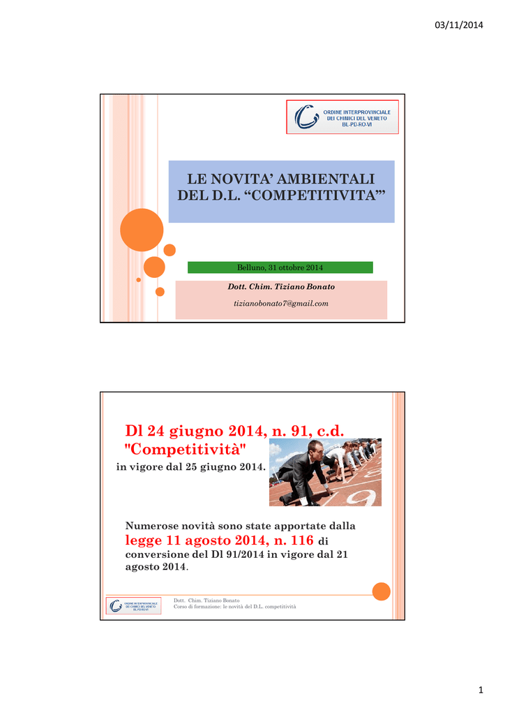 03/11/2014 LE NOVITA’ AMBIENTALI DEL D.L. “COMPETITIVITA’” Belluno, 31 ottobre 2014 Dott. Chim. Tiziano Bonato [email protected] Dl 24 giugno 2014, n. 91, c.d. "Competitività" in vigore dal 25 giugno 2014. Numerose novità sono state apportate dalla legge 11 agosto 2014, n. 116 di conversione del Dl 91/2014 in vigore dal 21 agosto 2014. Dott. Chim. Tiziano Bonato Corso di formazione: le novità del D.L. competitività 1 03/11/2014 Temi: Acque Aria Danno ambientale e bonifiche Energia Imballaggi IPPC/Aia Rifiuti Rumore Territorio Via/Vas Dott. Chim. Tiziano Bonato Corso di formazione: le novità del D.L. competitività DANNO AMBIENTALE E BONIFICHE Procedura semplificata art. 13, c. 1-3 Nuova procedura semplificata per le operazioni di bonifica del suolo (nuovo art. 242-bis al TUA) Attivabile da qualsiasi "operatore interessato" a effettuare, a proprie spese, la riduzione della contaminazione dell'area al di sotto delle concentrazioni soglia di contaminazione (C.S.C.) Al termine Validazione di ARPA del piano di campionamento di collaudo finale Certificazione di avvenuta bonifica Dott. Chim. Tiziano Bonato Corso di formazione: le novità del D.L. competitività 2 03/11/2014 Concentrazioni soglia di contaminazione, art. 13, c. 3-bis Voce 13 della tabella allegata al "Codice ambientale", recante "Concentrazione soglia di contaminazione nel suolo e nel sottosuolo riferiti alla specifica destinazione d'uso dei siti da bonificare", la voce stagno " " viene sostituita con la voce "Composti organostannici" (i valori limite rimangono invariati). col. A 1 mg/kg s.s. ISO 23161 per i terreni, fanghi e sedimenti Come somma? derivatizzazione con tetraetilborato e successiva analisi gascromatografica con detector MS Dott. Chim. Tiziano Bonato Corso di formazione: le novità del D.L. competitività Alcune e novità in materia di ENERGIA: Semplificazione autorizzazione impianti Fer – art. 30, c. 1 Per gli impianti a fonti rinnovabili per i quali è prevista la comunicazione al Comune (articolo 6, comma 11, Dlgs 28/2011), un unico modello che sostituisce dal 1° ottobre 2014 quello adottato dai Comuni, che deve essere approvato dal Min. Sviluppo. Le installazioni di impianti a fonti rinnovabili su edifici se realizzate in area non vincolata e rispettando una serie di caratteristiche tecniche di installazione come individuate dall'articolo 11, comma 3, Dlgs 115/2008, possono essere realizzate solo con comunicazione al Comune senza aggiunta di altra documentazione. Dott. Chim. Tiziano Bonato Corso di formazione: le novità del D.L. competitività 3 03/11/2014 Autorizzazione impianti a biometano, art. 30, c. 2 Con l'aggiunta dell'articolo 8-bis al Dlgs 28/2011 si estendono l'autorizzazione unica (articolo 5, Dlgs 28/2011) e la Pas, procedura abilitativa semplificata ex articolo 6, Dlgs 28/2011, come titoli autorizzatori per gli impianti a biometano. Il termine Biometano si riferisce a un biogas che ha subito un processo di raffinazione per arrivare ad una concentrazione di metano del 95% ed è utilizzato come biocombustibile per veicoli a motore al pari del gas naturale (o metano fossile) Dott. Chim. Tiziano Bonato Corso di formazione: le novità del D.L. competitività Riconversione zuccherifici : art. 30-ter Modifiche al Dl 5/2012, convertito in legge 35/2012 per rilanciare la riconversione industriale degli zuccherifici, "prevalentemente nel settore della produzione di energia da fonti rinnovabili". Dott. Chim. Tiziano Bonato Corso di formazione: le novità del D.L. competitività 4 03/11/2014 Sanzioni sacchetti di plastica: art. 11, c. 2-bis Per effetto della modifica apportata all'articolo 2, comma 4, Dl 2/2012, convertito in legge 28/2012, le sanzioni per chi commercializza sacchetti monouso che non siano biodegradabili e compostabili o sacchetti riutilizzabili con spessori diversi da quelli previsti dalla legge, entrano in vigore subito e non più decorsi 60 giorni dall'emanazione dei decreti "tecnici", come previsto in origine. polimeri conformi alla norma armonizzata UNI EN 13432:2002 Da 2.500 euro a 25mila euro, e può essere aumentata fino al quadruplo del massimo (100mila euro), se la violazione del divieto riguarda “quantità ingenti” di sacchetti oppure un valore della merce superiore al 20 per cento del fatturato del trasgressore. Dott. Chim. Tiziano Bonato Corso di formazione: le novità del D.L. competitività Beni in polietilene: art. 14, c. 8, lett. b-quinquies Riscritto il comma 2, articolo 234, "Codice ambientale" sul consorzio dei beni in polietilene. La norma precisa cosa siano i "beni in polietilene", per tali intendendosi i beni composti interamente da polietilene individuati con Dm Ambiente. Ogni 3 anni il MinAmbiente verifica l'elenco dei beni in polietilene. In fase di prima attuazione finché non viene emanato il citato Dm, per beni in polietilene si intendono i teli e le reti ad uso agricolo quali i film per copertura di serre e tunnel, film per lo copertura di vigneti e frutteti, film per pacciamatura, film per insilaggio, film per la protezione di attrezzi e prodotti agricoli, film per pollai, le reti ombreggianti, di copertura e di protezione. Dott. Chim. Tiziano Bonato Corso di formazione: le novità del D.L. competitività 5 03/11/2014 Alcune novità in materia di IPPC/AIA ILVA Imprese sottoposte a commissariamento: art. 22-quater Si tratta delle norme in parte già contenute nel Dl 100/2014 che vengono "trasfuse" con modifiche nel presente articolo. Possibilità per le imprese "commissariate" per motivi di tutela ambientale di ricorrere a finanziamenti prededucibili funzionali a porre in essere le misure di tutela ambientale o continuare l'esercizio dell'impresa. La "funzionalità" è attestata dal MinAmbiente. Rispetto al Dl 100/2014, la norma del presente articolo prevede la possibilità per il Giudice di "sbloccare" i beni sequestrati all'impresa commissariata, trasferendoli alla stessa impresa su richiesta del commissario straordinario, se questi beni serv