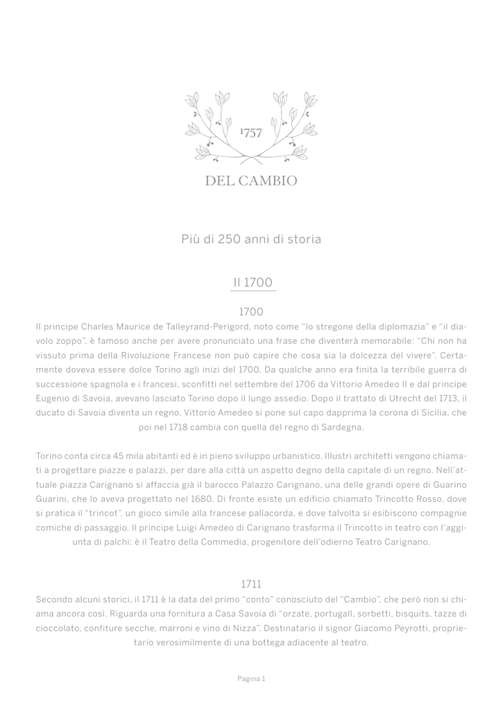 Più di 250 anni di storia Il 1700 1700 Il principe Charles Maurice de Talleyrand-Perigord, noto come “lo stregone della diplomazia” e “il diavolo zoppo”, è famoso anche per avere pronunciato una frase che diventerà memorabile: “Chi non ha vissuto prima della Rivoluzione Francese non può capire che cosa sia la dolcezza del vivere”. Certamente doveva essere dolce Torino agli inizi del 1700. Da qualche anno era finita la terribile guerra di successione spagnola e i francesi, sconfitti nel settembre del 1706 da Vittorio Amedeo II e dal principe Eugenio di Savoia, avevano lasciato Torino dopo il lungo assedio. Dopo il trattato di Utrecht del 1713, il ducato di Savoia diventa un regno. Vittorio Amedeo si pone sul capo dapprima la corona di Sicilia, che poi nel 1718 cambia con quella del regno di Sardegna. Torino conta circa 45 mila abitanti ed è in pieno sviluppo urbanistico. Illustri architetti vengono chiamati a progettare piazze e palazzi, per dare alla città un aspetto degno della capitale di un regno. Nell’attuale piazza Carignano si affaccia già il barocco Palazzo Carignano, una delle grandi opere di Guarino Guarini, che lo aveva progettato nel 1680. Di fronte esiste un edificio chiamato Trincotto Rosso, dove si pratica il “trincot”, un gioco simile alla francese pallacorda, e dove talvolta si esibiscono compagnie comiche di passaggio. Il principe Luigi Amedeo di Carignano trasforma il Trincotto in teatro con l’aggiunta di palchi: è il Teatro della Commedia, progenitore dell’odierno Teatro Carignano. 1711 Secondo alcuni storici, il 1711 è la data del primo “conto” conosciuto del “Cambio”, che però non si chiama ancora così. Riguarda una fornitura a Casa Savoia di “orzate, portugall, sorbetti, bisquits, tazze di cioccolato, confiture secche, marroni e vino di Nizza”. Destinatario il signor Giacomo Peyrotti, proprietario verosimilmente di una bottega adiacente al teatro. Pagina 1 1721 L’acquavitaro Giovanni Marco Benedetto ottiene in sublocazione la bottega che funziona come “buvette” interna al Teatro. La gestisce insieme alla moglie e a due garzoni, servendo gli ospiti delle rappresentazioni anche dentro la sala. 1752 Cominciano i lavori per la costruzione del nuovo Teatro, su disegno di Benedetto Alfieri. 1757 Nasce ufficialmente il “Cambio”: è il 5 ottobre quando un certo Giuseppe Ignazio Baldassare Vigna, assistito dalla madre in quanto ancora minore d’età, ottiene il permesso di edificare, su disegno dell’architetto Antonio Bellino, l’edificio che sarà sede del caffè e poi ristorante Del Cambio. Ma perché viene chiamato così? Gli storici si dividono nel dare le loro spiegazioni. Il “cambio” poteva essere quello dei cavalli di posta dei viaggiatori, in transito da e verso Parigi, che a quanto pare sostavano in quella zona. C’è chi afferma invece che il nome sia legato al fatto che nel locale si cambiasse la moneta, visto che la piazza era il ritrovo della “gente d’affari e di commercio”. C’è di più: il caffè sarebbe stato addirittura “la borsa dei negozianti”. Dina Rebaudengo, memorialista della vecchia Torino e autrice di un libro sul locale uscito in occasione del restauro del 1973, ritiene che il nome derivi invece dal “Consolato de’ Cambj, Negozi ed Arti in Torino”, da cui dipendeva l’Università dei confettieri e distillatori d’acquavite. 1759 É l’anno del passaggio del celebre avventuriero e seduttore veneziano Giacomo Casanova, che cita espressamente il “Cambio” nelle sue memorie. Naturalmente ci capita per un intrigo amoroso. 1767 Il proprietario del caffè risulta il caffettiere, acquavitaro e confettiere Lorenzo Gazzola, che probabilmente lo gestisce fin dalla fondazione di dieci anni prima. Alla morte, poi, gli succederà la moglie Margarita. 1768 L’edificio che ospita il caffè passa di proprietà. Il prezzo di vendita è cinquantacinquemila lire. Il nuovo proprietario - dei muri, non dell’esercizio - è il banchiere Giovanni Francesco Domenico Morello. Il caffè è ancora limitato alle sale più antiche: quelle oggi d’ingresso e sul retro, a volta. L’attuale salone Risorgimento è ancora soltanto un porticato aperto. 1786 Un incendio distrugge buona parte del Teatro Carignano, che viene subito ricostruito. Pagina 2 Il 1800 1798–1814 A causa delle guerre in corso in Europa, il Piemonte viene occupato dai francesi di Napoleone Bonaparte. Torino diventa capoluogo del Dipartimento dell’Eridano. Dopo una breve parentesi di occupazione russa fra il 1799 e i primi mesi 1800, Napoleone, vincendo la battaglia di Marengo, si riprende Torino e il Piemonte fino al 1814, affidandone il controllo a Camillo Borghese e, soprattutto, a sua sorella Paolina Bonaparte. Nei documenti e nelle guide di allora il “Cambio” – “Cambj” in piemontese – è citato come Café du Change. In questo periodo, anche se non si sa esattamente quando, apre la Farmacia all’angolo fra la piazza e l’attuale via Cesare Battisti. 1819–1831 Il proprietario del caffè, nel 1819, è Pietro Cavalchini. In città, intanto, sono tornati i Savoia. Sono anni di lotte fra conservatori e fautori di un cambiamento del regno in senso costituzionale: la piazza è teatro di moti e proteste popolari. 1831 Dopo la scomparsa di Carlo Felice, sale al trono Carlo Alberto, l’amletico sovrano che promuove comunque lo sviluppo del Piemonte e di Torino, riorganizzando l’economia e dando impulso all’istruzione. Alla morte di Cavalchini, il caffè passa in mano a Pietro Cavallo, ultimo sindaco dell’Università dei distillatori e confettieri. Il nuovo gestore ha il merito di abbellire il locale, che sotto la sua guida diventa anche ristorante. 1840 Il “Cambio” è fra i primi caffè, in città, a dotarsi dell’illuminazione a gas. 1842 Al termine di una lunghissima disputa legale, la famiglia Morello ottiene di poter chiudere, con una struttura in legno e invetriate, la parte di portico antistant