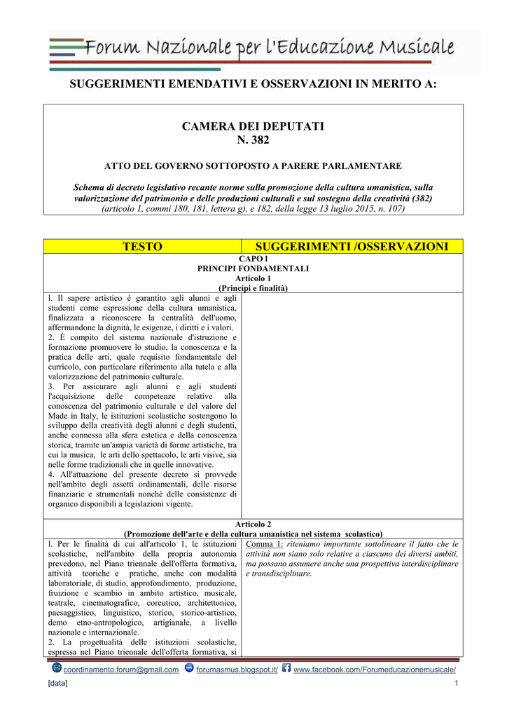 SUGGERIMENTI EMENDATIVI E OSSERVAZIONI IN MERITO A: CAMERA DEI DEPUTATI N. 382 ATTO DEL GOVERNO SOTTOPOSTO A PARERE PARLAMENTARE Schema di decreto legislativo recante norme sulla promozione della cultura umanistica, sulla valorizzazione del patrimonio e delle produzioni culturali e sul sostegno della creatività (382) (articolo 1, commi 180, 181, lettera g), e 182, della legge 13 luglio 2015, n. 107) TESTO SUGGERIMENTI /OSSERVAZIONI CAPO l PRINCIPI FONDAMENTALI Articolo 1 (Principi e finalità) l. Il sapere artistico è garantito agli alunni e agli studenti come espressione della cultura umanistica, finalizzata a riconoscere la centralità dell'uomo, affermandone la dignità, le esigenze, i diritti e i valori. 2. È compito del sistema nazionale d'istruzione e formazione promuovere lo studio, la conoscenza e la pratica delle arti, quale requisito fondamentale del curricolo, con particolare riferimento alla tutela e alla valorizzazione del patrimonio culturale. 3. Per assicurare agli alunni e agli studenti l'acquisizione delle competenze relative alla conoscenza del patrimonio culturale e del valore del Made in Italy, le istituzioni scolastiche sostengono lo sviluppo della creatività degli alunni e degli studenti, anche connessa alla sfera estetica e della conoscenza storica, tramite un'ampia varietà di forme artistiche, tra cui la musica, le arti dello spettacolo, le arti visive, sia nelle forme tradizionali che in quelle innovative. 4. All'attuazione del presente decreto si provvede nell'ambito degli assetti ordinamentali, delle risorse finanziarie e strumentali nonché delle consistenze di organico disponibili a legislazioni vigente. Articolo 2 (Promozione dell'arte e della cultura umanistica nel sistema scolastico) l. Per le finalità di cui all'articolo 1, le istituzioni Comma 1: riteniamo importante sottolineare il fatto che le scolastiche, nell'ambito della propria autonomia attività non siano solo relative a ciascuno dei diversi ambiti, prevedono, nel Piano triennale dell'offerta formativa, ma possano assumere anche una prospettiva interdisciplinare attività teoriche e pratiche, anche con modalità e transdisciplinare. laboratoriale, di studio, approfondimento, produzione, fruizione e scambio in ambito artistico, musicale, teatrale, cinematografico, coreutico, architettonico, paesaggistico, linguistico, storico, storico-artistico, demo etno-antropologico, artigianale, a livello nazionale e internazionale. 2. La progettualità delle istituzioni scolastiche, espressa nel Piano triennale dell'offerta formativa, si [email protected] [data] forumasmus.blogspot.it/ www.facebook.com/Forumeducazionemusicale/ 1 realizza mediante specifiche iniziative e percorsi Viste le considerazioni espresse in Premessa, ci sembra curricolari ed extra-curriculari, anche in verticale, e importante che venga esplicitata la presenza del Terzo può essere programmata in rete con altre scuole e Settore fra i soggetti; quindi suggeriamo di nominarlo nella attuata con la collaborazione di istituti e luoghi della frase finale del Comma 2. cultura, nonché di altri soggetti pubblici e privati. Articolo 3 (I temi della creatività) l. La progettazione delle istituzioni scolastiche si avvale della sinergia tra i linguaggi artistici e le nuove tecnologie, valorizzando le esperienze di ricerca e innovazione, c si realizza nell'ambito delle componenti del curricolo, anche verticale, denominate "temi della creatività", che riguardano le seguenti aree: a) musicale-coreutico, tramite la conoscenza e la pratica musicale nella più ampia accezione, della pratica dello strumento, del canto e della danza; b) teatrale-performativo, tramite la conoscenza e la pratica dell'arte teatrale o cinematografica o di altre forme di spettacolo artistico-performativo; c) artistico-visivo, tramite la conoscenza della storia dell'arte e la pratica della pittura, della scultura, della grafica, delle arti decorative, del design o di altre forme artistiche, anche connesse con l'artigianato artistico e con le produzioni di qualità del Made in Italy; d) linguistico-creativo, tramite la conoscenza e la pratica della scrittura creativa, della poesia e di altre forme simili di espressione, della lingua italiana, dei linguaggi e dei dialetti CAPO II ORGANIZZAZIONE PER LA PROMOZIONE DELLA CULTURA UMANISTICA, DEL PATRIMONIO ARTISTICO E DELLA CREATIVITA Articolo 4 (Sistema coordinato di progettazione per la promozione dei “temi della creatività” nel sistema nazionale di istruzione e formazione) 1. Il Ministero dell'istruzione, dell'università e della ricerca, il Ministero dei beni e delle attività culturali e del turismo e i suoi istituti, l'Istituto nazionale documentazione, innovazione e ricerca educativa (INDIRE), le istituzioni scolastiche, le Istituzioni dell'alta formazione artistica, musicale e coreutica (AFAM), gli Istituti tecnici superiori (ITS), gli Istituti di cultura italiana all'estero concorrono, nell'ambito delle risorse umane, finanziarie e strumentali disponibili a legislazione vigente, a realizzare un sistema coordinato per la progettazione e la promozione della conoscenza e della pratica delle arti, quale requisito fondamentale del curricolo di ciascun grado di istruzione del sistema nazionale di istruzione e formazione. 2. Fanno parte del sistema dì cui al comma 1, i soggetti pubblici e privati, specificatamente accreditati dal Ministero dell'istruzione, dell'università e della ricerca e dal Ministero dei beni e delle attività culturali e del Turismo, secondo i requisiti fissati da apposito protocollo di intesa stipulato dai rispettivi Ministri. [email protected] [data] Comma 1: L’articolo 4 indica i soggetti coinvolti nella realizzazione di “un sistema coordinato per la progettazione e la promozione della conoscenza e della pratica delle arti”, ma non i concreti strumenti per attuarlo. La presenza di un Tavolo nazionale di coordinamento costituito dai soggetti di cui al comma 1 può ovviare in parte a questa