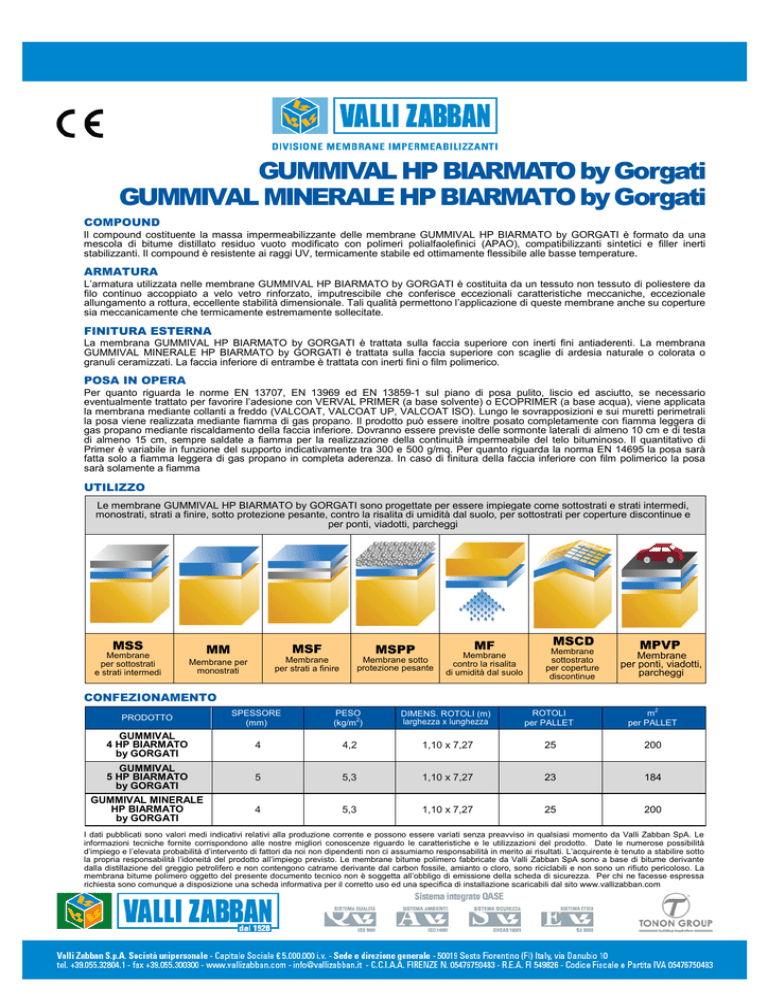 GUMMIVAL HP BIARMATO by Gorgati GUMMIVAL MINERALE HP BIARMATO by Gorgati COMPOUND Il compound costituente la massa impermeabilizzante delle membrane GUMMIVAL HP BIARMATO by GORGATI è formato da una mescola di bitume distillato residuo vuoto modificato con polimeri polialfaolefinici (APAO), compatibilizzanti sintetici e filler inerti stabilizzanti. Il compound è resistente ai raggi UV, termicamente stabile ed ottimamente flessibile alle basse temperature. ARMATURA L’armatura utilizzata nelle membrane GUMMIVAL HP BIARMATO by GORGATI è costituita da un tessuto non tessuto di poliestere da filo continuo accoppiato a velo vetro rinforzato, imputrescibile che conferisce eccezionali caratteristiche meccaniche, eccezionale allungamento a rottura, eccellente stabilità dimensionale. Tali qualità permettono l’applicazione di queste membrane anche su coperture sia meccanicamente che termicamente estremamente sollecitate. FINITURA ESTERNA La membrana GUMMIVAL HP BIARMATO by GORGATI è trattata sulla faccia superiore con inerti fini antiaderenti. La membrana GUMMIVAL MINERALE HP BIARMATO by GORGATI è trattata sulla faccia superiore con scaglie di ardesia naturale o colorata o granuli ceramizzati. La faccia inferiore di entrambe è trattata con inerti fini o film polimerico. POSA IN OPERA Per quanto riguarda le norme EN 13707, EN 13969 ed EN 13859-1 sul piano di posa pulito, liscio ed asciutto, se necessario eventualmente trattato per favorire l’adesione con VERVAL PRIMER (a base solvente) o ECOPRIMER (a base acqua), viene applicata la membrana mediante collanti a freddo (VALCOAT, VALCOAT UP, VALCOAT ISO). Lungo le sovrapposizioni e sui muretti perimetrali la posa viene realizzata mediante fiamma di gas propano. Il prodotto può essere inoltre posato completamente con fiamma leggera di gas propano mediante riscaldamento della faccia inferiore. Dovranno essere previste delle sormonte laterali di almeno 10 cm e di testa di almeno 15 cm, sempre saldate a fiamma per la realizzazione della continuità impermeabile del telo bituminoso. Il quantitativo di Primer è variabile in funzione del supporto indicativamente tra 300 e 500 g/mq. Per quanto riguarda la norma EN 14695 la posa sarà fatta solo a fiamma leggera di gas propano in completa aderenza. In caso di finitura della faccia inferiore con film polimerico la posa sarà solamente a fiamma UTILIZZO Le membrane GUMMIVAL HP BIARMATO by GORGATI sono progettate per essere impiegate come sottostrati e strati intermedi, monostrati, strati a finire, sotto protezione pesante, contro la risalita di umidità dal suolo, per sottostrati per coperture discontinue e per ponti, viadotti, parcheggi MSS Membrane per sottostrati e strati intermedi MF MM MSF MSPP Membrane per monostrati Membrane per strati a finire Membrane sotto protezione pesante Membrane contro la risalita di umidità dal suolo MSCD Membrane sottostrato per coperture discontinue MPVP Membrane per ponti, viadotti, parcheggi CONFEZIONAMENTO 2 PRODOTTO SPESSORE (mm) PESO (kg/m2) DIMENS. ROTOLI (m) larghezza x lunghezza ROTOLI per PALLET m per PALLET GUMMIVAL 4 HP BIARMATO by GORGATI 4 4,2 1,10 x 7,27 25 200 GUMMIVAL 5 HP BIARMATO by GORGATI 5 5,3 1,10 x 7,27 23 184 GUMMIVAL MINERALE HP BIARMATO by GORGATI 4 5,3 1,10 x 7,27 25 200 I dati pubblicati sono valori medi indicativi relativi alla produzione corrente e possono essere variati senza preavviso in qualsiasi momento da Valli Zabban SpA. Le informazioni tecniche fornite corrispondono alle nostre migliori conoscenze riguardo le caratteristiche e le utilizzazioni del prodotto. Date le numerose possibilità d’impiego e l’elevata probabilità d’intervento di fattori da noi non dipendenti non ci assumiamo responsabilità in merito ai risultati. L’acquirente è tenuto a stabilire sotto la propria responsabilità l’idoneità del prodotto all’impiego previsto. Le membrane bitume polimero fabbricate da Valli Zabban SpA sono a base di bitume derivante dalla distillazione del greggio petrolifero e non contengono catrame derivante dal carbon fossile, amianto o cloro, sono riciclabili e non sono un rifiuto pericoloso. La membrana bitume polimero oggetto del presente documento tecnico non è soggetta all’obbligo di emissione della scheda di sicurezza. Per chi ne facesse espressa richiesta sono comunque a disposizione una scheda informativa per il corretto uso ed una specifica di installazione scaricabili dal sito www.vallizabban.com GUMMIVAL HP BIARMATO by Gorgati GUMMIVAL MINERALE HP BIARMATO by Gorgati Codice di notifica O.N.: Numero certificato FPC: Tipo di armatura: Tipo di mescola: Finitura superficiale: 1370 (riferito solamente alle norme EN 13707 / EN 13969 / EN 14695) 1370-CPR-0042 (riferito solamente alle norme EN 13707 / EN 13969 / EN 14695) Tessuto non tessuto di poliestere da filo continuo accoppiato a velo vetro rinforzato. Bitume modificato con polialfaolefine (APAO). - Faccia superiore: (GUMMIVAL HP BIARMATO by Gorgati) inerti fini, (GUMMIVAL MINERALE HP BIARMATO by Gorgati) scaglie di ardesia naturale o colorata; - Faccia inferiore: inerti fini o film polimerico Metodo di applicazione: Collanti a caldo, collanti a freddo, fiamma leggera di gas propano, per EN 14695 e finitura faccia inferiore con film polimerico solo fiamma leggera di gas propano NB. IN OGNI CASO, PER UN CORRETTO UTILIZZO DEL PRODOTTO, SI DEVE FARE RIFERIMENTO AI DOCUMENTI TECNICI DEL PRODUTTORE. VALORI NOMINALI DESCRIZIONE DELLA PROVA NORMA DI RIFERIMENTO UNITÀ DI MISURA GUMMIVAL 4 HP BIARMATO by Gorgati GUMMIVAL MINERALE HP BIARMATO by Gorgati TOLLERANZE Norme di riferimento UNI EN 13707 / 13969 / 14695 13707 / 13859-1 Destinazione d’uso - - MSS / MM / MSF / MSPP / MF / MPVP MSS / MM / MSF / MSPP / MF / MPVP MM / MSF / MSCD Difetti visibili UNI EN 1850-1 - Supera Supera Supera - Lunghezza UNI EN 1848-1 m 7,27 - 1% 7,27 - 1% 5,00 - 1% Minimo Larghezza UNI EN 1848-1 m 1,10 - 1% 1,10 - 1% 1,10 - 1% Minimo Rettilineità UNI EN 1848-1 mm 20 mm x 10 m 20 mm x 10