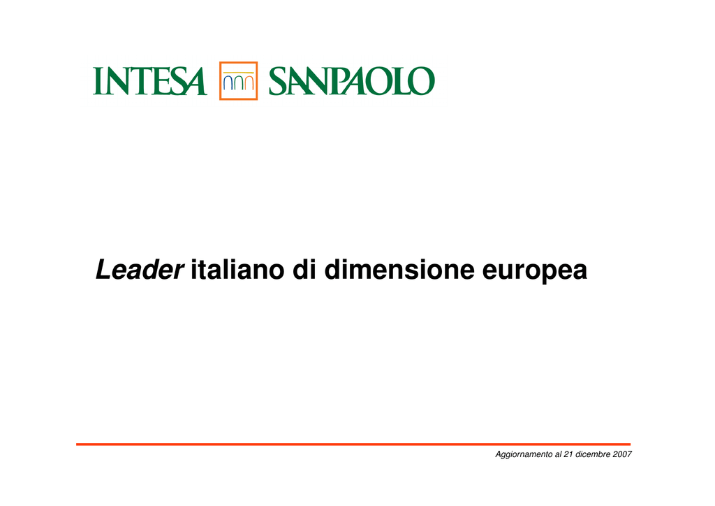Leader italiano di dimensione europea Aggiornamento al 21 dicembre 2007 La storia di Intesa Sanpaolo 1998 2000 2001 2002 2007 2 Banca leader in Italia di dimensione europea Il leader in Italia Leader in tutti i segmenti con una quota di mercato di circa il 19% nei crediti e nei depositi con la clientela Leadership nei prodotti più importanti Solidi livelli di patrimonializzazione e qualità dell’attivo migliore nel sistema La rete più estesa in Italia: 6.103 filiali, quota di mercato ~18%(1) e ~10,7 milioni di clienti Capacità unica di raggiungere i clienti Presenza internazionale strategica Presenza capillare e ben distribuita degli sportelli che rende il Gruppo effettivamente nazionale: quota di mercato >15%(1) in 15 regioni su 20 Elevato livello di penetrazione nei mercati locali: quota di mercato <5%(1) solo in 7 province su 103 Concentrazione nelle aree più ricche d’Italia: presenza retail capillare in zone che rappresentano più del 70% della ricchezza delle famiglie italiane Selettiva presenza nel retail banking nei Paesi del Centro-Est Europa e del Bacino del Mediterraneo, con circa 7,2 milioni di clienti e oltre 1.200 filiali in 12 paesi Rete internazionale con presenza in 34 Paesi per sostenere le attività della clientela corporate all’estero Dati al 30 settembre 2007 (1) Metodologia Banca d’Italia, dati al 30 giugno 2007 3 Partner per la crescita Clienti Azionisti Dipendenti Società e Ambiente Una vera banca “locale” in tutte le regioni italiane, con una presenza distributiva senza eguali Rafforzamento dell’offerta di servizi e prodotti grazie a nuovi investimenti in tecnologia e innovazione di prodotto Politiche di pricing su alcuni prodotti ancora più concorrenziali per i clienti grazie all’efficienza di costo Moderno modello di governance che assicura un’equa rappresentanza di tutti gli azionisti ed una efficace gestione Payout pari a oltre il 60%, mantenendo al contempo una solida patrimonializzazione Possibilità di distribuzione del capitale in eccesso agli azionisti Opportunità di crescita professionale per tutto il personale Ambiente stimolante e trasparente dove le capacità sono premiate Creazione di un leader di settore, in grado di attrarre e trattenere i talenti Un importante motore di crescita per i Paesi in cui il Gruppo opera, in particolar modo l’Italia, in grado di favorire le iniziative di sviluppo delle infrastrutture e i principali progetti di business delle aziende italiane, sia in Italia sia all’estero Elevata attenzione ai bisogni specifici di tutte le classi della popolazione e della società civile e promozione dell’integrazione finanziaria (immigrati, giovani, enti nonprofit, ecc.) Forte impegno nella protezione dell’ambiente e nel rafforzamento dello sviluppo sostenibile delle comunità locali 4 Il Gruppo in sintesi ~17,9 milioni di clienti Totale attivo: €576.176mln ~10,7 milioni in Italia ~7,2 milioni all’estero Crediti verso clientela: €325.314mln Raccolta Diretta: €366.652mln Patrimonio Netto(1): Intesa Sanpaolo 7.367 sportelli 6.103 in Italia 1.264 all’estero €53.982mln Utile Netto 9 mesi 2007: €6.855mln €3.760mln(2) Capitalizzazione di mercato(3): €69,4mld Rating Moody’s Standard & Poor’s Fitch Lungo termine Aa2 AA- AA- Breve termine P-1 A-1+ F1+ Dati al 30 settembre 2007 (1) Incluso Utile Netto (2) Normalizzato escludendo le plusvalenze relative alle cessioni al Crédit Agricole, gli oneri di integrazione non ricorrenti, l’ammortamento del costo di fusione, la minusvalenza relativa alla cessione di due terzi della quota in Santander, la plusvalenza relativa alla quota in Borsa Italiana e le riprese non ricorrenti dal Fondo TFR (3) Al 30 novembre 2007 5 Leadership in Italia fondata su una relazione di lungo periodo con la clientela Ranking in Italia 1 Impieghi 1 Depositi 1 Factoring 1 Interscambio Estero 1 Risparmio Gestito 1 Fondi Pensione 19,0% 19,6% 22,9% (1) 27,2% (2) 29,2% (3) 31,7% Dati al 30 settembre 2007 (1) Al 31 dicembre 2006 (2) Fondi comuni; il dato comprende il patrimonio gestito di CAAM (Gruppo Crédit Agricole 65% - Gruppo Intesa Sanpaolo 35%) (3) Al 30 giugno 2007 6 Dimensione europea Ranking Area Euro Capitalizzazione di mercato delle banche (€ mld) HSBC 1 Santander 2 UniCredit Group 138,0 91,6 77,8 UBS 71,6 3 BNP Paribas 69,8 4 Intesa Sanpaolo 69,4 5 ABN Amro 66,8 Royal Bank of Scotland 64,6 BBVA 63,8 6 Barclays 7 8 9 52,4 Société Générale 49,2 Credit Suisse 47,8 Deutsche Bank 47,8 HBOS 41,8 LLOYDS 39,8 Crédit Agricole 39,6 Fonte: Bloomberg Prezzi al 30 novembre 2007 7 Corporate Governance Comitato Nomine (**) Consiglio di Sorveglianza Giovanni Bazoli Antoine Bernheim Rodolfo Zich Carlo Barel di Sant’Albano Pio Bussolotto Rosalba Casiraghi (*) Giovanni Costa Franco Dalla Sega Gianluca Ferrero Angelo Ferro Pietro Garibaldi Fabrizio Gianni Giulio Lubatti Giuseppe Mazzarello Eugenio Pavarani Gianluca Ponzellini Gianguido Sacchi Morsiani Ferdinando Targetti Livio Torio Giovanni Bazoli Angelo Ferro Fabrizio Gianni Giuseppe Mazzarello Rodolfo Zich Presidente Vice Presidente Vice Presidente (1) Membro Membro Membro (1) (2) Membro (1) Membro (1) (2) Membro (1) (2) Membro (1) (2) Membro (1) Membro (1) (2) Membro (1) (2) Membro (1) Membro (1) (2) Membro (1) (2) Membro (1) Membro (1) Membro (1) (2) Presidente Membro (1) (2) Membro (1) (2) Membro (1) Membro (1) Comitato Remunerazioni (**) Gianluca Ponzellini Giulio Lubatti Eugenio Pavarani Presidente (1) (2) Membro (1) (2) Membro (1) (2) Comitato per il Controllo (**) Giulio Lubatti Rosalba Casiraghi Pietro Garibaldi Gianluca Ponzellini Livio Torio Presidente (1) (2) Membro (1) (2) Membro (1) Membro (1) (2) Membro (1) (2) Comitato per le Strategie (**) Giovanni Bazoli Carlo Barel di Sant’Albano Antoine Bernheim Pio Bussolotto Rodolfo Zich Consiglio di Gestione Enrico Salza Orazio Rossi Corrado Passera Elio Catania Giuseppe Fontana Gianluigi Garrino Giovanni Battista Limonta Virgilio Marrone Emilio Ottolenghi Giovanni P