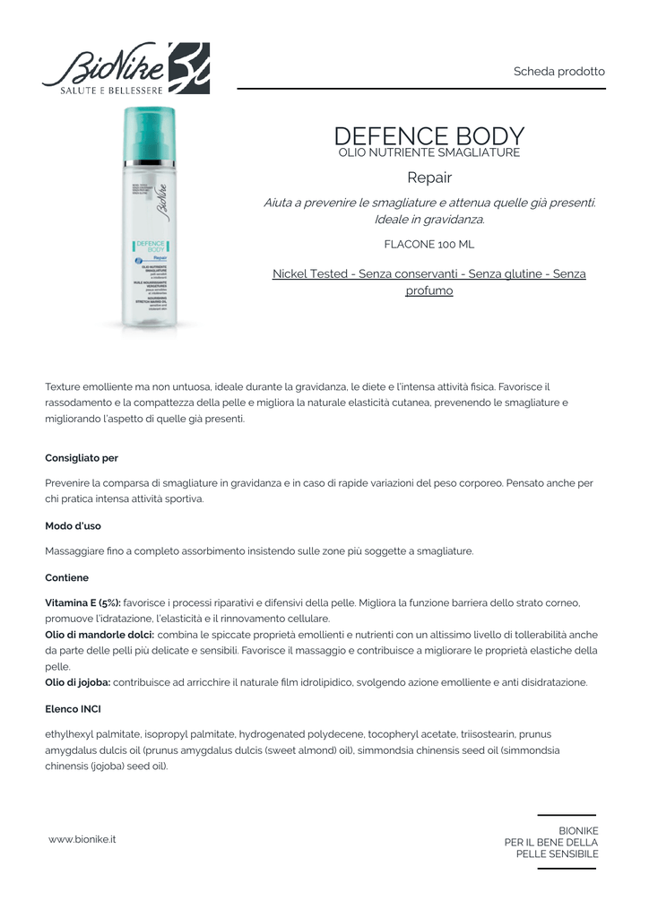 Scheda prodotto DEFENCE BODY OLIO NUTRIENTE SMAGLIATURE Repair Aiuta a prevenire le smagliature e attenua quelle già presenti. Ideale in gravidanza. FLACONE 100 ML Nickel Tested - Senza conservanti - Senza glutine - Senza profumo Texture emolliente ma non untuosa, ideale durante la gravidanza, le diete e l’intensa attività sica. Favorisce il rassodamento e la compattezza della pelle e migliora la naturale elasticità cutanea, prevenendo le smagliature e migliorando l’aspetto di quelle già presenti. Consigliato per Prevenire la comparsa di smagliature in gravidanza e in caso di rapide variazioni del peso corporeo. Pensato anche per chi pratica intensa attività sportiva. Modo d'uso Massaggiare no a completo assorbimento insistendo sulle zone più soggette a smagliature. Contiene Vitamina E (5%): favorisce i processi riparativi e difensivi della pelle. Migliora la funzione barriera dello strato corneo, promuove l’idratazione, l’elasticità e il rinnovamento cellulare. Olio di mandorle dolci: combina le spiccate proprietà emollienti e nutrienti con un altissimo livello di tollerabilità anche da parte delle pelli più delicate e sensibili. Favorisce il massaggio e contribuisce a migliorare le proprietà elastiche della pelle. Olio di jojoba: contribuisce ad arricchire il naturale lm idrolipidico, svolgendo azione emolliente e anti disidratazione. Elenco INCI ethylhexyl palmitate, isopropyl palmitate, hydrogenated polydecene, tocopheryl acetate, triisostearin, prunus amygdalus dulcis oil (prunus amygdalus dulcis (sweet almond) oil), simmondsia chinensis seed oil (simmondsia chinensis (jojoba) seed oil). www.bionike.it BIONIKE PER IL BENE DELLA PELLE SENSIBILE