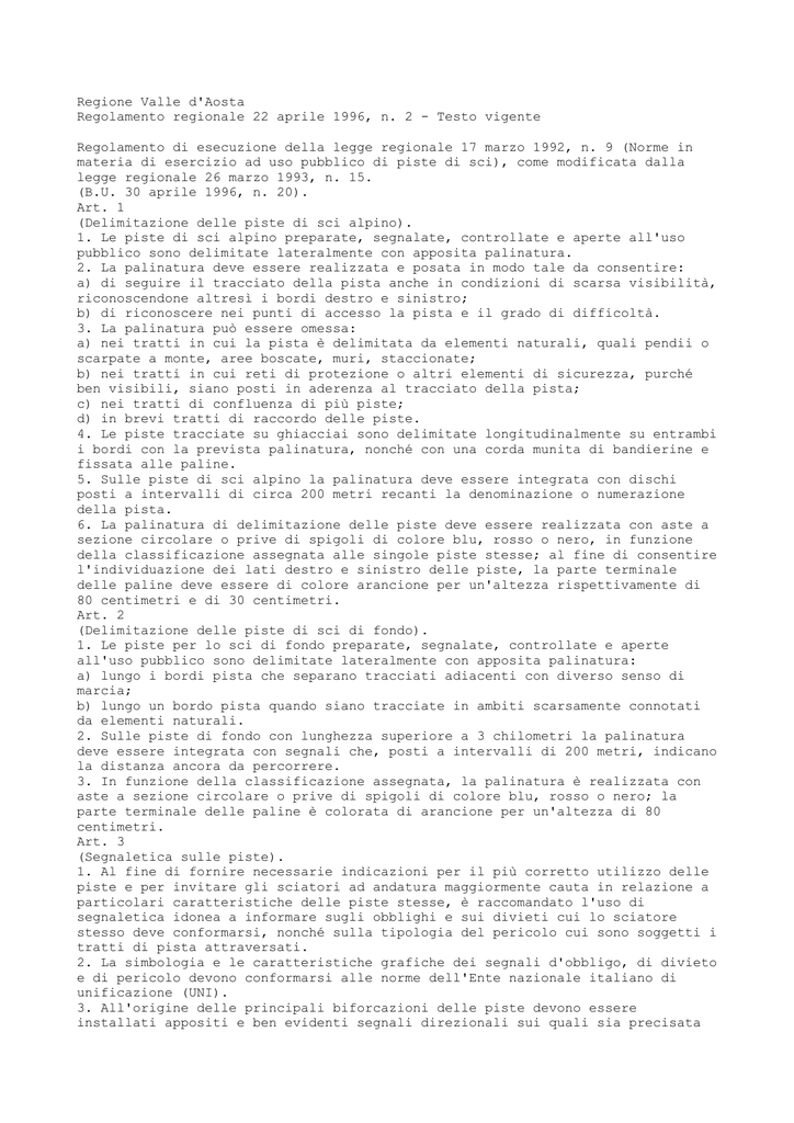 Regione Valle d'Aosta Regolamento regionale 22 aprile 1996, n. 2 - Testo vigente Regolamento di esecuzione della legge regionale 17 marzo 1992, n. 9 (Norme in materia di esercizio ad uso pubblico di piste di sci), come modificata dalla legge regionale 26 marzo 1993, n. 15. (B.U. 30 aprile 1996, n. 20). Art. 1 (Delimitazione delle piste di sci alpino). 1. Le piste di sci alpino preparate, segnalate, controllate e aperte all'uso pubblico sono delimitate lateralmente con apposita palinatura. 2. La palinatura deve essere realizzata e posata in modo tale da consentire: a) di seguire il tracciato della pista anche in condizioni di scarsa visibilità, riconoscendone altresì i bordi destro e sinistro; b) di riconoscere nei punti di accesso la pista e il grado di difficoltà. 3. La palinatura può essere omessa: a) nei tratti in cui la pista è delimitata da elementi naturali, quali pendii o scarpate a monte, aree boscate, muri, staccionate; b) nei tratti in cui reti di protezione o altri elementi di sicurezza, purché ben visibili, siano posti in aderenza al tracciato della pista; c) nei tratti di confluenza di più piste; d) in brevi tratti di raccordo delle piste. 4. Le piste tracciate su ghiacciai sono delimitate longitudinalmente su entrambi i bordi con la prevista palinatura, nonché con una corda munita di bandierine e fissata alle paline. 5. Sulle piste di sci alpino la palinatura deve essere integrata con dischi posti a intervalli di circa 200 metri recanti la denominazione o numerazione della pista. 6. La palinatura di delimitazione delle piste deve essere realizzata con aste a sezione circolare o prive di spigoli di colore blu, rosso o nero, in funzione della classificazione assegnata alle singole piste stesse; al fine di consentire l'individuazione dei lati destro e sinistro delle piste, la parte terminale delle paline deve essere di colore arancione per un'altezza rispettivamente di 80 centimetri e di 30 centimetri. Art. 2 (Delimitazione delle piste di sci di fondo). 1. Le piste per lo sci di fondo preparate, segnalate, controllate e aperte all'uso pubblico sono delimitate lateralmente con apposita palinatura: a) lungo i bordi pista che separano tracciati adiacenti con diverso senso di marcia; b) lungo un bordo pista quando siano tracciate in ambiti scarsamente connotati da elementi naturali. 2. Sulle piste di fondo con lunghezza superiore a 3 chilometri la palinatura deve essere integrata con segnali che, posti a intervalli di 200 metri, indicano la distanza ancora da percorrere. 3. In funzione della classificazione assegnata, la palinatura è realizzata con aste a sezione circolare o prive di spigoli di colore blu, rosso o nero; la parte terminale delle paline è colorata di arancione per un'altezza di 80 centimetri. Art. 3 (Segnaletica sulle piste). 1. Al fine di fornire necessarie indicazioni per il più corretto utilizzo delle piste e per invitare gli sciatori ad andatura maggiormente cauta in relazione a particolari caratteristiche delle piste stesse, è raccomandato l'uso di segnaletica idonea a informare sugli obblighi e sui divieti cui lo sciatore stesso deve conformarsi, nonché sulla tipologia del pericolo cui sono soggetti i tratti di pista attraversati. 2. La simbologia e le caratteristiche grafiche dei segnali d'obbligo, di divieto e di pericolo devono conformarsi alle norme dell'Ente nazionale italiano di unificazione (UNI). 3. All'origine delle principali biforcazioni delle piste devono essere installati appositi e ben evidenti segnali direzionali sui quali sia precisata la denominazione, la direzione, il grado di difficoltà delle piste ed eventualmente le destinazioni raggiungibili. 4. Gli accessi alle piste sottoposte a chiusura, anche temporanea, devono essere sempre protetti per mezzo di palinatura incrociata o di altra idonea barriera trasversale estesa all'intera larghezza della pista e segnalati, dove occorre, mediante il relativo segnale di pericolo. 5. Le intersezioni delle piste di sci con le strade aperte al pubblico transito o con le aree di attesa di impianti di risalita devono essere sempre segnalate e protette per mezzo di più serie di barriere trasversali che, mediante passaggi obbligati ottenuti con lo sfalsamento dei varchi, inducano lo sciatore a limitare la velocità e a modificare la direzione di marcia. 6. Nella realizzazione e messa in esercizio delle barriere utilizzate per impegnare lo sciatore a limitare la velocità e a modificare la direzione di marcia e dei sistemi di protezione in generale, devono essere adottati, anche in relazione alla funzione degli stessi, accorgimenti che considerino gli effetti di un eventuale urto dello sciatore. Art. 4 (Altri tipi di segnaletica). 1. In corrispondenza dei principali accessi dei comprensori per lo sci di fondo devono essere apposti appositi pannelli che forniscano un prospetto generale delle piste esistenti, recanti la denominazione, il grado di difficoltà e l'indicazione dell'apertura o chiusura delle piste stesse, nonché i relativi orari. 2. In prossimità delle stazioni a valle degli impianti di risalita che costituiscono principali linee di alimentazione dei comprensori per lo sci di discesa devono essere apposti appositi pannelli che forniscano un prospetto generale degli impianti e delle piste esistenti, recanti la denominazione, il grado di difficoltà e l'indicazione dell'apertura o chiusura delle piste stesse. 3. Lo sciatore deve essere opportunamente informato sui tipi di sistemi segnaletici in uso nei comprensori. 4. Nelle stazioni a valle degli impianti di risalita devono essere apposti appositi pannelli settoriali che forniscano le informazioni relative alle piste dagli stessi servite con indicazione dei possibili collegamenti con il restante comprensorio. Art. 5 (Tipologia della segnaletica). 1. Le caratteristiche e i tipi di segnaletica da adottare nei comprensori sciistici regionali di discesa e di fondo sono sottoposti all'approvazione dell'Assessorato regionale del turismo, s