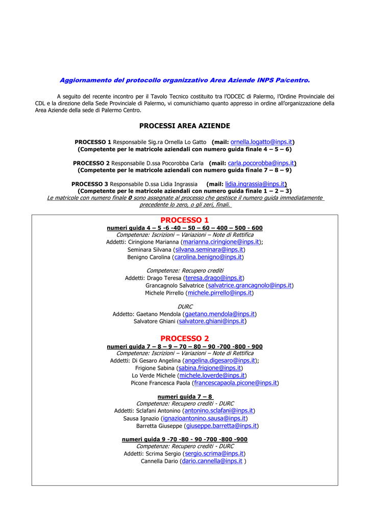 Aggiornamento del protocollo organizzativo Area Aziende INPS Pa/centro. A seguito del recente incontro per il Tavolo Tecnico costituito tra l’ODCEC di Palermo, l’Ordine Provinciale dei CDL e la direzione della Sede Provinciale di Palermo, vi comunichiamo quanto appresso in ordine all’organizzazione della Area Aziende della sede di Palermo Centro. PROCESSI AREA AZIENDE PROCESSO 1 Responsabile Sig.ra Ornella Lo Gatto (mail: [email protected]) (Competente per le matricole aziendali con numero guida finale 4 – 5 – 6) PROCESSO 2 Responsabile D.ssa Pocorobba Carla (mail: [email protected]) (Competente per le matricole aziendali con numero guida finale 7 – 8 – 9) PROCESSO 3 Responsabile D.ssa Lidia Ingrassia (mail: [email protected]) (Competente per le matricole aziendali con numero guida finale 1 – 2 – 3) Le matricole con numero finale 0 sono assegnate al processo che gestisce il numero guida immediatamente precedente lo zero, o gli zeri, finali. PROCESSO 1 numeri guida 4 – 5 -6 -40 – 50 – 60 – 400 – 500 - 600 Competenze: Iscrizioni – Variazioni – Note di Rettifica Addetti: Ciringione Marianna ( [email protected]); Seminara Silvana ( [email protected]) Benigno Carolina ( [email protected]) Competenze: Recupero crediti Addetti: Drago Teresa ( [email protected]) Grancagnolo Salvatrice ( [email protected]) Michele Pirrello ( [email protected]) DURC Addetto: Gaetano Mendola ( [email protected]) Salvatore Ghiani ([email protected]) PROCESSO 2 numeri guida 7 – 8 – 9 – 70 – 80 – 90 -700 -800 - 900 Competenze: Iscrizioni – Variazioni – Note di Rettifica Addetti: Di Gesaro Angelina ( [email protected]); Frigione Sabina ( [email protected]) Lo Verde Michele ( [email protected]) Picone Francesca Paola ( [email protected]) numeri guida 7 – 8 Competenze: Recupero crediti - DURC Addetti: Sclafani Antonino ( [email protected]) Sausa Ignazio ( [email protected]) Barretta Giuseppe ( [email protected]) numeri guida 9 -70 -80 - 90 -700 -800 -900 Competenze: Recupero crediti - DURC Addetti: Scrima Sergio ( [email protected]) Cannella Dario ( [email protected] ) PROCESSO 3 numeri guida 2 – 3 Competenze: Iscrizioni – Variazioni – Note di Rettifica Addetti: Governale Rosalia ( [email protected]); Valenti Maria Grazia ( [email protected]) Fasulo Sonia Maria ( [email protected]) numeri guida 2 Competenze: Recupero crediti Addetti Granata Loredana ( [email protected]) SOLO PER DURC Montaina Adelaide ( [email protected]) numeri guida 3 Addetti: Competenze: Recupero crediti Battaglia Maurizio ( [email protected]) SOLO PER DURC Montaina Adelaide ( [email protected]) numeri guida 1 – 10-20-30) Competenze: Iscrizioni – Variazioni – Note di Rettifica Addetti: Listi Mariano ( [email protected]) Mistretta Maria ( [email protected]) Competenze: Recupero crediti - DURC Addetti: Maisano Giuseppe ( [email protected]) Rosone Cinzia ( [email protected]) La trattazione delle pratiche rimane confermata per appuntamento nei giorni (riservati ai soli Professionisti autorizzati) di Lunedì, Mercoledì (ingresso Via Laurana) e Venerdì (ingresso Via degli Orti ), con l’invio di una preventiva mail da indirizzare ai componenti dei gruppi e previa esibizione al metronotte di turno del report di conferma dell’appuntamento inviato dall’INPS, con indicata la data e l’ora. Certi che, se esigiamo dai nostri interlocutori il rispetto delle regole, dobbiamo, per primi, impegnarci a rispettarle, ancora una volta elenchiamo le procedure da seguire per il buon funzionamento delle richieste di appuntamento. Nel rispetto degli impegni reciprocamente assunti Vi raccomandiamo quanto segue: a).di indicare il numero di iscrizione e l’ordine di appartenenza; b). di non inviare richieste di appuntamento generiche e senza riferimento al numero finale di matricola; c). di indirizzare sempre le richieste a tutti i componenti del gruppo. Trascorsi dieci giorni lavorativi, senza avere ricevuto alcuna risposta alla richiesta inoltrata, è possibile inviare un sollecito direttamente agli indirizzi dei capi-processo. SI PRECISA CHE LE RICHIESTE DI APPUNTAMENTI PRIVE DEI REQUISITI SOPRA INDICATI RESTERANNO INEVASE. Si invitano inoltre i Colleghi, per rispetto a chi fissa l’appuntamento, ma soprattutto per rispetto agli altri colleghi, di comunicare l’avvenuta impossibilità a rispettare l’appuntamento, per lasciare ad altri tale opportunità. Infine, nel rispetto degli impegni assunti, Vi invitiamo, qualora non presenziaste personalmente in occasione dell’appuntamento e Vi avvaleste di collaboratori dello studio, a fornire agli stessi apposita delega. Vi ricordiamo inoltre che nelle giornate di martedì e giovedì gli uffici dell’area Aziende del piano terra, destinati alla generalità degli utenti, potranno essere fruiti anche dai professionisti, ma esclusivamente per l’acquisizione di informazioni o per la trattazione di una sola pratica. Nella riunione la Direzione dell’Istituto ci ha inoltre informato che ha costituito al proprio interno una task force per la lavorazione e l’eliminazione delle evidenze, considerato che la sede provinciale di Palermo possiede nei propri archivi una notevole quantità di rettifiche inevase. Tale iniziativa è intrapresa nell’obiettivo comune di “pulire” in maniera definitiva gli archivi dell’Istituto a vantaggio sia delle aziende che dello stesso Istituto. Tale gruppo è composto dai sigg.: - Ancona Nicolò ( [email protected]) - Arena Alberto ( [email protected]) - Biondo Loredana ( [email protected]) - Di Seri Cinzia ( [email protected]) - Garlisi Marcello ( [email protected]) - Meschis Aredio ( [email protected]). Detti componenti invieranno a mezzo e-mail sulle caselle di posta elettronica dei professionisti interessati le richieste di documenti che gli stessi potranno evadere stesso mezzo. Restiamo a Vs. disposizione per ulteriori chiarimenti e cogliamo l’occasione della presente per porg ere distinti saluti.