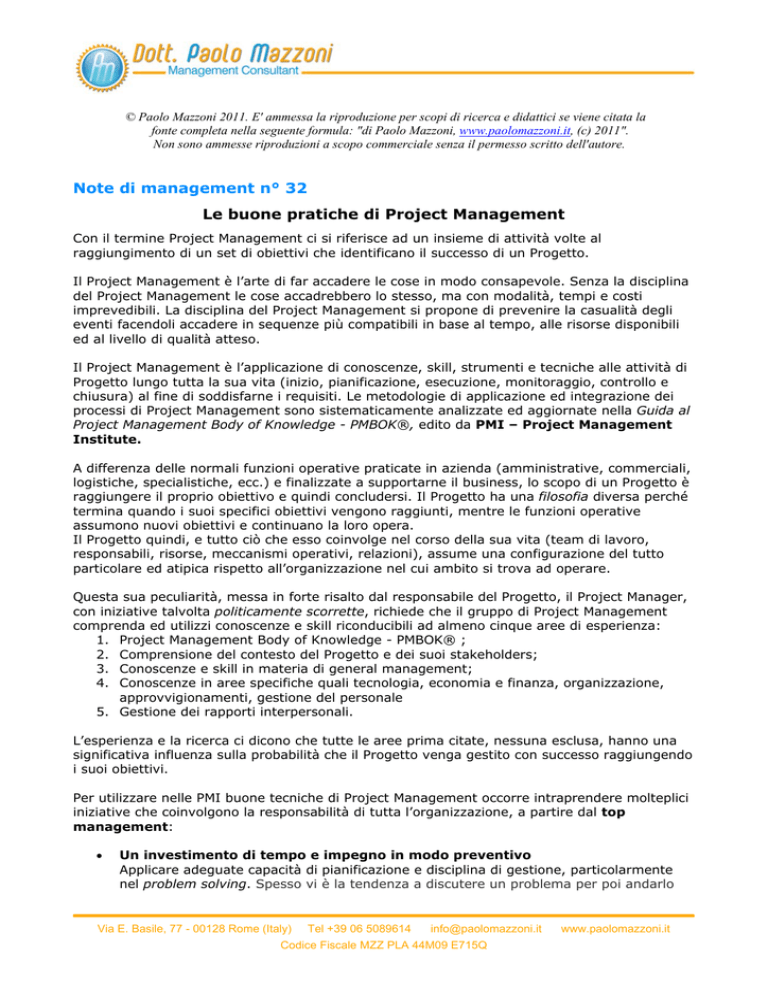 © Paolo Mazzoni 2011. E' ammessa la riproduzione per scopi di ricerca e didattici se viene citata la fonte completa nella seguente formula: "di Paolo Mazzoni, www.paolomazzoni.it, (c) 2011". Non sono ammesse riproduzioni a scopo commerciale senza il permesso scritto dell'autore. Note di management n° 32 Le buone pratiche di Project Management Con il termine Project Management ci si riferisce ad un insieme di attività volte al raggiungimento di un set di obiettivi che identificano il successo di un Progetto. Il Project Management è l’arte di far accadere le cose in modo consapevole. Senza la disciplina del Project Management le cose accadrebbero lo stesso, ma con modalità, tempi e costi imprevedibili. La disciplina del Project Management si propone di prevenire la casualità degli eventi facendoli accadere in sequenze più compatibili in base al tempo, alle risorse disponibili ed al livello di qualità atteso. Il Project Management è l’applicazione di conoscenze, skill, strumenti e tecniche alle attività di Progetto lungo tutta la sua vita (inizio, pianificazione, esecuzione, monitoraggio, controllo e chiusura) al fine di soddisfarne i requisiti. Le metodologie di applicazione ed integrazione dei processi di Project Management sono sistematicamente analizzate ed aggiornate nella Guida al Project Management Body of Knowledge - PMBOK®, edito da PMI – Project Management Institute. A differenza delle normali funzioni operative praticate in azienda (amministrative, commerciali, logistiche, specialistiche, ecc.) e finalizzate a supportarne il business, lo scopo di un Progetto è raggiungere il proprio obiettivo e quindi concludersi. Il Progetto ha una filosofia diversa perché termina quando i suoi specifici obiettivi vengono raggiunti, mentre le funzioni operative assumono nuovi obiettivi e continuano la loro opera. Il Progetto quindi, e tutto ciò che esso coinvolge nel corso della sua vita (team di lavoro, responsabili, risorse, meccanismi operativi, relazioni), assume una configurazione del tutto particolare ed atipica rispetto all’organizzazione nel cui ambito si trova ad operare. Questa sua peculiarità, messa in forte risalto dal responsabile del Progetto, il Project Manager, con iniziative talvolta politicamente scorrette, richiede che il gruppo di Project Management comprenda ed utilizzi conoscenze e skill riconducibili ad almeno cinque aree di esperienza: 1. Project Management Body of Knowledge - PMBOK® ; 2. Comprensione del contesto del Progetto e dei suoi stakeholders; 3. Conoscenze e skill in materia di general management; 4. Conoscenze in aree specifiche quali tecnologia, economia e finanza, organizzazione, approvvigionamenti, gestione del personale 5. Gestione dei rapporti interpersonali. L’esperienza e la ricerca ci dicono che tutte le aree prima citate, nessuna esclusa, hanno una significativa influenza sulla probabilità che il Progetto venga gestito con successo raggiungendo i suoi obiettivi. Per utilizzare nelle PMI buone tecniche di Project Management occorre intraprendere molteplici iniziative che coinvolgono la responsabilità di tutta l’organizzazione, a partire dal top management: Un investimento di tempo e impegno in modo preventivo Applicare adeguate capacità di pianificazione e disciplina di gestione, particolarmente nel problem solving. Spesso vi è la tendenza a discutere un problema per poi andarlo Via E. Basile, 77 - 00128 Rome (Italy) Tel +39 06 5089614 [email protected] Codice Fiscale MZZ PLA 44M09 E715Q www.paolomazzoni.it subito a risolvere, mentre bisogna resistere alla tentazione di entrare subito nel cuore del problema ed invece applicare metodologie adatte alla sua interpretazione e decodifica. Convinto coinvolgimento dell’organizzazione E' difficile essere un buon Project Manager in una organizzazione che non consideri di valore le competenze e le prassi di Project Management, con la loro disciplina formale e sostanziale, supportandole in un processo comune con un forte senso di appartenenza. Formazione ed esperienza La mancanza di processi di Project Management non è una questione di volontà, ma una questione di formazione. Si chiede spesso alle persone di gestire un Progetto senza la necessaria formazione o esperienza. In questi casi le persone fanno grandi sforzi senza disporre dei mezzi adatti, o senza la formazione necessaria per gestire efficacemente un Progetto. L'alta direzione non banalizzi il Project Management a livello di un semplice tool software, o comunque una materia tecnica Quando si discute di Project Management con alcuni alti manager, essi inizialmente credono che si stia parlando di un tool software creato per aiutare il lavoro di un Project Manager. Manca spesso la consapevolezza che il Project Management non si risolve in un insieme di tecniche e metodologie operative, ma ha in sé tutte le caratteristiche per lo sviluppo dell’organizzazione e delle persone che la compongono, che un ruolo di responsabilità di Progetto si realizza in un’attività manageriale, e come tale deve essere interpretato. L’attività del Project Manager è rivolta alla gestione delle risorse umane, di team progettuali che operano all’interno di un’organizzazione nel rispetto di obiettivi precisi, e con chiare responsabilità verso tutti gli stakeholders interessati all’iniziativa. La direzione, particolarmente il management intermedio, non tema di perdere il controllo La gestione formale di un Progetto non è possibile in organizzazioni dove prevale questa convinzione. Se realmente si vuole implementare efficacemente una disciplina di Project Management nell’azienda occorre assegnare un livello di controllo e di autorità ai Project Manager, nella consapevolezza che ogni Progetto o o o o Genera un’organizzazione temporanea che non sopravvive al Progetto stesso Riguarda l’integrazione delle persone in un’impresa comune Richiede tools e tecniche di tipo integrativo e predittivo Ha un proprio ciclo di vita Giova ri