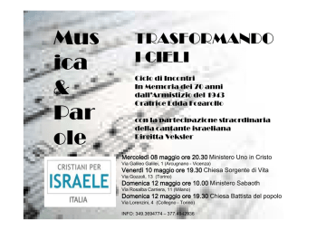 Mus ica & Par ole TRASFORMANDO I CIELI Ciclo di Incontri In Memoria dei 70 anni dall’Armistizio del 1943 Oratrice Edda Fogarollo con la partecipazione straordinaria della cantante israeliana Birgitta Veksler Mercoledì 08 maggio ore 20.30 Ministero Uno in Cristo Via Galileo Galilei, 1 (Arcugnano - Vicenza) Venerdì 10 maggio ore 19.30 Chiesa Sorgente di Vita Via Gozzoli, 13 (Torino) Domenica 12 maggio ore 10.00 Ministero Sabaoth Via Rosalba Carriera, 11 (Milano) Domenica 12 maggio ore 19.30 Chiesa Battista del popolo Via Lorenzini, 4 (Collegno - Torino) INFO: 349.3694774 – 377.4942936