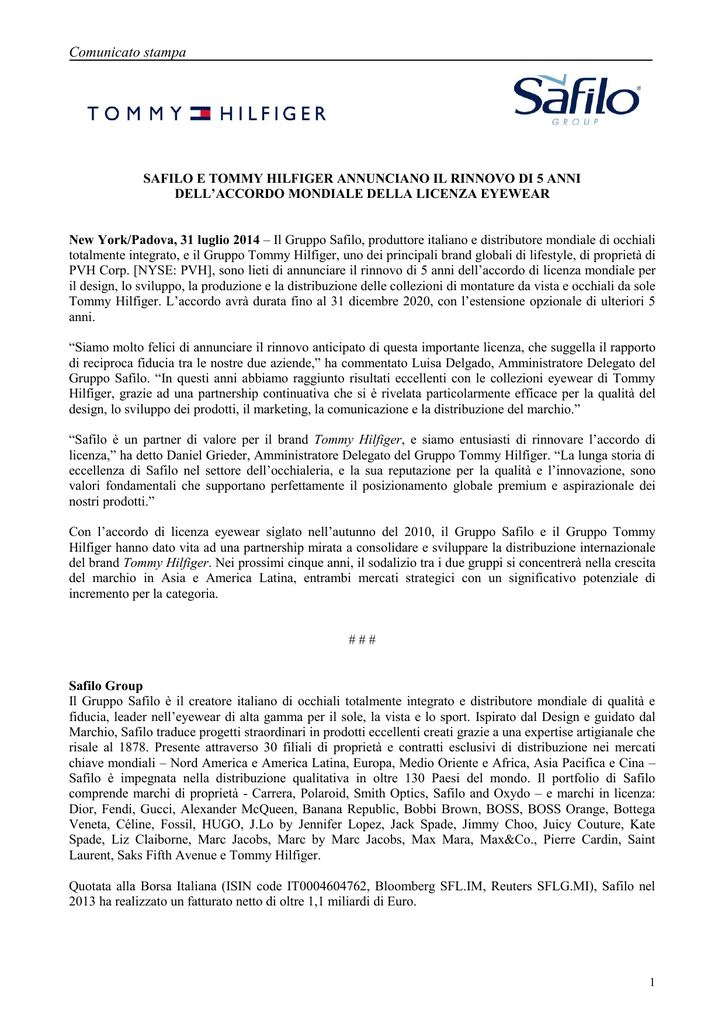 Comunicato stampa SAFILO E TOMMY HILFIGER ANNUNCIANO IL RINNOVO DI 5 ANNI DELL’ACCORDO MONDIALE DELLA LICENZA EYEWEAR New York/Padova, 31 luglio 2014 – Il Gruppo Safilo, produttore italiano e distributore mondiale di occhiali totalmente integrato, e il Gruppo Tommy Hilfiger, uno dei principali brand globali di lifestyle, di proprietà di PVH Corp. [NYSE: PVH], sono lieti di annunciare il rinnovo di 5 anni dell’accordo di licenza mondiale per il design, lo sviluppo, la produzione e la distribuzione delle collezioni di montature da vista e occhiali da sole Tommy Hilfiger. L’accordo avrà durata fino al 31 dicembre 2020, con l’estensione opzionale di ulteriori 5 anni. “Siamo molto felici di annunciare il rinnovo anticipato di questa importante licenza, che suggella il rapporto di reciproca fiducia tra le nostre due aziende,” ha commentato Luisa Delgado, Amministratore Delegato del Gruppo Safilo. “In questi anni abbiamo raggiunto risultati eccellenti con le collezioni eyewear di Tommy Hilfiger, grazie ad una partnership continuativa che si è rivelata particolarmente efficace per la qualità del design, lo sviluppo dei prodotti, il marketing, la comunicazione e la distribuzione del marchio.” “Safilo è un partner di valore per il brand Tommy Hilfiger, e siamo entusiasti di rinnovare l’accordo di licenza,” ha detto Daniel Grieder, Amministratore Delegato del Gruppo Tommy Hilfiger. “La lunga storia di eccellenza di Safilo nel settore dell’occhialeria, e la sua reputazione per la qualità e l’innovazione, sono valori fondamentali che supportano perfettamente il posizionamento globale premium e aspirazionale dei nostri prodotti.” Con l’accordo di licenza eyewear siglato nell’autunno del 2010, il Gruppo Safilo e il Gruppo Tommy Hilfiger hanno dato vita ad una partnership mirata a consolidare e sviluppare la distribuzione internazionale del brand Tommy Hilfiger. Nei prossimi cinque anni, il sodalizio tra i due gruppi si concentrerà nella crescita del marchio in Asia e America Latina, entrambi mercati strategici con un significativo potenziale di incremento per la categoria. ### Safilo Group Il Gruppo Safilo è il creatore italiano di occhiali totalmente integrato e distributore mondiale di qualità e fiducia, leader nell’eyewear di alta gamma per il sole, la vista e lo sport. Ispirato dal Design e guidato dal Marchio, Safilo traduce progetti straordinari in prodotti eccellenti creati grazie a una expertise artigianale che risale al 1878. Presente attraverso 30 filiali di proprietà e contratti esclusivi di distribuzione nei mercati chiave mondiali – Nord America e America Latina, Europa, Medio Oriente e Africa, Asia Pacifica e Cina – Safilo è impegnata nella distribuzione qualitativa in oltre 130 Paesi del mondo. Il portfolio di Safilo comprende marchi di proprietà - Carrera, Polaroid, Smith Optics, Safilo and Oxydo – e marchi in licenza: Dior, Fendi, Gucci, Alexander McQueen, Banana Republic, Bobbi Brown, BOSS, BOSS Orange, Bottega Veneta, Céline, Fossil, HUGO, J.Lo by Jennifer Lopez, Jack Spade, Jimmy Choo, Juicy Couture, Kate Spade, Liz Claiborne, Marc Jacobs, Marc by Marc Jacobs, Max Mara, Max&Co., Pierre Cardin, Saint Laurent, Saks Fifth Avenue e Tommy Hilfiger. Quotata alla Borsa Italiana (ISIN code IT0004604762, Bloomberg SFL.IM, Reuters SFLG.MI), Safilo nel 2013 ha realizzato un fatturato netto di oltre 1,1 miliardi di Euro. 1 Comunicato stampa Il Gruppo Tommy Hilfiger Con un portfolio di marchi lifestyle premium che includono Tommy Hilfiger, Hilfiger Denim e Tommy Girl, il Gruppo Tommy Hilfiger rappresenta una delle realtà più stimate al mondo nel settore del fashion design. Il suo focus principale è la creazione e commercializzazione di collezioni di alta qualità con linee di abbigliamento uomo, donna, bambino e denim. Attraverso accordi di licenza strategici, il Gruppo offre una gamma di prodotti lifestyle coordinati, tra cui sportswear per uomo, donna, junior e bambino; calzature; abbigliamento sportivo (golf, nuoto e vela); biancheria (biancheria intima, abiti e indumenti da notte); montature da vista; occhiali da sole; orologi; borse; abbigliamento da uomo su misura; accessori eleganti da uomo; calze; piccola pelletteria; fragranze; prodotti per la casa e biancheria da letto; accessori per il bagno; bagagli. La linea di prodotti Hilfiger Denim comprende jeans e calzature per uomo, donna e bambino; borse; accessori; occhiali e profumi. I prodotti del Gruppo Tommy Hilfiger sono in vendita nel mondo attraverso una vasta rete di negozi monomarca Tommy Hilfiger, negozi specializzati e department stores e altri canali distributivi altamente selezionati. PVH Corp. PVH Corp., una delle maggiori società di abbigliamento mondiali, possiede e commercializza a livello mondiale gli iconici marchi Calvin Klein e Tommy Hilfiger. È la più grande società di camicie e cravatte al mondo e commercializza una vasta gamma di prodotti con i propri marchi Van Heusen, Calvin Klein, Tommy Hilfiger, IZOD, ARROW, Warner’s e Olga, e i brand in licenza Speedo, Geoffrey Beene, Kenneth Cole New York, Kenneth Cole Reaction, MICHAEL Michael Kors, Sean John, Chaps, Donald J. Trump Signature Collection, DKNY, Ike Behar e John Varvatos. Contatti: Safilo Group Investor Relations Barbara Ferrante ph. +39 049 6985766 www.safilo.com/it/investors.html Safilo Group Press office Milano – ph. +39 02 77807607 Padova – ph. +39 049 6985322 Tommy Hilfiger Kimberley Witcomb Director of Communications, Europe T +31 20 589 5714 [email protected] 2
