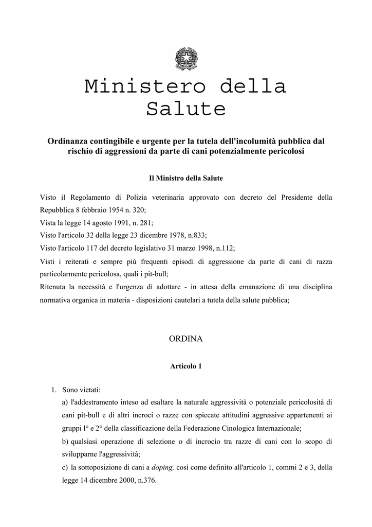 Ministero della Salute Ordinanza contingibile e urgente per la tutela dell'incolumità pubblica dal rischio di aggressioni da parte di cani potenzialmente pericolosi Il Ministro della Salute Visto il Regolamento di Polizia veterinaria approvato con decreto del Presidente della Repubblica 8 febbraio 1954 n. 320; Vista la legge 14 agosto 1991, n. 281; Visto l'articolo 32 della legge 23 dicembre 1978, n.833; Visto l'articolo 117 del decreto legislativo 31 marzo 1998, n.112; Visti i reiterati e sempre più frequenti episodi di aggressione da parte di cani di razza particolarmente pericolosa, quali i pit-bull; Ritenuta la necessità e l'urgenza di adottare - in attesa della emanazione di una disciplina normativa organica in materia - disposizioni cautelari a tutela della salute pubblica; ORDINA Articolo 1 1. Sono vietati: a) l'addestramento inteso ad esaltare la naturale aggressività o potenziale pericolosità di cani pit-bull e di altri incroci o razze con spiccate attitudini aggressive appartenenti ai gruppi l° e 2° della classificazione della Federazione Cinologica Internazionale; b) qualsiasi operazione di selezione o di incrocio tra razze di cani con lo scopo di svilupparne l'aggressività; c) la sottoposizione di cani a doping, così come definito all'articolo 1, commi 2 e 3, della legge 14 dicembre 2000, n.376. Articolo 2 1. I proprietari e i detentori dei cani di cui all' articolo 1, quando li portano in luogo pubblico o aperto al pubblico debbono usare contestualmente il guinzaglio e la museruola, previsti dall'articolo 83, primo comma, lettere c) e d) del regolamento di Polizia Veterinaria, approvato con decreto del Presidente della Repubblica 8 febbraio 1954 n. 320. E' vietato acquistare, possedere o detenere cani di cui all'articolo 1: a) ai delinquenti abituali, o per tendenza; b) a chi è sottoposto a misura di prevenzione personale o a misura di sicurezza personale; c) a chiunque abbia riportato condanna, anche non definitiva, per delitto non colposo contro la persona o contro il patrimonio, punibile con la reclusione superiore a due anni; d) a chiunque abbia riportato condanna, anche non definitiva, per i reati di cui all'articolo 727 del codice penale; e) ai minori di 18 anni e agli interdetti e inabilitati per infermità. 2. I divieti di cui al comma 1 non si applicano ai cani per non vedenti o non udenti, addestrati presso le scuole nazionali come cani guida. 3. Chiunque possegga o detenga cani di cui all'articolo 1 è tenuto a stipulare una polizza di assicurazione di responsabilità civile per danni contro terzi, definita secondo i massimali e i periodi di durata stabiliti dal Ministero delle attività produttive. 4. I detentori che non intendono mantenere il possesso dell'animale nel rispetto delle disposizioni di cui alla presente ordinanza debbono interessare le autorità veterinarie competenti nel territorio al fine di ricercare idonee soluzioni di affidamento del proprio cane. 5. La presente ordinanza non si applica ai cani in dotazione alle forze armate, di polizia e di protezione civile. La presente ordinanza ha efficacia per un anno dalla data di entrata in vigore, che decorre dal giorno stesso della sua pubblicazione nella Gazzetta Ufficiale della Repubblica italiana. Roma, 9 settembre 2003 Il Ministro della Salute