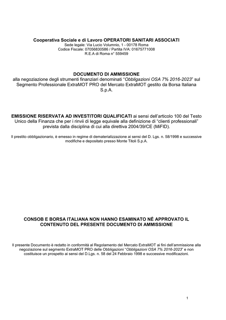 Cooperativa Sociale e di Lavoro OPERATORI SANITARI ASSOCIATI Sede legale: Via Lucio Volumnio, 1 - 00178 Roma Codice Fiscale: 07056830586 / Partita IVA: 01675771008 R.E.A di Roma n° 559459 DOCUMENTO DI AMMISSIONE alla negoziazione degli strumenti finanziari denominati “Obbligazioni OSA 7% 2016-2023” sul Segmento Professionale ExtraMOT PRO del Mercato ExtraMOT gestito da Borsa Italiana S.p.A. EMISSIONE RISERVATA AD INVESTITORI QUALIFICATI ai sensi dell’articolo 100 del Testo Unico della Finanza che per i rinvii di legge equivale alla definizione di “clienti professionali” prevista dalla disciplina di cui alla direttiva 2004/39/CE (MiFID). Il prestito obbligazionario, è emesso in regime di dematerializzazione ai sensi del D. Lgs. n. 58/1998 e successive modifiche e depositato presso Monte Titoli S.p.A. CONSOB E BORSA ITALIANA NON HANNO ESAMINATO NÉ APPROVATO IL CONTENUTO DEL PRESENTE DOCUMENTO DI AMMISSIONE Il presente Documento è redatto in conformità al Regolamento del Mercato ExtraMOT ai fini dell’ammissione alla negoziazione sul segmento ExtraMOT PRO delle Obbligazioni “Obbligazioni OSA 7% 2016-2023” e non costituisce un prospetto ai sensi del D.Lgs. n. 58 del 24 Febbraio 1998 e successive modificazioni. 1 INDICE 1. DEFINIZIONI .............................................................................................................................. 3 2. PERSONE RESPONSABILI DEL DOCUMENTO DI AMMISSIONE ........................................... 6 3. FATTORI DI RISCHIO ................................................................................................................ 7 4. INFORMAZIONI RELATIVE ALL’EMITTENTE .......................................................................... 20 5. INFORMAZIONI RIGUARDANTI LE OBBLIGAZIONI DA AMMETTERE ALLA NEGOZIAZIONE ...................................................................................................................... 27 6. AMMISSIONE ALLA NEGOZIAZIONE E MODALITA’ DI NEGOZIAZIONE .............................. 29 ALLEGATO 1 - REGOLAMENTO DEL PRESTITO OBBLIGAZIONARIO ............................................ 30 ALLEGATO 2 - BILANCIO DI ESERCIZIO CHIUSO IL 31 DICEMBRE 2015 E RELAZIONE DELLA SOCIETA’ DI REVISIONE ............................................................................................ 31 2 1. DEFINIZIONI Viene riportato qui di seguito l’elenco delle definizioni e dei termini utilizzati all’interno del seguente Documento di Ammissione e del Regolamento allegato al presente Documento di Ammissione. Tali definizioni, salvo ove diversamente specificato, hanno il significato di seguito indicato. I termini definiti al singolare si intendono anche al plurale, e viceversa, ove il contesto lo richieda. Articolo indica un articolo del Regolamento. Borsa Italiana indica Borsa Italiana S.p.A. con sede in Piazza Affari n. 6, Milano. Consiglio di Amministrazione indica il Consiglio di Amministrazione dell’Emittente. Consob indica la Commissione Nazionale per le Società e la Borsa con sede a Roma, Via G.B. Martini n.3. Data del Documento di Ammissione indica il 14 luglio 2016, data di pubblicazione del presente Documento di Ammissione da parte dell’Emittente. Documento di Ammissione indica il presente documento di ammissione alla negoziazione delle Obbligazioni redatto secondo le linee guida indicate nel Regolamento ExtraMOT. Emittente o Società indica la Cooperativa Sociale e di Lavoro OPERATORI SANITARI ASSOCIATI, in breve Cooperativa Sociale e di Lavoro O.S.A., con sede legale in Via Lucio Volumnio, 1 - 00178 Roma, P.IVA 01675771008 e C.F. 07056830586, R.E.A di Roma n° 559459, iscritta all’albo delle società cooperative a mutualità prevalente n. A120393. Telefono +39.06.71.06.61. Indirizzo pec: [email protected]. Sito internet www.osa.coop. Facoltà di Rimborso Anticipato ha il significato attribuito a tale termine nell’Articolo 8. Giorno Lavorativo indica qualsiasi giorno in cui il Trans-European Automated Real Time Gross Settlement Express Transfer System (TARGET2) è operante per il pagamento in Euro. Indebitamento Finanziario indica l’indebitamento finanziario dell’Emittente conseguente a nuove emissioni da parte dell’Emittente di obbligazioni, titoli di debito o altri strumenti finanziari che prevedano obblighi di rimborso, diversi dalle Obbligazioni. Interessi ha il significato attribuito a tale termine nell’Articolo 6. Investitori Professionali indica, ai sensi del Regolamento ExtraMOT, i soggetti di cui all’allegato II, parte 1 e 2 della direttiva 2004/39/CE (MiFID). Tale definizione indica inoltre gli “investitori qualificati” ossia i soggetti di cui all’articolo 100 del d.lgs. 24 febbraio 1998, n. 58 (TUF) che, in forza del duplice rinvio all’articolo 34-ter del Regolamento Emittenti e all’articolo 26 del Regolamento Intermediari equivale alla definizione di “clienti professionali” prevista dalla disciplina MiFID. 3 Legge 833 indica la Legge 23 dicembre 1978, n. 833, come successivamente modificata ed integrata. Mercato ExtraMOT indica il sistema multilaterale di negoziazione (MTF) delle obbligazioni, organizzato e gestito da Borsa Italiana. Monte Titoli indica Monte Titoli S.p.A. con sede in Milano, Piazza degli Affari n. 6. Obbligazioni indica le n.1.000 obbligazioni, ciascuna emessa al proprio Valore Nominale, che costituiscono il Prestito Obbligazionario per un valore nominale massimo di Euro 10.000.000,00 (diecimilioni/00), emesso dall’Emittente con la Deliberazione di Emissione. Obbligazionista indica il titolare, tempo per tempo, delle Obbligazioni. Oneri indica i diritti reali di garanzia, i privilegi o le garanzie di natura personale. Prestito Obbligazionario ha il significato attribuito a tale termine nell’Articolo 1. Prezzo di Emissione ha il significato attribuito a tale termine nell’Articolo 2. Principi Contabili Italiani indica le norme di legge vigenti alla data di riferimento di ciascun bilancio dell’Emitte