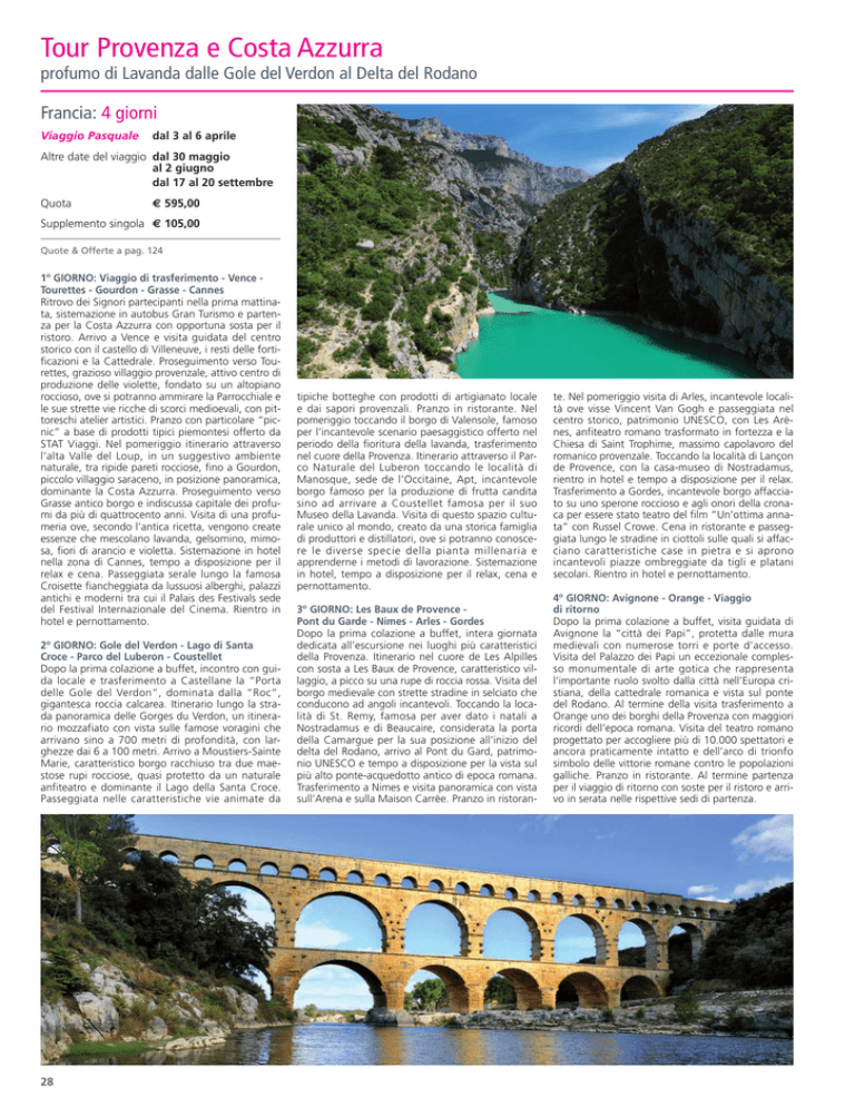 Tour Provenza e Costa Azzurra profumo di Lavanda dalle Gole del Verdon al Delta del Rodano Francia: 4 giorni Viaggio Pasquale dal 3 al 6 aprile Altre date del viaggio dal 30 maggio al 2 giugno dal 17 al 20 settembre Quota € 595,00 Supplemento singola € 105,00 Quote & Offerte a pag. 124 1º GIORNO: Viaggio di trasferimento - Vence Tourettes - Gourdon - Grasse - Cannes Ritrovo dei Signori partecipanti nella prima mattinata, sistemazione in autobus Gran Turismo e partenza per la Costa Azzurra con opportuna sosta per il ristoro. Arrivo a Vence e visita guidata del centro storico con il castello di Villeneuve, i resti delle fortificazioni e la Cattedrale. Proseguimento verso Tourettes, grazioso villaggio provenzale, attivo centro di produzione delle violette, fondato su un altopiano roccioso, ove si potranno ammirare la Parrocchiale e le sue strette vie ricche di scorci medioevali, con pittoreschi atelier artistici. Pranzo con particolare “picnic” a base di prodotti tipici piemontesi offerto da STAT Viaggi. Nel pomeriggio itinerario attraverso l’alta Valle del Loup, in un suggestivo ambiente naturale, tra ripide pareti rocciose, fino a Gourdon, piccolo villaggio saraceno, in posizione panoramica, dominante la Costa Azzurra. Proseguimento verso Grasse antico borgo e indiscussa capitale dei profumi da più di quattrocento anni. Visita di una profumeria ove, secondo l’antica ricetta, vengono create essenze che mescolano lavanda, gelsomino, mimosa, fiori di arancio e violetta. Sistemazione in hotel nella zona di Cannes, tempo a disposizione per il relax e cena. Passeggiata serale lungo la famosa Croisette fiancheggiata da lussuosi alberghi, palazzi antichi e moderni tra cui il Palais des Festivals sede del Festival Internazionale del Cinema. Rientro in hotel e pernottamento. 2º GIORNO: Gole del Verdon - Lago di Santa Croce - Parco del Luberon - Coustellet Dopo la prima colazione a buffet, incontro con guida locale e trasferimento a Castellane la “Porta delle Gole del Verdon”, dominata dalla “Roc”, gigantesca roccia calcarea. Itinerario lungo la strada panoramica delle Gorges du Verdon, un itinerario mozzafiato con vista sulle famose voragini che arrivano sino a 700 metri di profondità, con larghezze dai 6 a 100 metri. Arrivo a Moustiers-Sainte Marie, caratteristico borgo racchiuso tra due maestose rupi rocciose, quasi protetto da un naturale anfiteatro e dominante il Lago della Santa Croce. Passeggiata nelle caratteristiche vie animate da 28 tipiche botteghe con prodotti di artigianato locale e dai sapori provenzali. Pranzo in ristorante. Nel pomeriggio toccando il borgo di Valensole, famoso per l’incantevole scenario paesaggistico offerto nel periodo della fioritura della lavanda, trasferimento nel cuore della Provenza. Itinerario attraverso il Parco Naturale del Luberon toccando le località di Manosque, sede de l’Occitaine, Apt, incantevole borgo famoso per la produzione di frutta candita sino ad arrivare a Coustellet famosa per il suo Museo della Lavanda. Visita di questo spazio culturale unico al mondo, creato da una storica famiglia di produttori e distillatori, ove si potranno conoscere le diverse specie della pianta millenaria e apprenderne i metodi di lavorazione. Sistemazione in hotel, tempo a disposizione per il relax, cena e pernottamento. 3º GIORNO: Les Baux de Provence Pont du Garde - Nimes - Arles - Gordes Dopo la prima colazione a buffet, intera giornata dedicata all’escursione nei luoghi più caratteristici della Provenza. Itinerario nel cuore de Les Alpilles con sosta a Les Baux de Provence, caratteristico villaggio, a picco su una rupe di roccia rossa. Visita del borgo medievale con strette stradine in selciato che conducono ad angoli incantevoli. Toccando la località di St. Remy, famosa per aver dato i natali a Nostradamus e di Beaucaire, considerata la porta della Camargue per la sua posizione all’inizio del delta del Rodano, arrivo al Pont du Gard, patrimonio UNESCO e tempo a disposizione per la vista sul più alto ponte-acquedotto antico di epoca romana. Trasferimento a Nimes e visita panoramica con vista sull’Arena e sulla Maison Carrèe. Pranzo in ristoran- te. Nel pomeriggio visita di Arles, incantevole località ove visse Vincent Van Gogh e passeggiata nel centro storico, patrimonio UNESCO, con Les Arènes, anfiteatro romano trasformato in fortezza e la Chiesa di Saint Trophime, massimo capolavoro del romanico provenzale. Toccando la località di Lançon de Provence, con la casa-museo di Nostradamus, rientro in hotel e tempo a disposizione per il relax. Trasferimento a Gordes, incantevole borgo affacciato su uno sperone roccioso e agli onori della cronaca per essere stato teatro del film “Un’ottima annata” con Russel Crowe. Cena in ristorante e passeggiata lungo le stradine in ciottoli sulle quali si affacciano caratteristiche case in pietra e si aprono incantevoli piazze ombreggiate da tigli e platani secolari. Rientro in hotel e pernottamento. 4º GIORNO: Avignone - Orange - Viaggio di ritorno Dopo la prima colazione a buffet, visita guidata di Avignone la “città dei Papi”, protetta dalle mura medievali con numerose torri e porte d’accesso. Visita del Palazzo dei Papi un eccezionale complesso monumentale di arte gotica che rappresenta l’importante ruolo svolto dalla città nell’Europa cristiana, della cattedrale romanica e vista sul ponte del Rodano. Al termine della visita trasferimento a Orange uno dei borghi della Provenza con maggiori ricordi dell’epoca romana. Visita del teatro romano progettato per accogliere più di 10.000 spettatori e ancora praticamente intatto e dell’arco di trionfo simbolo delle vittorie romane contro le popolazioni galliche. Pranzo in ristorante. Al termine partenza per il viaggio di ritorno con soste per il ristoro e arrivo in serata nelle rispettive sedi di partenza.