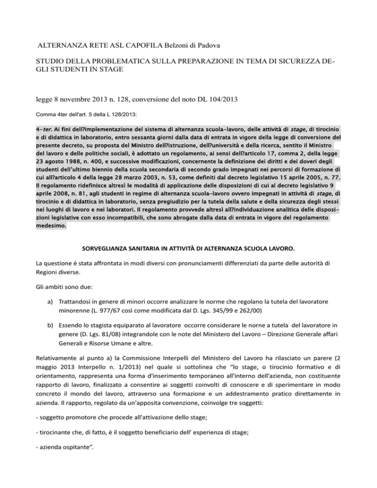 ALTERNANZA RETE ASL CAPOFILA Belzoni di Padova STUDIO DELLA PROBLEMATICA SULLA PREPARAZIONE IN TEMA DI SICUREZZA DEGLI STUDENTI IN STAGE legge 8 novembre 2013 n. 128, conversione del noto DL 104/2013 Comma 4ter dell'art. 5 della L 128/2013: 4-ter. Ai fini dell?implementazione del sistema di alternanza scuola-lavoro, delle attività di stage, di tirocinio e di didattica in laboratorio, entro sessanta giorni dalla data di entrata in vigore della legge di conversione del presente decreto, su proposta del Ministro dell?istruzione, dell?università e della ricerca, sentito il Ministro del lavoro e delle politiche sociali, è adottato un regolamento, ai sensi dell?articolo 17, comma 2, della legge 23 agosto 1988, n. 400, e successive modificazioni, concernente la definizione dei diritti e dei doveri degli studenti dell’ultimo biennio della scuola secondaria di secondo grado impegnati nei percorsi di formazione di cui all?articolo 4 della legge 28 marzo 2003, n. 53, come definiti dal decreto legislativo 15 aprile 2005, n. 77. Il regolamento ridefinisce altresì le modalità di applicazione delle disposizioni di cui al decreto legislativo 9 aprile 2008, n. 81, agli studenti in regime di alternanza scuola-lavoro ovvero impegnati in attività di stage, di tirocinio e di didattica in laboratorio, senza pregiudizio per la tutela della salute e della sicurezza degli stessi nei luoghi di lavoro e nei laboratori. Il regolamento provvede altresì all?individuazione analitica delle disposizioni legislative con esso incompatibili, che sono abrogate dalla data di entrata in vigore del regolamento medesimo. SORVEGLIANZA SANITARIA IN ATTIVITÀ DI ALTERNANZA SCUOLA LAVORO. La questione è stata affrontata in modi diversi con pronunciamenti differenziati da parte delle autorità di Regioni diverse. Gli ambiti sono due: a) Trattandosi in genere di minori occorre analizzare le norme che regolano la tutela del lavoratore minorenne (L. 977/67 così come modificata dal D. Lgs. 345/99 e 262/00) b) Essendo lo stagista equiparato al lavoratore occorre considerare le norne a tutela del lavoratore in genere (D. Lgs. 81/08) integrandole con le note del Ministero del Lavoro – Direzione Generale affari Generali e Risorse Umane e altre. Relativamente al punto a) la Commissione Interpelli del Ministero del Lavoro ha rilasciato un parere (2 maggio 2013 Interpello n. 1/2013) nel quale si sottolinea che “lo stage, o tirocinio formativo e di orientamento, rappresenta una forma d'inserimento temporaneo all'interno dell'azienda, non costituente rapporto di lavoro, finalizzato a consentire ai soggetti coinvolti di conoscere e di sperimentare in modo concreto il mondo del lavoro, attraverso una formazione e un addestramento pratico direttamente in azienda. Il rapporto, regolato da un'apposita convenzione, coinvolge tre soggetti: - soggetto promotore che procede all'attivazione dello stage; - tirocinante che, di fatto, è il soggetto beneficiario dell' esperienza di stage; - azienda ospitante”. La legge 977/67 si applica invece “ai minori di 18 anni che hanno un contratto o un rapporto di lavoro, anche speciale (come ad esempio, l'apprendistato e il lavoro a domicilio)”. E ai sensi dell'art 8 della L. 977/67 “gli adolescenti possono essere ammessi al lavoro a condizione che venga riconosciuta, mediante una visita medica preassuntiva, l'idoneità degli stessi all'attività lavorativa cui saranno adibiti. Tale idoneità deve essere accertata, in seguito, con visite periodiche da effettuare almeno una volta l'anno. I minori che sono inidonei a un determinato lavoro non possono esser ulteriormente adibiti allo stesso”. Da quanto richiamato si evince, in conclusione, che “l'obbligatorietà della visita di cui all'art. 8 della legge 977/1967 vige solo nei casi in cui vi sia un rapporto di lavoro, anche speciale, circostanza che non sussiste per ‘l'adolescente stagista’ e ‘lo studente minorenne’ che dovranno pertanto essere sottoposti a sorveglianza sanitaria solo nei casi previsti dalla normativa vigente” (leggasi D. L.vo 81/08). Relativamente al punto b) si deve considerare che: Ai sensi dell'art. 2 del D.Lgs. n. 81/2008 e successive modifiche ed integrazioni, “i soggetti beneficiari delle iniziative di tirocini formativi e di orientamento, nonché gli allievi degli istituti di istruzione ed universitari e i partecipanti ai corsi di formazione professionale nei quali si faccia uso di laboratori, attrezzature di lavoro in genere, agenti chimici, fisici e biologici, ivi comprese le apparecchiature fornite di videoterminali limitatamente ai periodi in cui l'allievo sia effettivamente applicato alla strumentazioni o ai laboratori in questione sono equiparati ai lavoratori ai fini ed agli effetti delle disposizioni di cui al D.Lgs. 81/2008” L'equiparazione fatta dall'art. 2 del D.Lgs. n. 81/2008, tra i soggetti anzidetti e i lavoratori che, indipendentemente dalla tipologia contrattuale, svolgono un'attività lavorativa, ha valenza solo ed unicamente per le misure di salute e sicurezza previste dal D.Lgs. n. 81/2008, misure che devono pertanto essere attuate anche nei confronti di coloro che sono equiparati ai lavoratori. Al riguardo si osserva che, a norma dell'art. 41 del D.Lgs. n. 81/2008, l'obbligo di attivazione della sorveglianza sanitaria sussiste, nei casi previsti dalla normativa vigente, anche nei riguardi dei soggetti equiparati ai lavoratori quali i tirocinanti, di cui all'art. 18 della Legge 24 giugno 1997, n. 196, gli allievi degli istituti di istruzione ed universitari e i partecipanti ai corsi di formazione professionale nei quali si faccia uso di laboratori, attrezzature di lavoro in genere, agenti chimici, fisici e biologici, ivi comprese le apparecchiature fornite di videoterminali limitatamente ai periodi in cui l'allievo sia effettivamente applicato alla strumentazioni o ai laboratori in questione”. Occorre dunque esaminare tutti i casi in cui i lavoratori in genere sono sottoposti a sorve