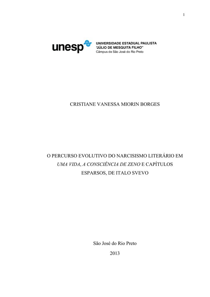 1 Câmpus de São José do Rio Preto CRISTIANE VANESSA MIORIN BORGES O PERCURSO EVOLUTIVO DO NARCISISMO LITERÁRIO EM UMA VIDA, A CONSCIÊNCIA DE ZENO E CAPÍTULOS ESPARSOS, DE ITALO SVEVO São José do Rio Preto 2013 2 CRISTIANE VANESSA MIORIN BORGES O PERCURSO EVOLUTIVO DO NARCISISMO LITERÁRIO EM UMA VIDA, A CONSCIÊNCIA DE ZENO E CAPÍTULOS ESPARSOS, DE ITALO SVEVO Tese apresentada como parte dos requisitos para obtenção do título de Doutora em Letras, junto ao Programa de Pós-Graduação em Letras, Área de Concentração – Teoria da Literatura, do Instituto de Biociências, Letras e Ciências Exatas da Universidade Estadual Paulista “Júlio de Mesquita Filho”, Campus de São José do Rio Preto. Orientadora: Profa. Tommasello Ramos São José do Rio Preto 2013 Dra. Maria Celeste 3 CRISTIANE VANESSA MIORIN BORGES O PERCURSO EVOLUTIVO DO NARCISISMO LITERÁRIO EM UMA VIDA, A CONSCIÊNCIA DE ZENO E CAPÍTULOS ESPARSOS, DE ITALO SVEVO Tese apresentada como parte dos requisitos para obtenção do título de Doutora Letras, junto ao Programa de Pós-Graduação em Letras, Área de Concentração – Teoria da Literatura, do Instituto de Biociências, Letras e Ciências Exatas da Universidade Estadual Paulista “Júlio de Mesquita Filho”, Campus de São José do Rio Preto. Orientadora: Profa. Dra. Maria Celeste Tommasello Ramos Banca Examinadora Profa. Dra. Maria Celeste Tommasello Ramos UNESP – São José do Rio Preto Prof. Dr. Álvaro Luiz Hattnher UNESP – São José do Rio Preto Profa. Dra. Maria Cláudia Rodrigues Alves UNESP – São José do Rio Preto Profa. Dra. Elza Kioko Nakayama Nenoki do Couto UFG – Goiânia Profa. Dra. Cláudia Fernanda Campos Mauro UNESP – Araraquara São José do Rio Preto 14 de Fevereiro de 2013 4 DEDICATÓRIA O tempo trouxe o amor, um amor sem fim, que pode ser medido somente na intensidade do abraço de Luisa, Luisa cantada em tantas canções, em tantos amores, tantas luas, e sonhos de crepom. Luisa dos sonhos que eu roubei para mim, dos sonhos de novelo vindos do outro lado do mar, de todas as coisas que quero ensinar ainda enquanto aprendo. Queria também eu um antídoto que te fizesse grande de repente e te fizesse voar sobre as trincheiras e sobre os gigantes de chifres monstruosos, mas te amo, não posso fazer isso, tua vida se fará de todas as cores e de pequenos sons de espanto, de passarinhos e aviões, de flores que nascem sem motivo. A você, Luisa, dedico. 5 AGRADECIMENTOS Agradeço a todos os que de alguma forma contribuíram para a concretização deste estudo, facilitando de várias maneiras minha longa vivência com Svevo. Dentre esses cito: • Meu amor-marido-companheiro André que, com sua tranquilidade e amor, sempre apazigou meu espírito; • Minha filha Luisa, pelos grandes ensinamentos do viver, pela renovação e força, por um amor que não tem fim; • Meu pai e minha mãe, que me ensinaram a ter respeito, fé, responsabilidade, perseverança, paciência e acima de tudo amor; • Meus sogros, pela parceria e pelos fins de semana animados; • Meus irmãos, cunhadas e cunhados, pelas conversas, pelos dilemas e crescimento, mas acima de tudo pelos meus sobrinhos lindos: Renan, Amanda, Gabriel, Amanda e Pedro; • Meus amigos, refúgios de tranquilidade e bons momentos; • Minha querida comadre orientadora Profa. Dra. Maria Celeste Tommasello Ramos que me acompanhou, aconselhou e orientou dentro e fora dos limites da universidade; • Meus queridos amigos do Nearp, pelo apoio fraternal e espiritual; • Meu querido tradutor e amigo Reginaldo Francisco, pela parceria inigualável e pelas conversas ao léu; • Todos os professores da Pós-Graduação em Letras do Ibilce, sempre tão atenciosos e prestativos; • Todos os funcionários da Seção de Pós-Graduação, sempre prontos a auxiliar; • CNPq, pela concessão da bolsa de estudos que proporcionou total dedicação à minha pesquisa. 6 RESUMO Esta tese apresenta um estudo sobre os romances Uma vida e A consciência de Zeno e sobre os capítulos esparsos “Un contratto”, “Le confessioni del vegliardo”, “Umbertino”, “Il mio ozio” e “Il vecchione” do autor italiano Italo Svevo. A partir da análise dos textos, o trabalho mostra como essas narrativas são exemplos do narcisismo literário, em que o artifício utilizado para fazer Literatura se torna a própria matéria narrada. Além disso, o estudo mostra a evidente evolução do trabalho de Svevo no que diz respeito ao artefato crítico e à consciência do trabalho criativo, uma vez que a presente tese analisa três momentos distintos de sua obra e demonstra um inegável amadurecimento dessas questões. A ênfase da análise empreendida está nos elementos referentes às autobiografias ficcionais e à metaficção, que dão ensejo também ao estudo sobre o foco narrativo e o tempo. Palavras-chave: Italo Svevo, Literatura italiana, Narcisismo literário, metaficção, autobiografia ficcional. 7 ABSTRACT This thesis presents a study about the novels A life and Zeno’s conscience and some sparse chapters, i.e. “Un contratto”, “Le confessioni del vegliardo”, “Umbertino”, “Il mio ozio” and “Il vecchione” from the Italian author Italo Svevo. Based on the analysis of the texts, the work shows how these narratives are examples of literary narcissism, in which the employed artifice to do Literature becomes the narrated theme itself. Furthermore, the study shows a clear evolution of Svevo's work in relation to the critic artifact and the consciousness of the creative work, since this thesis examines three different moments of his work and demonstrates an undeniable maturity of these issues. The emphasis of the undertaken analysis relies on the constituents relating to the fictional autobiographies and to the metafiction, giving rise also to the study of narrative focus and time. Key-words: Italo Svevo, Italian Literature, Literary Narcissism, Metafiction, Fictional Autobiograp