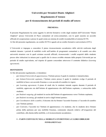 Università per Stranieri Dante Alighieri Regolamento d’Ateneo per il riconoscimento dei periodi di studio all’estero PREMESSA Il presente Regolamento ha come oggetto le attività formative svolte dagli studenti dell’Università “Dante Alighieri” presso Università di Paesi comunitari ed extra-comunitari, con le quali sussista un accordo ufficiale di cooperazione e presso le quali esista un sistema di crediti riconducibile al sistema ECTS. Ai fini del presente regolamento, un credito ECTS è uguale ad un credito formativo universitario (CFU). L’Università si impegna a concedere il pieno riconoscimento accademico delle attività realizzata dagli studenti durante i periodi di mobilità svolti nell’ambito di programmi comunitari e di scambi con altre università straniere con le quali esistano accordi ufficiali, riconoscendo i crediti acquisiti dallo studente presso altre istituzioni in misura pari a quelli che lo stesso avrebbe ottenuto dalla propria Università per un periodo di studio equivalente, nel rispetto di quanto concordato attraverso il contratto didattico (learning agreement). DEFINIZIONI Ai fini del presente regolamento, si intendono: - per Istituto/Università di appartenenza, l’Istituto presso il quale lo studente è immatricolato; - per Istituto/Università ospitante, l’Istituto estero presso il quale lo studente svolge il periodo di mobilità in base a un accordo Erasmus o a un accordo di scambio in vigore; - per Learning agreement, il piano di studi che lo studente intende seguire durante il periodo di mobilità, approvato sia dall’Istituto di appartenenza che dall’Istituto ospitante, e sottoscritto dallo studente; - per Studenti outgoing, gli studenti in uscita dall’Istituto di appartenenza verso l’Istituto ospitante; - per Studenti incoming, gli studenti in arrivo dagli Istituti partner; - per Coordinatore dello scambio, il docente che ha firmato l’accordo Erasmus o l’accordo di scambio con l’Istituto partner; - per Contratto, l’accordo tra l’Istituto di appartenenza e lo studente, che lo studente deve firmare prima della partenza per una mobilità Erasmus, contenente clausole relative all’erogazione del contributo, alla durata della mobilità, e al riconoscimento accademico. I – PARTI COINVOLTE NELLA MOBILITÀ STUDENTESCA E LORO OBBLIGHI FONDAMENTALI Lo studente si impegna ad osservare e a completare il piano formativo concordato nel learning agreement. Possono giustificare il mancato raggiungimento di tale obiettivo solo sopravvenute cause di forza maggiore, come, ad esempio, la malattia debitamente certificata. L’Istituto ospitante si impegna a fornire allo studente l’istruzione e il supporto accademico concordati. L’Istituto di appartenenza si impegna a riconoscere allo studente in mobilità le attività formative svolte e i crediti acquisiti in conformità a quanto specificato nel piano didattico concordato attraverso learning agreement. II - DOCUMENTI ESSENZIALI AI FINI DEL RICONOSCIMENTO ACCADEMICO DELLE ATTIVITÀ FORMATIVE SVOLTE DURANTE IL PERIODO DI MOBILITÀ 1. IL LEARNING AGREEMENT a) in caso di mobilità per studio con crediti Il learning agreement rappresenta lo strumento fondamentale nella procedura di riconoscimento delle attività formative svolte durante un periodo di mobilità: contiene la lista degli insegnamenti da seguire, con i relativi crediti, e i corsi identificati come equipollenti presso l’Università di appartenenza, concordata tra lo studente, l’istituto di appartenenza e quello ospitante. Il learning agreement deve essere redatto in forma scritta e va siglato dalle tre parti coinvolte, di norma prima della partenza dello studente. Esso è suscettibile di modifica, che deve essere formalmente accettata e sottoscritta da ciascuna delle tre parti interessate entro 30 giorni dall’inizio dei corsi presso l’Università ospitante, attraverso moduli appositamente predisposti. Nessuna attività didattica svolta all’estero dallo studente potrà essere riconosciuta se non inserita nel learning agreement approvato, con le eventuali successive variazioni. b) in caso di mobilità per attività di ricerca per la tesi Per le mobilità che prevedono unicamente attività di ricerca per la tesi, il learning agreement va comunque compilato e sottoscritto dalle tre parti coinvolte; in questo caso, il learning agreement dovrà riportare il tema della ricerca o l’argomento della tesi, mentre non saranno indicati crediti. 2. CERTIFICATO DEGLI ESAMI/ATTIVITÀ FORMATIVE (TRANSCRIPT OF RECORDS) Al termine del periodo di studio all’estero, l’Istituto ospitante rilascia allo studente un attestato denominato transcript of records o certificato delle attività formative svolte, debitamente sottoscritto e completo dei risultati conseguiti dall’interessato in ciascuna delle attività formative elencate. L’Istituto di appartenenza garantisce allo studente il completo riconoscimento accademico degli studi effettuati presso l’Istituto ospitante, certificati nel transcript of records, come parte integrante del proprio corso di studio e per un numero di crediti pari a quelli attribuiti per l’esame considerato equivalente presso l’Istituto di appartenenza, salvo casi particolari che verranno valutati dal responsabile accademico del corso di studi interessato. III - PROCEDURA PER IL RICONOSCIMENTO DEI PERIODI DI STUDIO ALL’ESTERO A) Per gli Studenti in uscita (mobilità outgoing) 1. Elaborazione del learning agreement Prima della partenza, lo studente ammesso a trascorrere un periodo di studio all’estero, dopo un’attenta consultazione delle informazioni disponibili sull’offerta formativa dell’Università ospitante (tramite il sito internet, eventuali guide o materiale informativo disponibile presso gli uffici preposti alla mobilità studentesca all’interno dell’Università per Stranieri), d’intesa con il docente Coordinatore dello scambio, elabora il proprio piano di studio esplicitandolo nel