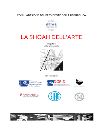 CON L ‘ADESIONE DEL PRESIDENTE DELLA REPUBBLICA LA SHOAH DELL’ARTE Progetto di Vittorio Pavoncello con il patrocinio LA SHOAH DELL’ARTE 27 gennaio 2015 – Giorno della Memoria presso G.N.A.M. Programma Mattina Il 27 gennaio 2015 presso la Sala del Mito La Shoah dell’Arte Saluto della dott.ssa Emanuela Garrone Ore 10.30 Lettura di alcuni brani tratti dal libro IL DIARIO DIGUSEN di Aldo Carpi già direttore dell’Accademia di Brera. Leggono Arianna Ninchi e Giuseppe Lorin, suona alla chitarra M° MauroRestivo Ore 11.00 Introduzione a cura della dott.ssa Emanuela Garrone che modererà la tavola rotonda sul tema della Shoah dell’Arte Relatori: Prof. Vincenzo Bilardello Università di Roma La Sapienza (Grosz, l’espressionismo e l’arte astratta) Prof.ssa Rossana Buono Università degli studi di Roma Tor Vergata (La ricezione problematica del saluto nazista in performances e installazioni artistiche) Prof.ssa Laura Iamurri Università degli Studi di Roma Tre (Il caso Cagli: la memoria difficile del dopoguerra) Prof. Lutz Klinkhammer Istituto Storico Germanico di Roma (La Germania nazista e la guerra per e contro l’arte) LA SHOAH DELL’ARTE 27 gennaio 2015 – Giorno della Memoria presso G.N.A.M Programma Pomeriggio Il 27 gennaio 2015 presso la Sala della Belle Epoque TEATRO Saluto della dott.ssa Maria Vittoria Marini Clarelli Ore 16.00 tavola rotonda Introduzione di Vittorio Pavoncello Relatori: Prof. Vittorio De Benedetti (Mio zio Aldo De Benedetti) Prof.ssa Donatella Orecchia (Sarah Bernhardt: la diva, le Tournée e l’inizio dell’antisemitismo) Prof.ssa Antonella Ottai (The Jewish Kulturbund il teatro a Berlino fino al 1942) Premio Teatro Cinema e Shoah Presentazione Bando V edizione ECAD, Fondazione Museo della Shoah e CeRSE Università degli studi di Roma Tor Vergata Ore 17.15 lettura spettacolo L’ultima risata – I comici nei campi di concentramento nazista di Antonella Ottai con alla chitarra al pianoforte Franca D’Amato Bruno Maccallini Alvia Reale Marco Paolucci Franca D’Amato Regia Vittorio Pavoncello LA SHOAH DELL’ARTE 27 gennaio 2015 – Giorno della Memoria un progetto ECAD di Vittorio Pavoncello Responsabile ECAD per le ricerche museologiche Dott.ssa Chiara Tomassi Responsabili ECAD per le ricerche teatrali Dott.sse Alessandra Blanco e Maria Faiella ©ECAD ebraismo culture arti drammatiche Viale delle Mura Gianicolensi 96 – 00152 Roma Tel. 366.4545656 333.3336113 www.ecad.name [email protected]