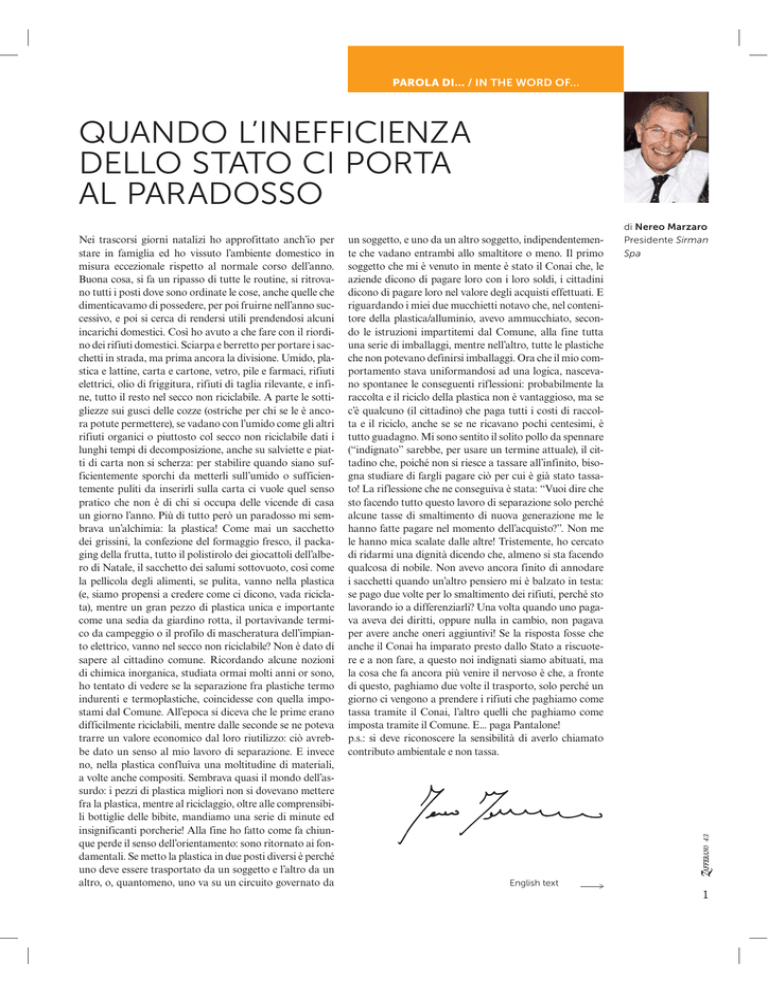 PAROLA DI... / IN THE WORD OF… QUANDO L’INEFFICIENZA DELLO STATO CI PORTA AL PARADOSSO un soggetto, e uno da un altro soggetto, indipendentemente che vadano entrambi allo smaltitore o meno. Il primo soggetto che mi è venuto in mente è stato il Conai che, le aziende dicono di pagare loro con i loro soldi, i cittadini dicono di pagare loro nel valore degli acquisti effettuati. E riguardando i miei due mucchietti notavo che, nel contenitore della plastica/alluminio, avevo ammucchiato, secondo le istruzioni impartitemi dal Comune, alla fine tutta una serie di imballaggi, mentre nell’altro, tutte le plastiche che non potevano definirsi imballaggi. Ora che il mio comportamento stava uniformandosi ad una logica, nascevano spontanee le conseguenti riflessioni: probabilmente la raccolta e il riciclo della plastica non è vantaggioso, ma se c’è qualcuno (il cittadino) che paga tutti i costi di raccolta e il riciclo, anche se se ne ricavano pochi centesimi, è tutto guadagno. Mi sono sentito il solito pollo da spennare (“indignato” sarebbe, per usare un termine attuale), il cittadino che, poiché non si riesce a tassare all’infinito, bisogna studiare di fargli pagare ciò per cui è già stato tassato! La riflessione che ne conseguiva è stata: “Vuoi dire che sto facendo tutto questo lavoro di separazione solo perché alcune tasse di smaltimento di nuova generazione me le hanno fatte pagare nel momento dell’acquisto?”. Non me le hanno mica scalate dalle altre! Tristemente, ho cercato di ridarmi una dignità dicendo che, almeno si sta facendo qualcosa di nobile. Non avevo ancora finito di annodare i sacchetti quando un’altro pensiero mi è balzato in testa: se pago due volte per lo smaltimento dei rifiuti, perché sto lavorando io a differenziarli? Una volta quando uno pagava aveva dei diritti, oppure nulla in cambio, non pagava per avere anche oneri aggiuntivi! Se la risposta fosse che anche il Conai ha imparato presto dallo Stato a riscuotere e a non fare, a questo noi indignati siamo abituati, ma la cosa che fa ancora più venire il nervoso è che, a fronte di questo, paghiamo due volte il trasporto, solo perché un giorno ci vengono a prendere i rifiuti che paghiamo come tassa tramite il Conai, l’altro quelli che paghiamo come imposta tramite il Comune. E... paga Pantalone! p.s.: si deve riconoscere la sensibilità di averlo chiamato contributo ambientale e non tassa. di Nereo Marzaro Presidente Sirman Spa 43 Nei trascorsi giorni natalizi ho approfittato anch’io per stare in famiglia ed ho vissuto l’ambiente domestico in misura eccezionale rispetto al normale corso dell’anno. Buona cosa, si fa un ripasso di tutte le routine, si ritrovano tutti i posti dove sono ordinate le cose, anche quelle che dimenticavamo di possedere, per poi fruirne nell’anno successivo, e poi si cerca di rendersi utili prendendosi alcuni incarichi domestici. Così ho avuto a che fare con il riordino dei rifiuti domestici. Sciarpa e berretto per portare i sacchetti in strada, ma prima ancora la divisione. Umido, plastica e lattine, carta e cartone, vetro, pile e farmaci, rifiuti elettrici, olio di friggitura, rifiuti di taglia rilevante, e infine, tutto il resto nel secco non riciclabile. A parte le sottigliezze sui gusci delle cozze (ostriche per chi se le è ancora potute permettere), se vadano con l’umido come gli altri rifiuti organici o piuttosto col secco non riciclabile dati i lunghi tempi di decomposizione, anche su salviette e piatti di carta non si scherza: per stabilire quando siano sufficientemente sporchi da metterli sull’umido o sufficientemente puliti da inserirli sulla carta ci vuole quel senso pratico che non è di chi si occupa delle vicende di casa un giorno l’anno. Più di tutto però un paradosso mi sembrava un’alchimia: la plastica! Come mai un sacchetto dei grissini, la confezione del formaggio fresco, il packaging della frutta, tutto il polistirolo dei giocattoli dell’albero di Natale, il sacchetto dei salumi sottovuoto, così come la pellicola degli alimenti, se pulita, vanno nella plastica (e, siamo propensi a credere come ci dicono, vada riciclata), mentre un gran pezzo di plastica unica e importante come una sedia da giardino rotta, il portavivande termico da campeggio o il profilo di mascheratura dell’impianto elettrico, vanno nel secco non riciclabile? Non è dato di sapere al cittadino comune. Ricordando alcune nozioni di chimica inorganica, studiata ormai molti anni or sono, ho tentato di vedere se la separazione fra plastiche termo indurenti e termoplastiche, coincidesse con quella impostami dal Comune. All’epoca si diceva che le prime erano difficilmente riciclabili, mentre dalle seconde se ne poteva trarre un valore economico dal loro riutilizzo: ciò avrebbe dato un senso al mio lavoro di separazione. E invece no, nella plastica confluiva una moltitudine di materiali, a volte anche compositi. Sembrava quasi il mondo dell’assurdo: i pezzi di plastica migliori non si dovevano mettere fra la plastica, mentre al riciclaggio, oltre alle comprensibili bottiglie delle bibite, mandiamo una serie di minute ed insignificanti porcherie! Alla fine ho fatto come fa chiunque perde il senso dell’orientamento: sono ritornato ai fondamentali. Se metto la plastica in due posti diversi è perché uno deve essere trasportato da un soggetto e l’altro da un altro, o, quantomeno, uno va su un circuito governato da English text 1 PAROLA DI... / IN THE WORD OF… WHEN STATE NEFFICIENCY REACHES PARADOXICAL PROPORTIONS 43 di Nereo Marzaro Presidente Sirman Spa 2 Over Christmas, I took advantage of the break to spend some time with my family, and I experienced my domestic surroundings in a different way compared to the rest of the year. A good thing. You can get back into all the usual routines, find all the places where things have been tidied away, even those that you had forgotten you had, so that you can use them in the new year. And then you can make yours