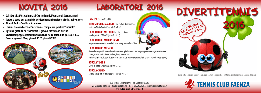 NOVITÀ 2016 • • • • • • Dal 19/6 al 25/6 settimana al Centro Tennis Federale di Serramazzoni Serate a tema per bambini e genitori con animazione, giochi, baby dance Gite ad Amico Cavallo e Acquajoss Corsi di tiro con l’arco all’interno del complesso sportivo “Graziola” Opzione gratuita di trascorrere il giovedì mattina in piscina Diverticampeggio immersi nella natura nello splendido parco del T.C. Faenza: giovedì 23/6, giovedì 21/7, giovedì 25/8 LABORATORI 2016 DIVERTITENNIS INGLESE (martedì 15-17) TRADIZIONI ROMAGNOLE Una volta ci divertivamo così, con Mario Gurioli (mercoledì 10-12) LABORATORIO MOTORIO In collaborazione con la palestra FIT&JOY (giovedì 15-17) re emp ate s da est ua a noi! t la eme i ins 2016 LABORATORIO MANI IN PASTA Impariamo a creare la pizza insime a Jonny (venerdì mattina) LABORATORIO MUSICAL Vivere la magia del musical sperimentando gli elementi che compongono questo genere teatrale: canto, danza, recitazione, inglese, body percussion. Dal 4/7 al 8/7 - dal 25/7 al 29/7 - dal 29/8 al 2/9 (martedì e mercoledì 15-17 - giovedì 19:30-22:00) SCUOLA TENNIS Corso di tennis (martedì e giovedì 15-17) SCUOLA CALCIO Scuola calcio con tecnici federali (venerdì 15-17) C.A. Faenza Sezione Tennis “Teo Gaudenzi” A.S.D. Via Medaglie d’oro, 2/A - 48018 Faenza (RA) - Tel. e Fax 0546 25266 - [email protected] www.tennisclubfaenza.it Campi estivi a indirizzo sportivo e ludico per bambini e ragazzi dai 4 ai 14 anni con il Patrocinio del Comune di Faenza TENNIS CLUB FAENZA Benvenuti ai Campi Estivi 2016 Tutte le nostre attrezzature sono a disposizione dei partecipanti: campi da tennis, minitennis, calcetto, ping pong e calcio balilla. In caso di maltempo le attività saranno svolte al coperto. Il nostro staff è composto da educatori laureati in scienza della formazione e da istruttori F.I.T. TI ASPETTIAMO AL DIVERTITENNIS!!! QUOTE DIVERTITENNIS il cre componibile e personalizzabile! Turni settimanali dal 07/06/2016 al 14/09/2016 senza interruzioni Sconto 20% allievi SAT, figli di soci e fratelli TARIFFE 2016 - lunedì / venerdì 7:30 - 17:30 TIPO ISCRIZIONE MATTINA (7:30 - 12:30) PASTO MATTINA+PASTO (7:30 - 14:30) POMERIGGIO (14:30 - 17:30) GIORNATA INTERA PASTO INCLUSO (7:30 - 17:30) Abb. Settimanale € 50 € 30 € 80 € 35 € 115 Servizi singoli € 13 €6 € 19 €8 € 27 Componi a piacere le tue giornate scegliendo tra le tantissime proposte a tua disposizione! TARIFFE 2016 CUCCIOLI (nati negli anni 2011 e 2012) - lunedì / venerdì 7:30 - 17:30 TIPO ISCRIZIONE MATTINA (7:30 - 12:30) PASTO MATTINA+PASTO (7:30 - 14:30) POMERIGGIO (14:30 - 17:30) GIORNATA INTERA PASTO INCLUSO (7:30 - 17:30) Abb. Settimanale € 40 € 30 € 70 € 35 € 105 Servizi singoli € 11 €6 € 17 €8 € 25 TARIFFE SETTIMANALI LABORATORI, CORSI, PROLUNGAMENTO ORARI LABORATORIO LABORATORIO LABORATORIO LABORATORIO TRADIZIONI INGLESE MUSICAL MOTORIO ROMAGNOLE €6 Gratuito € 20 Gratuito TARIFFE SPECIALI • • TARIFFE SPECIALI 2016 Programma sconti calcolato in base al numero di settimane intere di presenza. 20% di sconto per i bambini che hanno frequentato i corsi di tennis invernali, i figli di soci del circolo tennis e in caso di iscrizione di uno o più fratelli. TARIFFE SPECIALI 2016 CUCCIOLI LABORATORIO MANI IN PASTA SCUOLA TENNIS (2 lezioni settimanali) SCUOLA CALCIO SABATO 08:30 - 12:30 Gratuito € 12 €6 € 12 E’ previsto uno sconto sulla quarta e ottava settimana intera di presenza per i figli di soci del circolo tennis. SETTIMANA ALL INCLUSIVE € 135 Lunedì-Venerdi giornata intera + pranzo · Sabato mattina 08:30 - 12:30 Tutti i Laboratori, Scuola Tennis, Scuola Calcio