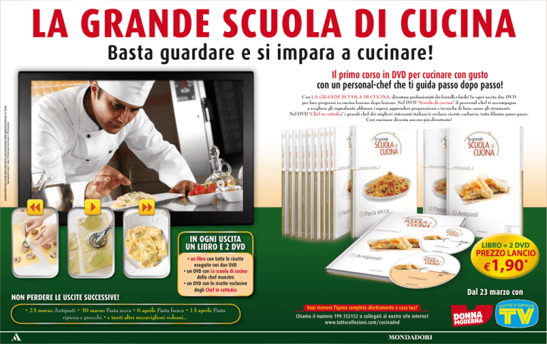 LA GRANDE SCUOLA DI CUCINA Basta guardare e si impara a cucinare! Il primo corso in dvd per cucinare con gusto con un personal-chef che ti guida passo dopo passo! LA NATURA DELL’OPERA SI PRESTA AD ESSERE OGGETTO DI NUOVE SERIE CHE, SE REALIZZATE DALL’EDITORE, SARANNO COMUNICATE NEL RISPETTO DEL D. LGS 146/2007. *Opera composta da 16 volumi. 1° volume E 1,90 (rivista esclusa). Uscite successive E 12,90 (rivista esclusa). Con La Grande Scuola di Cucina, diventare professionisti dei fornelli è facile! In ogni uscita due DVD per fare progressi in cucina lezione dopo lezione. Nel DVD “Scuola di cucina” il personal-chef ti accompagna a scegliere gli ingredienti, abbinare i sapori, apprendere preparazioni e tecniche di base, usare gli strumenti. Nel DVD “Chef in cattedra” i grandi chef dei migliori ristoranti italiani ti svelano ricette esclusive, tutte filmate passo passo. Così cucinare diventa ancora più divertente! IN OGNI USCITA un libro e 2 dvd libro + 2 dvd prezzo lancio * • un libro con tutte le ricette eseguite nei due dvd • un dvd con La scuola di cucina dello chef maestro • un dvd con le ricette esclusive degli Chef in cattedra e1,90 Dal 23 marzo con non perdere le uscite successive! • 23 marzo Antipasti • 30 marzo Pasta secca • 6 aprile Pasta fresca • 13 aprile Pasta ripiena e gnocchi • e tanti altri meravigliosi volumi... Vuoi ricevere l’opera completa direttamente a casa tua? Chiama il numero 199.152152 o collegati al nostro sito internet www.tuttocollezioni.com/cucinadvd