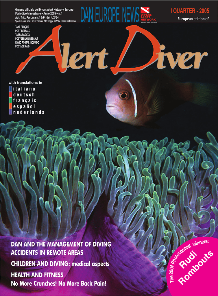 Organo ufficiale del Divers Alert Network Europe Periodico trimestrale - Anno 2005 - n. 1 Aut. Trib. Pescara n. 19/91 del 4/2/94 Sped. in abb. post. art. 2 comma 20/c Legge 662/96 - Filiale di Teramo DAN EUROPE NEWS I QUARTER - 2005 European edition of Your dive safety association TAXE PERÇUE PORT BETAALD TASSA PAGATA POSTGEBÜHR BEZAHLT ENVÍO POSTAL INCLUIDO POSTAGE PAID with translations in CHILDREN AND DIVING: medical aspects HEALTH AND FITNESS No More Crunches! No More Back Pain! nners: i w t tes n o R R om u di bo ut s DAN AND THE MANAGEMENT OF DIVING ACCIDENTS IN REMOTE AREAS The 2004 Pho toc italiano deutsch français español nederlands Divers Alert Network (DAN), a nonprofit organization, exists to provide expert medical information and advice for the benefit of the diving public. DAN´s historical and primary function is to provide emergency medical advice and assistance for underwater diving accidents, to work to prevent accidents and to promote diving safety. Second, DAN promotes and supports underwater DAN EUROPE FOUNDATION Territory: Geographical Europe, European territories and protectorates, with regional IDAN responsibility for the Mediterranean Sea and Shore, the Red Sea, the Arabian Gulf, Ethiopia, and the Maldives. REGISTERED ADDRESS AND HEADQUARTERS: 26, TRIQ FIDIEL ZARB, GHARGHUR NXR07, MALTA. TEL: +356 2141 9804; FAX: +356 2141 9294 - EMAIL: [email protected] OPERATIONS HEAD OFFICE: P.O. BOX: DAN, 64026 Roseto, Italy, PHONE: +39 085 893 0333 FAX: +39 085 893 0050 E-MAIL: [email protected] WEBSITE: http://www.daneurope.org DAN Europe Regional Offices DAN Europe Balkans (Serbia and Montenegro, Bosnia and Herzegovina) AREA DIRECTOR: Prof. Alessandro Marroni REGIONAL DIRECTOR: Dr. Dragana Ivkovic, M. D. Milovana Marinkovica 17. 11000 Belgrade, Serbia and Montenegro PHONE AND FAX: +381 (0) 11 47 10 40 MOBILE +381 (0) 63 8129 687 E-MAIL: [email protected] DAN Europe BeNeLux (Belgium, Netherlands, Luxembourg) AREA DIRECTOR: Prof. Costantino Balestra Ph.D. MEDICAL DIRECTOR: Dr. Peter Germonpre M.D. REGIONAL HEAD OF Training (Dutch): Guy Thomas REGIONAL HEAD OF TRAINING ( FRENCH): Frédéric Venderschueren PHONE AND FAX: refer to Central Office in Italy EMAIL: [email protected] ˇ DAN Europe Cesko AREA DIRECTOR: Prof. Alessandro Marroni NATIONAL DIRECTOR: Dr. Pavel Macura M.D. K brizkam 4, Hradec Kralove, PSC 500 09, Czech Republic PHONE + 420 495 512 959 Fax-phone + 420 495 264 641 EMAIL: [email protected] DAN Europe Croatia AREA DIRECTOR: Prof Alessandro Marroni NATIONAL DIRECTOR: Dr. Darko Kovacevic M.D. Kruge 19A, 10000 Zagreb, Croatia, FAX: +385 (0)1 6151900 EMAIL: [email protected] DAN Europe France AREA DIRECTOR: Prof. Costantino Balestra Ph.D. AREA MEDICAL DIRECTOR: Dr. Peter Germonpre M.D. NATIONAL MEDICAL DIRECTOR: Dr. Bruno Grandjean M.D. Service de Médecine Hyperbare, Centre Hospitalier d'Ajaccio, 27 Avenue Impératrice Eugénie, 20303 AJACCIO CEDEX PHONE AND FAX: refer to Central Office in Italy E-MAIL: [email protected] diving research and education, particularly as it relates to the improvement of diving safety, medical treatment and first aid. Third, DAN strives to provide the most accurate, up-to-date and unbiased information on issues of common concern to the diving public, primarily, but not exclusively, for diving safety. DAN Mission Statement FAX: +34 93 450 3736 E-MAIL: [email protected] FAX:+972-3-9213838 E-MAIL: [email protected] DAN Europe Italia NATIONAL DIRECTOR: Dr. Nuccia De Angelis MEDICAL DIRECTOR: Prof. Alessandro Marroni M.D. P.O. Box DAN, 64026 Roseto , Italy, PHONE: +39 085 893 0333 FAX: +39 085 893 0050. E-MAIL: [email protected] The other International DAN Organizations DAN Europe Malta NATIONAL DIRECTOR: Dr. Ramiro Cali Corleo M.D. 26, Triq Fidiel Zarb, Gharghur NXR07, Malta. Tel: +356 2141 9804; Fax: +356 2141 9294 E-MAIL: [email protected] DAN Europe Polska AREA DIRECTOR: Prof Alessandro Marroni MEDICAL DIRECTOR: Zdzislaw Sicko, M.D., Ph.D. MEMBERSHIP ASSISTANCE COORDINATOR: Jacek Kot, M.D., National Center for Hyperbaric Medicine, Institute of Maritime and Tropical Medicine, Medical University of Gdansk Powstania Styczniowego 9B Gdynia 81-519, Poland PHONE +48 58 699 8610 (08:00 – 15:00) FAX: +48 58 622 2789 E-MAIL: [email protected] DAN Europe Skandinavien (Denmark, Norway, Sweden, Finland) AREA DIRECTOR: Dr. Ole Hyldegaard, MD, Ph.D. P.O.Box 306, 2830 Virum, Denmark. PHONE: +45 45 836330 FAX: +45 45 836 331 E-MAIL: [email protected] DAN Europe Slovenia AREA DIRECTOR: Prof Alessandro Marroni NATIONAL DIRECTOR: Prof. Dr. Igor Mekjavic Department of Automation, Biocybernetics and Robotics Jozef Stefan Institute Jamova 39, SI-1000 Ljubljana, Slovenia TEL: +386 41 696 558 FAX: +386 1 423 2209 EMAIL: [email protected] DAN Europe Suisse NATIONAL DIRECTOR: Dr.Jürg Wendling M.D. Faubourg du Lac 67, 2502 Biel, Switzerland, PHONE: +41 (0)32 322 3823 FAX: +41 (0)32 322 3839 E-MAIL: [email protected] DAN Europe United Kingdom & Ireland AREA DIRECTOR: Dr. Ramiro Cali Corleo, M.D. REGIONAL MANAGER: Christopher Young CertEd Unit 11, The Courtyard, - Whitwick Business Park, Stenson Road Coalville LE67 4JP, United Kingdom PHONE: national 0870 872 8888; Ireland +44 870 872 8888; international +44 870 872 8888 FAX: national 0870 872 5555; Ireland +44 870 872 5555; international +44 870 872 5555 E-MAIL: [email protected] DAN Europe Affiliate Organizations DAN Europe Germany, Austria & Hungary AREA DIRECTOR: Dr. Ulrich van Laak M.D. Eichkoppelweg 70, 24119 Kronshagen, Germany PHONE: +49 (0)431 549 861 (Monday and Thursday 18 until 21 h CET) FAX: +49 (0)431 544 288 EMAIL: [email protected] DAN Maldives AREA DIRECTOR: Prof Alessandro Marroni MEDICAL DIRECTOR: Dr. Guenter Frey, M.D. Bandos Hyperbaric & Medical Clinic Bandos Island Resort. Republic of Maldives FAX: +960 44 0060 E-MAIL: [email protected] DAN Europe Hellas AREA DIRECTOR: Prof Alessandro Marroni MEDICAL DIRECTOR: Dr Bassilis Zachariades C/o Hyperbaric Medical Center, 5 Klazomenon st., Ta