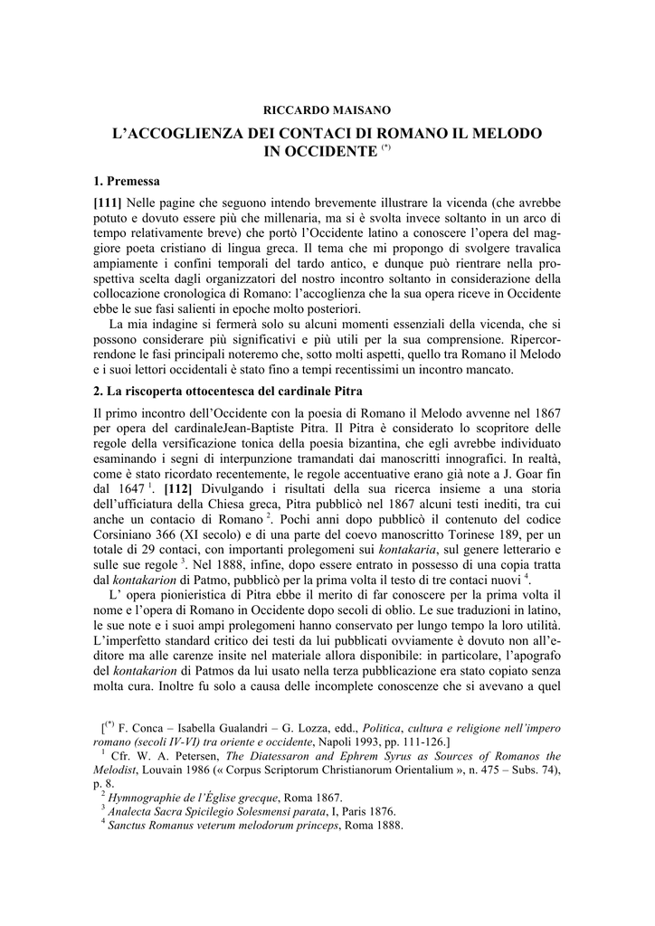 solo uno il contacio che Maas poté pubblicare criticamente sulla base dell’intera tradizione manoscritta a lui nota e secondo schemi strofici attentamente predisposti 9. L’edizione completa rimase allo stadio manoscritto, fu portata da Paul Maas in esilio ad