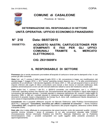 COPIA Det. 011/2015 RAG.. COMUNE di CASALEONE Provincia di Verona DETERMINAZIONE DEL RESPONSABILE DI SETTORE UNITÀ OPERATIVA: UFFICIO ECONOMICO-FINANZIARIO N° 218 Data: 08/07/2015 OGGETTO: ACQUISTO NASTRI, CARTUCCE/TONER PER STAMPANTI E FAX PER GLI UFFICI COMUNALI TRAMITE IL MERCATO ELETTRONICO. CIG: Z6315609F4 IL RESPONSABILE DI SETTORE Premesso che si rende necessario provvedere all’acquisto di cartucce e toner per le stampanti e fax in uso presso gli uffici comunali; Visto l’art. art. 7, comma 2 della Legge 6 luglio 2012, n. 94, conversione in legge, con modificazioni, del decreto-legge 7 maggio 2012, n. 52 ( “prima” spending review) dispone che (…) “le altre amministrazioni pubbliche di cui all’articolo 1 del decreto legislativo 30 marzo 2001, n. 165, per gli acquisti di beni e servizi di importo inferiore alla soglia di rilievo comunitario sono tenute a fare ricorso al mercato elettronico della pubblica amministrazione ovvero ad altri mercati elettronici istituiti ai sensi del medesimo articolo 328”; Visto inoltre l’art. 1, comma 1 del D.L. n. 95/2012 convertito, con modificazioni, con L. n. 135/2012 (“seconda” spending review) che dispone che “Successivamente alla data di entrata in vigore della legge di conversione del presente decreto, i contratti stipulati in violazione dell'articolo 26, comma 3 della legge 23 dicembre 1999, n. 488 ed i contratti stipulati in violazione degli obblighi di approvvigionarsi attraverso gli strumenti di acquisto messi a disposizione da Consip S.p.A. sono nulli, costituiscono illecito disciplinare e sono causa di responsabilità amministrativa (…)”; Considerato che è possibile effettuare acquisti nel Mercato Elettronico della Pubblica Amministrazione (M.E.P.A.), catergoria: “Cancelleria, macchina per ufficio e materiale di consumo” – Nome Iniziativa: “Cancelleria 104”, scegliendo quelli che meglio rispondono alle proprie esigenze, attraverso ordine diretto d’acquisto (OdA); Dato atto che è stata effettuata la comparazione dei prezzi tenendo conto dei parametri qualità / prezzo / quantità minime richieste / tempi di consegna, di cui alle convenzioni stipulate dalla CONSIP (Concessionaria Servizi Informativi Pubblici) e/o M.E.P.A. (Mercato Elettronico per le Pubbliche Amministrazioni) meta – prodotti comparabili con quelli oggetto della presente procedura di approvvigionamento; Pag. 1/4 Dato atto dall'indagine esplorativa di mercato effettuata sui prodotti offerti sulla piattaforma MEPA da vari fornitori abilitati, è emerso che la ditta Secursystem s.r.l. con sede ad Ascoli Piceno – via Copernico 30/32, ha nel proprio catalogo tutti il prodotto richiesti con la presente determina, ad un prezzo giudicato congruo e conveniente per l'Ente; Considerato che è possibile effettuare acquisti nel Mercato Elettronico della Pubblica Amministrazione, di prodotti e servizi offerti da una pluralità di fornitori abilitati, scegliendo quelli che meglio rispondono alle proprie esigenza, attraverso due modalità, ordine diretto d’acquisto (OdA) e richiesta d’offerta (RdO); Ritenuto di procedere all’acquisto in oggetto mediante la procedura dell’ordine diretto, data l'urgenza, in quanto gli uffici sono sprovvisti di detto materiale; Ritenuto, per quanto sopra esposto, di procedere all'emissione dell'ordinativo diretto di acquisto a favore della ditta Secursystem s.r.l. con sede ad Ascoli Piceno – via Copernico 30/32, presente nel M.E.P.A convenzionata al mercato elettronico della pubblica Amministrazione, per l'importo complessivo di € 849,99 IVA 22% inclusa, per l'acquisto di materiale di toner e cartucce per gli uffici comunali; Ritenuto opportuno e conveniente procedere alla fornitura di cui sopra attraverso l'ordinativo sulla piattaforma MEPA – Mercato Elettronico. Visto il Decreto 24 dicembre 2014 del Ministero dell'Interno, pubblicato sulla Gazzetta Ufficiale n. 301 del 30.12.2014, con il quale è stato differito al 31 marzo 2015 il termine per la deliberazione dei bilanci di previsione per l’anno 2015 da parte degli Enti Locali, ulteriormente differito al 31 maggio 2015 dal Decreto Ministeriale del 16 marzo 2015, ulteriormente prorogato al 31 luglio 2015, per cui l’esercizio provvisorio si intende automaticamente autorizzato fino a tale data; Dato atto che verranno osservate le disposizioni di cui all'art. 163, della legge 18.08.2000, n. 267 (TUEL); Visto che il Sindaco con Decreto prot. n. 6491 in data 08/07/2015 ha individuato il Responsabile del Settore Economico-finanziario; Visto che il Sindaco con Decreto prot. n. 3997 in data 30/04/2015 ha individuato il Responsabile di Settore; Visti lo Statuto Comunale ed il vigente regolamento comunale di contabilità; Visto il D.Lgs. in data 18 agosto 2000 n. 267 (T.U.E.L.) e successive modifiche ed integrazioni; DETERMINA 1. che le premesse formano parte integrante e sostanziale del presente provvedimento; 2. di acquistare con il sistema del Mercato Elettronico delle Pubbliche Amministrazioni i beni sottoelencati, per una spesa complessiva di €. 849,99 IVA 22% compresa: n. 01 cartucce/toner compatibile FAX Samsung SF650: n. 01 cartucce/toner compatibile stampante AMSUNG scx-3405F; n. 04 cartucce/toner compatibile stampante HP Laserjet P1005; n. 06 cartucce/toner compatibile stampante HP Laserjet 1010; n. 02 cartucce/toner compatibile stampante HP Laserjet P1018; n. 07 cartucce/toner compatibile stampante HP Laserjet P1020; n. 02 cartucce/toner compatibile stampante HP Laserjet P1200; n. 02 cartucce/toner compatibile stampante HP Laserjet P1200 series; n. 02 cartucce/toner compatibile stampante SAMSUNG SCX 3405F n. 03 cartucce/toner compatibile stampante HP Laserjet pro 201 (dw); 3. di dare atto che si provvederà ad acquistare nel Mercato Elettronico della Pubblica Amministrazione (M.E.P.A.), catergoria: “Cancelleria, macchina per ufficio e materiale di consumo” – Nome Iniziativa: “Cancelleria 104”; Pag. 2/4 4. di dare atto che sarà invi
