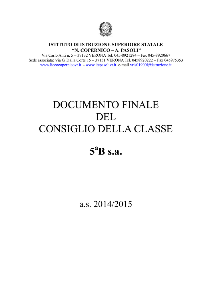 ISTITUTO DI ISTRUZIONE SUPERIORE STATALE “N. COPERNICO – A. PASOLI” Via Carlo Anti n. 5 – 37132 VERONA Tel. 045-8921284 – Fax 045-8920667 Sede associata: Via G. Dalla Corte 15 – 37131 VERONA Tel. 0458920222 – Fax 045975353 www.liceocopernicovr.it - www.itcpasolivr.it e-mail [email protected] DOCUMENTO FINALE DEL CONSIGLIO DELLA CLASSE a 5 B s.a. a.s. 2014/2015 ISTITUTO DI ISTRUZIONE SUPERIORE STATALE “N. COPERNICO – A. PASOLI” anno scolastico 2014/2015 INDICE DEL DOCUMENTO CLASSE: 5 a B s.a. Coordinatore: Prof.ssa Marisa Spinelli INFORMAZIONI PRELIMINARI, COMPOSIZIONE E PRESENTAZIONE DELLA CLASSE OBIETTIVI EDUCATIVI E FORMATIVI OBIETTIVI COGNITIVI CONTENUTI, METODI, MEZZI, SPAZI E TEMPI ATTIVITÀ PARA ED EXTRACURRICOLARI CRITERI E STRUMENTI DI VALUTAZIONE COMPOSIZIONE del Consiglio di classe pag. 1 pag. 2 pag. 2 pag. 3 pag. 3 pag. 4 pag. 5 ALLEGATO A RELAZIONI FINALI e PROGRAMMI DISCIPLINARI ITALIANO INGLESE MATEMATICA FISICA STORIA FILOSOFIA INFORMATICA SCIENZE NATURALI DISEGNO E STORIA DELL’ARTE SCIENZE MOTORIE RELIGIONE pag. 6 pag. 13 pag. 17 pag. 21 pag. 25 pag. 30 pag. 35 pag. 38 pag. 43 pag. 45 pag. 49 ALLEGATO B TESTI DELLE PROVE MULTIDISCIPLINARI pag. 52 ALLEGATO C GRIGLIA VALUTAZIONE PRIMA PROVA GRIGLIA VALUTAZIONE SECONDA PROVA GRIGLIA VALUTAZIONE TERZA PROVA pag. 55 pag. 56 pag. 57 Classe 5a B s.a. IISS COPERNICO-PASOLI-VR _____________________________________________________________________________________ ISTITUTO DI ISTRUZIONE SUPERIORE STATALE “N. COPERNICO – A. PASOLI” anno scolastico 2014/2015 DOCUMENTO DEL CONSIGLIO DELLA CLASSE 5a B Liceo Scientifico indirizzo scienze applicate PREMESSA: INFORMAZIONI PRELIMINARI Il percorso didattico educativo, definito nella programmazione di inizio anno, ha fatto riferimento agli obiettivi fissati dal P.O.F. e fatti propri dal Consiglio di classe. In particolare: sono state esaminate le situazioni di partenza degli alunni si è posta prioritaria importanza all’acquisizione da parte degli allievi delle competenze definite nella programmazione didattica delle singole discipline; gli interventi didattici sono stati attuati in modo da stimolare un impegno di studio serio, approfondito e critico in relazione alle specifiche caratteristiche intellettuali di ciascuno. Il documento, nella sua veste generale, presenta in forma articolata obiettivi, metodi, strumenti, spazi, tempi e tematiche dell'azione didattica, nonché risultati mediamente raggiunti dalla classe. Al documento, quali parti integranti, sono allegate le relazioni dei singoli docenti con i programmi svolti nel corso dell'anno (All. A), i testi delle prove multidisciplinari (All. B) e le griglie di valutazione delle prove scritte (All. C) PRESENTAZIONE SINTETICA DELLA CLASSE a) Notizie relative alla composizione della classe L’attuale classe VB, indirizzo scienze applicate, è stata caratterizzata da un percorso abbastanza irregolare, nel senso che nel corso dei cinque anni ci sono stati diversi alunni non ammessi alle classi successive (soprattutto nel biennio), sono stati inseriti alunni provenienti da altre classi e da altre scuole (soprattutto nel triennio), si sono avvicendati docenti in diverse discipline e questo anche nell’ultimo anno. Infatti, la classe VB, inizialmente composta da 28 alunni, si presenta composta da 24 alunni in seconda (tre non ammessi, uno che non si è presentato a settembre agli esami); durante il secondo anno una ragazza si trasferisce all’estero e a fine anno un ragazzo non è stato ammesso alla classe successiva. Ma all’inizio della terza si aggiungono due alunni, uno proveniente dall’indirizzo ordinario del nostro liceo ed uno proveniente da un istituto tecnico, la classe rimane così invariata nei numeri: 24 alunni. Durante la terza due alunni cambiano istituto ed uno risulta non ammesso a fine anno. In quarta, invece, un alunno studia all’estero, in Svezia, ed una alunna viene inserita nella classe. La classe quarta risulta in definitiva composta da 21 alunni dei quali a fine anno cinque avranno il giudizio sospeso, ma saranno poi tutti promossi alla classe successiva. All’inizio della quinta rientra l’alunno che ha studiato all’estero; quindi quest’anno la classe è formata da 22 alunni, di cui sei femmine. Nella classe è presente un alunno con Piano Didattico Personalizzato. b) Continuità didattica dei docenti Solo la coordinatrice e i docenti di scienze, scienze motorie e religione sono rimasti invariati nel corso del quinquennio e la docente di italiano nel triennio. Tra la prima e la seconda classe sono cambiati i docenti di informatica, italiano, storia e geografia, ma i maggiori cambiamenti sono avvenuti nel triennio, infatti all’inizio della terza ben cinque docenti cambiati rispetto all’anno precedente (italiano, storia e filosofia, informatica, inglese e fisica) ed, in particolare, sia per inglese che per fisica si sono avvicendati durante l’anno più supplenti. Anche in quarta sono cambiati i docenti di storia, informatica, fisica ed inglese. In quinta sono stati sostituiti, con gli attuali, i docenti di inglese, storia e filosofia, fisica ed arte. Quindi nel corso del triennio molte materie hanno avuto docenti diversi, in particolare inglese, fisica, informatica, storia e filosofia. c) Risultati scolastici del gruppo classe La classe si è dimostrata nell’arco del triennio, al di là delle differenze individuali e delle inevitabili oscillazioni, complessivamente motivata ed interessata alle proposte didattiche e al dialogo educativo. Riguardo al profitto la classe evidenzia una fisionomia ben definita che vede un piccolo gruppo 1 Classe 5a B s.a. IISS COPERNICO-PASOLI-VR _____________________________________________________________________________________ distinguersi nettamente da un nutrito numero di allievi che ha ottenuto risultati accettabili in quasi tutte le discipline, in ogni caso ciascun alunno ha realizzato un progresso rispetto alla situazione di partenza. I r