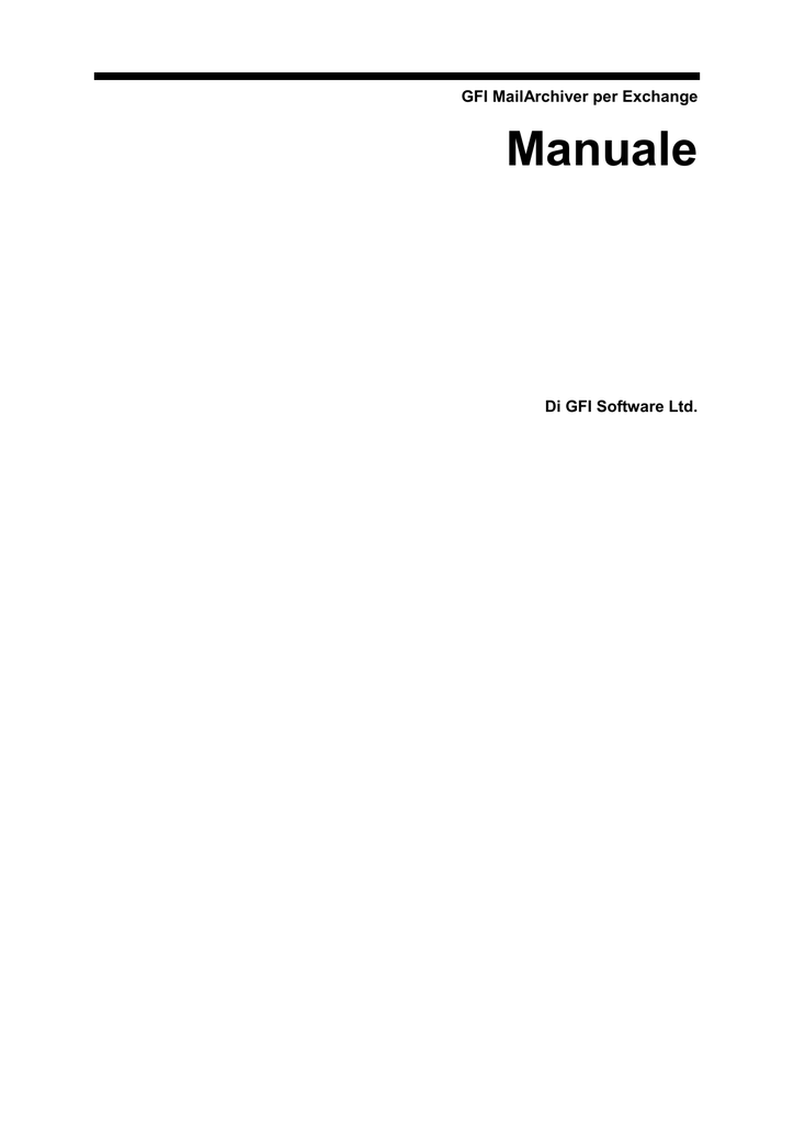 GFI MailArchiver per Exchange Manuale Di GFI Software Ltd. http://www.gfi.com Posta elettronica: [email protected] Le informazioni contenute nel presente documento sono soggette a modifiche senza preavviso. Le società, i nomi e i dati utilizzati negli esempi sono fittizi se non diversamente specificato. Il presente documento non può essere riprodotto o trasmesso neanche parzialmente, in alcuna forma o con alcun mezzo (elettronico o meccanico) per qualsivoglia scopo, senza l'autorizzazione scritta di GFI Software Ltd. GFI MailArchiver è copyright di GFI SOFTWARE Ltd. © 1999-2010 GFI Software Ltd. Tutti i diritti riservati. Versione: MAR-ACM-1-03 Ultimo aggiornamento: 31 maggio 2010 Build di GFI MailArchiver: 20100315 Sommario 1. Informazioni su GFI MailArchiver 1.1 1.2 1.3 1.4 1 Introduzione a GFI MailArchiver........................................................................... 1 Funzionamento di GFI MailArchiver..................................................................... 1 Licenze di GFI MailArchiver ................................................................................. 2 Pagina di riepilogo di GFI MailArchiver ................................................................ 2 2. Utilizzo di GFI MailArchiver 5 2.1 Caricamento di GFI MailArchiver ......................................................................... 5 2.2 Visualizzazione dei messaggi di posta elettronica archiviati ............................... 6 2.3 Visualizzazione dei messaggi di posta elettronica di altri utenti ........................ 10 2.4 Visualizzazione dei messaggi di posta elettronica inclusi in diverse cassette postali degli utenti.......................................................................................... 11 2.5 Ricerche negli archivi di posta elettronica.......................................................... 12 2.6 Creazione e utilizzo delle cartelle di ricerca....................................................... 19 2.7 Modifica della lingua........................................................................................... 22 2.8 Accesso come altro utente................................................................................. 24 2.9 Disconnessione da GFI MailArchiver ................................................................. 24 3. Importazione ed esportazione di messaggi di posta elettronica 25 3.1 Importazione di messaggi di posta elettronica dalle cassette postali di Microsoft Exchange...................................................................................................... 25 3.2 Importare messaggi di posta elettronica da file PST in locale ........................... 39 3.3 Importare messaggi di posta elettronica da file PST nella rete ......................... 50 3.4 Importare messaggi di posta elettronica da GFI MailArchiver 2 ........................ 67 3.5 Importare messaggi di posta elettronica da GFI MailEssentials........................ 75 3.6 Esportazione di messaggi di posta elettronica utilizzando lo strumento Bulk Export................................................................................................................... 83 4. Connettore Outlook 95 4.1 Funzionamento del Connettore Outlook di GFI MailArchiver ............................ 95 4.2 Download del connettore Outlook di GFI MailArchiver ...................................... 95 4.3 Requisiti di sistema ............................................................................................ 96 4.4 Installazione tramite gli Oggetti Criteri di gruppo ............................................... 97 4.5 Installazione senza Oggetti Criteri di gruppo, ossia tramite installazione manuale ..................................................................................................................... 102 5. Infrastruttura di database e archivi 105 5.1 Configurazione delle opzioni di archiviazione e di esclusione utente .............. 105 5.2 Configurazione dei server di posta per l'archiviazione..................................... 106 5.3 Riconfigurazione di un server di posta ............................................................. 109 5.4 Rimozione di un server di posta....................................................................... 110 5.5 Configurazione dei database ........................................................................... 110 5.6 Configurazione degli archivi ............................................................................. 113 5.7 Selezione di un archivio in cui memorizzare i messaggi di posta elettronica................................................................................................................... 131 5.8 Configurazione degli archivi in cui è possibile selezionare e ricercare messaggi.................................................................................................................... 132 5.9 Gestione degli archivi....................................................................................... 132 GFI MailArchiver per Exchange - Manuale Sommario i 5.10 5.11 5.12 5.13 5.14 5.15 5.16 5.17 altro Collegamento di un database di GFI MailArchiver 3........................................ 135 Visualizzazione delle statistiche dell'archivio ................................................... 139 Riconfigurazione di un archivio ........................................................................ 140 Rimozione di un archivio .................................................................................. 141 Archivi di backup .............................................................................................. 141 Gestione degli indici di ricerca ......................................................................... 147 Aggiornamento dello schema del data base.................................................... 151 Spostamento dei messaggi di posta elettronica da un data base a un 151 6. Controllo accesso e verifica 159 6.1 Configurazi