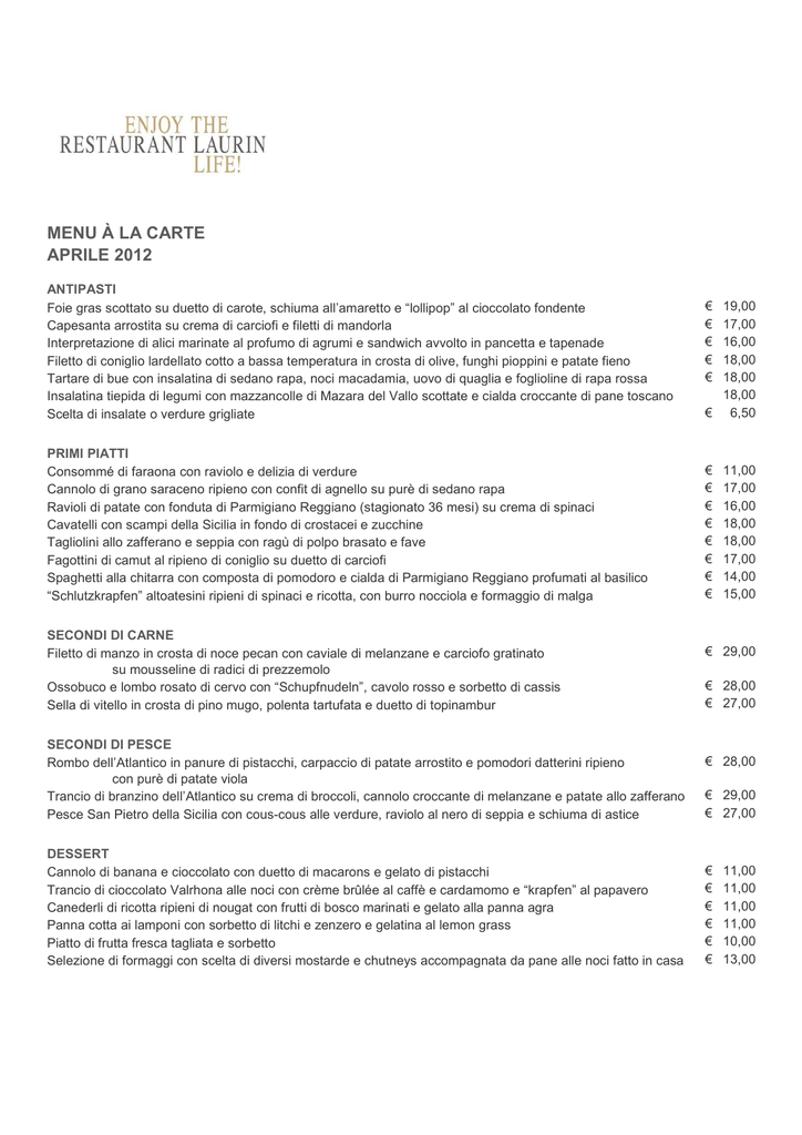 MENU À LA CARTE APRILE 2012 ANTIPASTI Foie gras scottato su duetto di carote, schiuma all’amaretto e “lollipop” al cioccolato fondente Capesanta arrostita su crema di carciofi e filetti di mandorla Interpretazione di alici marinate al profumo di agrumi e sandwich avvolto in pancetta e tapenade Filetto di coniglio lardellato cotto a bassa temperatura in crosta di olive, funghi pioppini e patate fieno Tartare di bue con insalatina di sedano rapa, noci macadamia, uovo di quaglia e foglioline di rapa rossa Insalatina tiepida di legumi con mazzancolle di Mazara del Vallo scottate e cialda croccante di pane toscano Scelta di insalate o verdure grigliate PRIMI PIATTI Consommé di faraona con raviolo e delizia di verdure Cannolo di grano saraceno ripieno con confit di agnello su purè di sedano rapa Ravioli di patate con fonduta di Parmigiano Reggiano (stagionato 36 mesi) su crema di spinaci Cavatelli con scampi della Sicilia in fondo di crostacei e zucchine Tagliolini allo zafferano e seppia con ragù di polpo brasato e fave Fagottini di camut al ripieno di coniglio su duetto di carciofi Spaghetti alla chitarra con composta di pomodoro e cialda di Parmigiano Reggiano profumati al basilico “Schlutzkrapfen” altoatesini ripieni di spinaci e ricotta, con burro nocciola e formaggio di malga SECONDI DI CARNE Filetto di manzo in crosta di noce pecan con caviale di melanzane e carciofo gratinato su mousseline di radici di prezzemolo Ossobuco e lombo rosato di cervo con “Schupfnudeln”, cavolo rosso e sorbetto di cassis Sella di vitello in crosta di pino mugo, polenta tartufata e duetto di topinambur € € € € € 19,00 17,00 16,00 18,00 18,00 18,00 € 6,50 € € € € € € € € 11,00 17,00 16,00 18,00 18,00 17,00 14,00 15,00 € 29,00 € 28,00 € 27,00 SECONDI DI PESCE Rombo dell’Atlantico in panure di pistacchi, carpaccio di patate arrostito e pomodori datterini ripieno con purè di patate viola Trancio di branzino dell’Atlantico su crema di broccoli, cannolo croccante di melanzane e patate allo zafferano Pesce San Pietro della Sicilia con cous-cous alle verdure, raviolo al nero di seppia e schiuma di astice € 29,00 € 27,00 DESSERT Cannolo di banana e cioccolato con duetto di macarons e gelato di pistacchi Trancio di cioccolato Valrhona alle noci con crème brûlée al caffè e cardamomo e “krapfen” al papavero Canederli di ricotta ripieni di nougat con frutti di bosco marinati e gelato alla panna agra Panna cotta ai lamponi con sorbetto di litchi e zenzero e gelatina al lemon grass Piatto di frutta fresca tagliata e sorbetto Selezione di formaggi con scelta di diversi mostarde e chutneys accompagnata da pane alle noci fatto in casa € € € € € € € 28,00 11,00 11,00 11,00 11,00 10,00 13,00