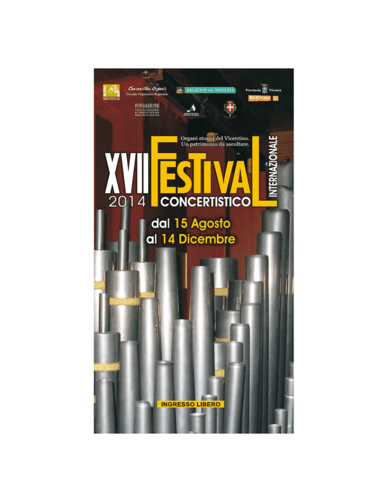 Ministero per i Beni e le Attività Culturali Regione del Veneto Provincia di Vicenza - Reteventi Comune di Vicenza Asolo Musica - Veneto Musica Vicenza è A.S.A.C. Consulta Provinciale di Vicenza Conservatorio di Musica di Vicenza “A. Pedrollo” Associazione Musicale Archicembalo Ensemble Ufficio Diocesano Beni Culturali. in collaborazione con i Comuni di: Altavilla Vicentina, Bassano del Grappa, Brogliano, Campiglia dei Berici, Crespadoro, Fontaniva, Grancona, Marostica, Monteviale, Schio, Thiene, Vicenza. Pro Loco: Caldogno, Cittadella, Crespadoro, Fontaniva, il Comitato di Quartiere di S. Eusebio, Torri di Quartesolo. Banche e aziende: Banca Credito Cooperativo di: Campiglia dei Berici San Giorgio Quinto Valle Agno (Filiale di Molvena), Banca Alto Vicentino, Banca Popolare di Verona, Cassa Rurale ed Artigiana di Brendola, Bedin, Busato, CLM Illuminazione, Lamec, La Meccanica, Radio Oreb, TM Sommaggio SRL, TECNEW, Zilio gruppo ELT. 1 PRESENTAZIONE Il Festival concertistico sugli organi storici del vicentino giunge quest’anno alla diciassettesima edizione. Il territorio di Vicenza può vantarsi di circa un centinaio di strumenti storici, di cui sessanta restaurati e attivi. Il loro costante utilizzo nella liturgia, per l’accompagnamento o in veste solistica, ha contribuito a conservare gli organi storici nelle migliori condizioni, suscitando volontà e nuove energie per iniziative di restauro e conservazione. La nostra provincia dimostra una particolare sensibilità ai concerti organistici: la presenza di oltre cento cori, nel territorio vicentino garantisce un terreno particolarmente ricettivo per le proposte concertistiche all'organo. Ecco perché, all’interno del festival concertistico, il programma solistico all’organo è spesso alternato all’intervento vocale e/o corale. È una felice coincidenza che il territorio vicentino, così ricco di strumenti storici, sia anche la culla che ha formato i gruppi corali fra i più apprezzati in ambito nazionale ed europeo. Promuovere la cultura in questo contesto economico è molto impegnativo, tuttavia, non si può non notare un maggiore interesse e un ritrovato gusto per la Cultura. Un rinnovato desiderio del Bello: questo è forse il regalo più grande che ci può fare, paradossalmente, l’attuale crisi economica. La Musica, in particolare, crea legami inediti, unisce idiomi differenti, è una via privilegiata per la crescita dell’Individuo. Ecco perché il nostro sforzo continua con rinnovato entusiasmo, proponendo una rassegna di alto profilo artistico, consapevoli che investire sulla Cultura significa investire sul nostro futuro. Le novità di quest’anno: inediti ensemble strumentali faranno dialogare l’organo con il pianoforte e con il saxofono. Verrà, inoltre, dedicato, un concerto alla figura di Arrigo Pedrollo, nel 50° anniversario della morte: 2 appuntamento che conferma la proficua sinergia musicale con il Conservatorio cittadino, intitolato al musicista vicentino. Il festival si arricchisce di incisioni discografiche: verrà presentato un nuovo Cd durante il concerto presso la parrocchiale di Quinto Vicentino. Altra novità del festival: la piccola parrocchia di Colzè avrà finalmente il suo strumento storico restaurato e riportato alle antiche sonorità. Un sentito ringraziamento agli Enti e Associazioni che hanno collaborato alla realizzazione di questo festival e alle parrocchie che ospiteranno i concerti. Enrico Zanovello Direttore Artistico 3 CALENDARIO N.32 CONCERTI (N.1) Venerdì 15 agosto Marana di Crespadoro • ore 20:45 Chiesa Parrocchiale • Organo G. B. Zordan 1879 DUO VIMARIS (Germania) MIRJAM MEINHOLD • Soprano e flauto WIELAND MEINHOLD • Organo (N.2) Domenica 7 settembre S. Ulderico di Tretto - Schio • ore 16:45 Chiesa Parrocchiale • Organo Bonatti(1738) -Zordan (1874) MARCO RUGGERI • Organo (N.3) Domenica 14 settembre Pieve di S. Eusebio di Bassano del Grappa • ore 18:00 Organo Anonimo Veneto ‘700 Coro GIOVANIGES DI SCHIO Direttore STEFANIA LANARO MARIO CIFERRI • Organo (N.4) Venerdì 19 settembre Vicenza, San Marco • ore 20:45 Chiesa Parrocchiale di San Marco • Organo A. Pugina 1901 VOVKA ASHKENAZY (Russia) • Pianoforte GIULIO MERCATI • Organo (N.5) Domenica 21 settembre Longare • ore 18:00 Chiesa Parrocchiale • Organo De Lorenzi 1850 GRUPPO VOCALE NOVECENTO Direttore MAURIZIO SAQUEGNA CARLO BARBIERATO • Organo (N.6) Domenica 21 settembre Rozzampia di Thiene • ore 18:00 Chiesa Parrocchiale • Organo Serassi 1870 Coro GRUPPO VOCALE BEQUADRO Direttore GIUSEPPE MANZINI FABIO MACERA • Organo 4 (N.7) Venerdì 26 settembre Vicenza • ore 20:45 Chiesa di S. Paolo • Organo Mascioni nel 1992 PIER DAMIANO PERETTI (Vienna) e MASSIMILIANO RASCHIETTI • Organo PIERO RAFFAELLI • Violino (N.8) Domenica 28 settembre Altavilla Vicentina • ore 17:00 Chiesa Parrocchiale • Organo Zordan 1871 - R. Zarantonello 1956 Coro “LA GIOVENTÙ IN CANTATA” Direttore CINZIA ZANON GAIL ARCHER (Stati Uniti) • Organo (N.9) Lunedì 29 settembre Vicenza • ore 20:45 Chiesa di S. Michele ai Servi • Organo A. Zeni 2000 GAIL ARCHER (Stati Uniti) • Organo (N.10) Venerdì 3 ottobre Grancona • ore 20:45 Chiesa Parrocchiale • Organo F.lli Zordan 1897 Orchestra d’archi ENSEMBLE EUTERPE Direttore STEFANO ANTONELLO LUCIANO ZECCA • Organo (N.11) Sabato 4 ottobre Castegnero • ore 20:45 Chiesa Parrocchiale • Organo R. Zordan 1894 Coro Polifonico “FRA MATTEO” Direttore ROBERTO REVRENNA PIETRO TAGLIAFERRI • Saxofono STEFANO PELLINI • Organo (N.12) Sabato 4 ottobre Vicenza, Tempio di Santa Corona • ore 20:45 Organo De Lorenzi del 1856 Coro “MORTALISATIS” Direttore ALESSANDRO KIRSCHNER ALBERTO GUERZONI • Organo 5 (N.13) Venerdì 10 ottobre Rettorgole di Caldogno • ore 20:45 Chiesa Parrocchiale • Organo D. Kleuker 1962 CHIARA MOLINARI • Soprano MICHELE SANTI • Tromba WLADIMIR MATESIC • Organo e la partecipazione del CORO MAGNIFICAT (N.14) Sabato 11 ott